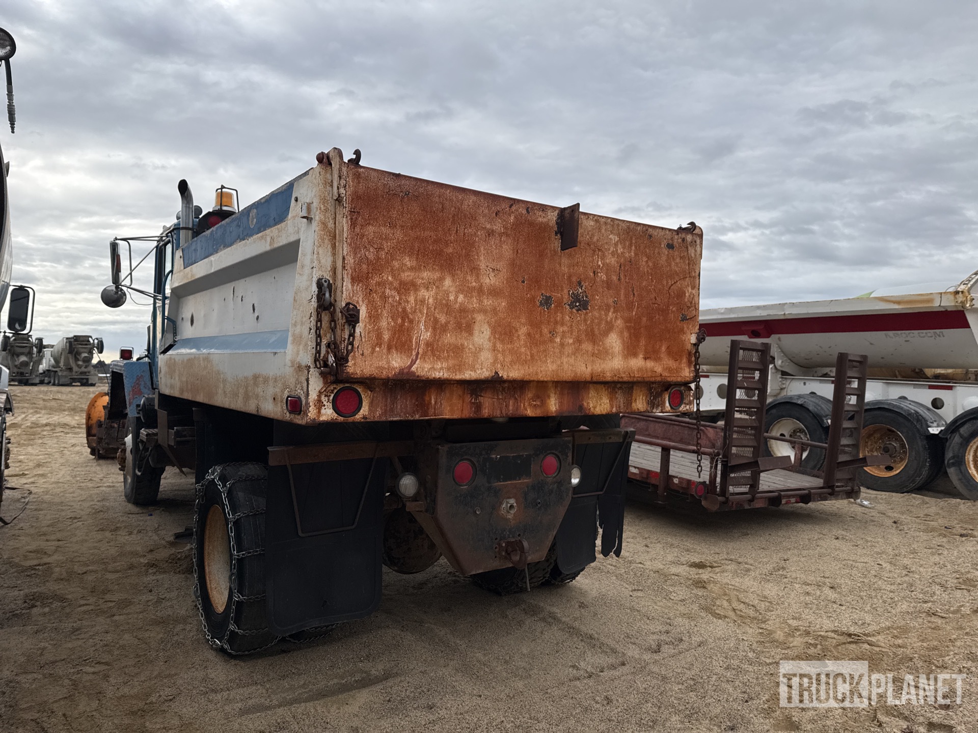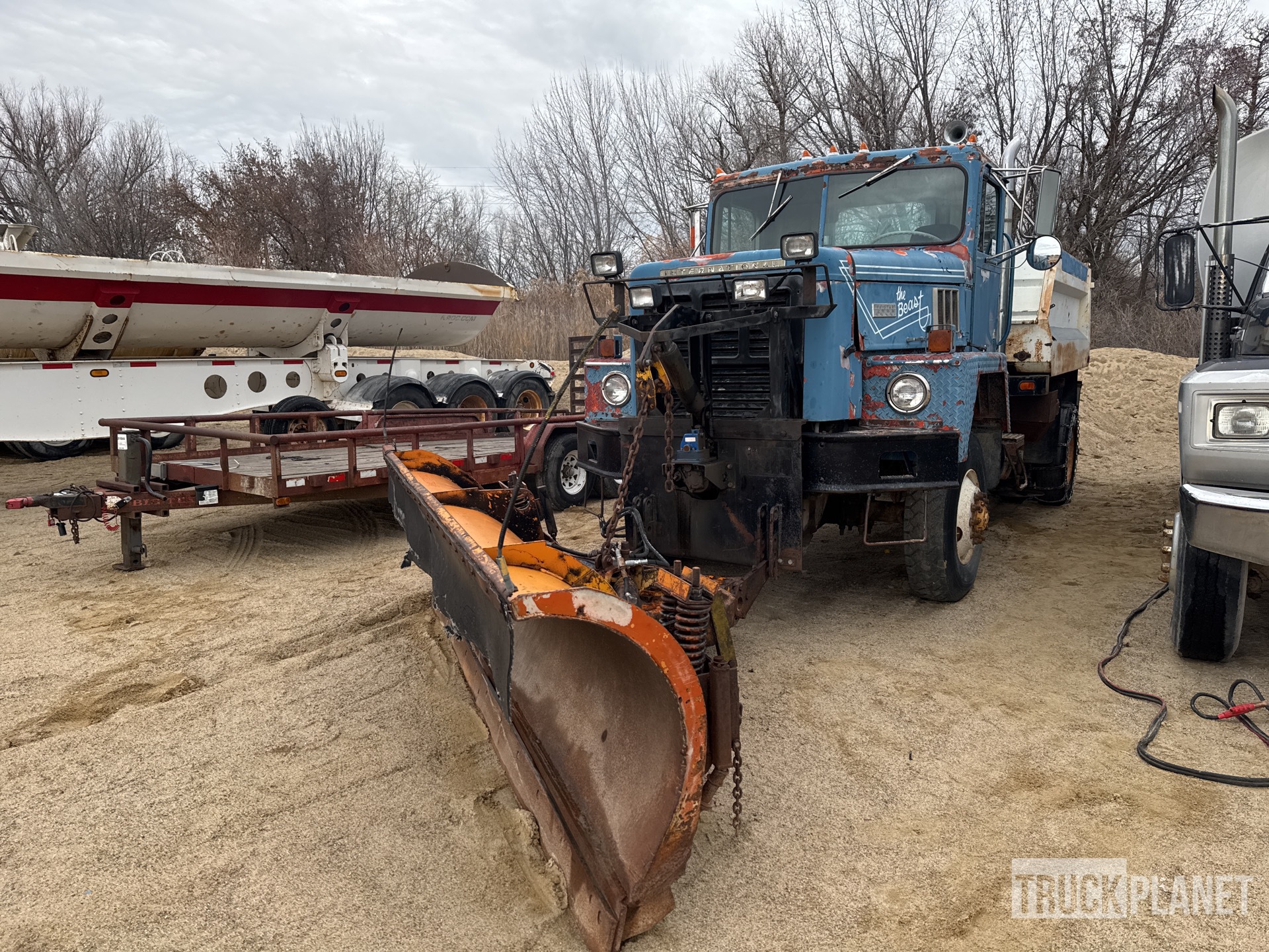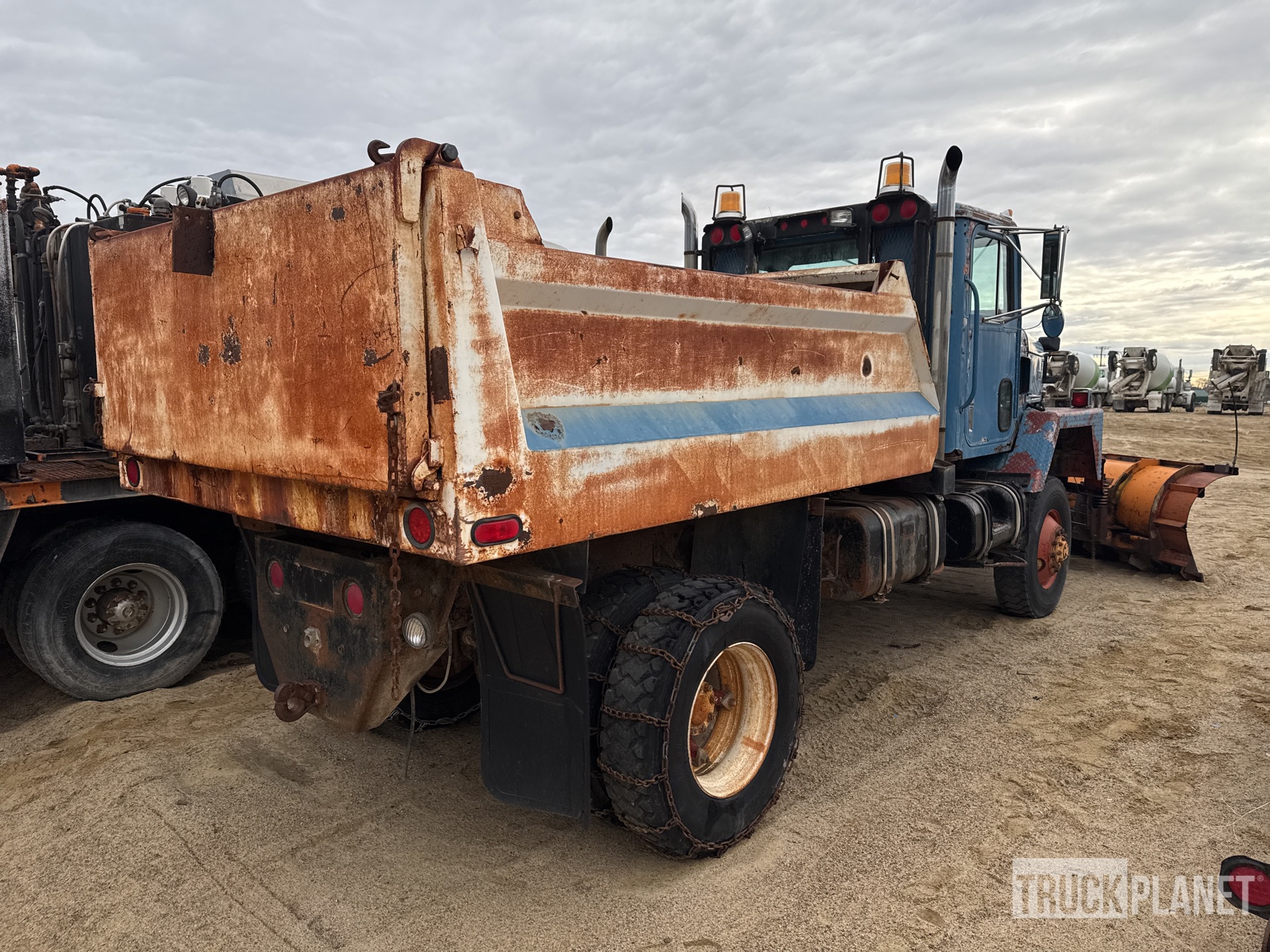 Cat 3208 V8 Diesel Engine, 8543.6 Engine hrs, Automatic Transmission, 12R22.5 Front Tires, 11R22.5 Rear Tires, Spring Suspension, 162 in Wheelbase, PTO, 2-Way Plow, Steel Spreader, 1 Spinners, 10 ft 6 in Long x 35 in High Steel Body, Pintle Hitch