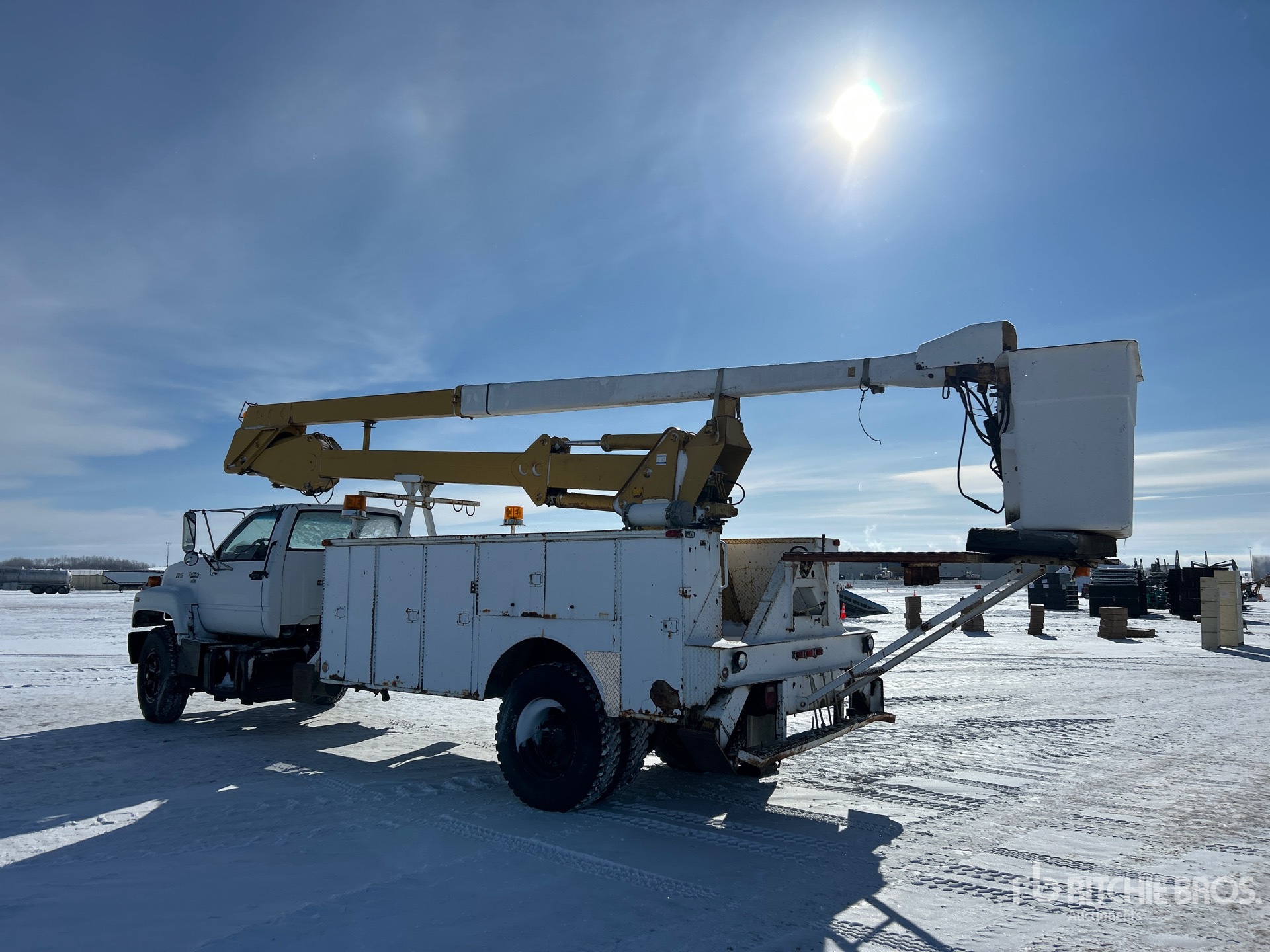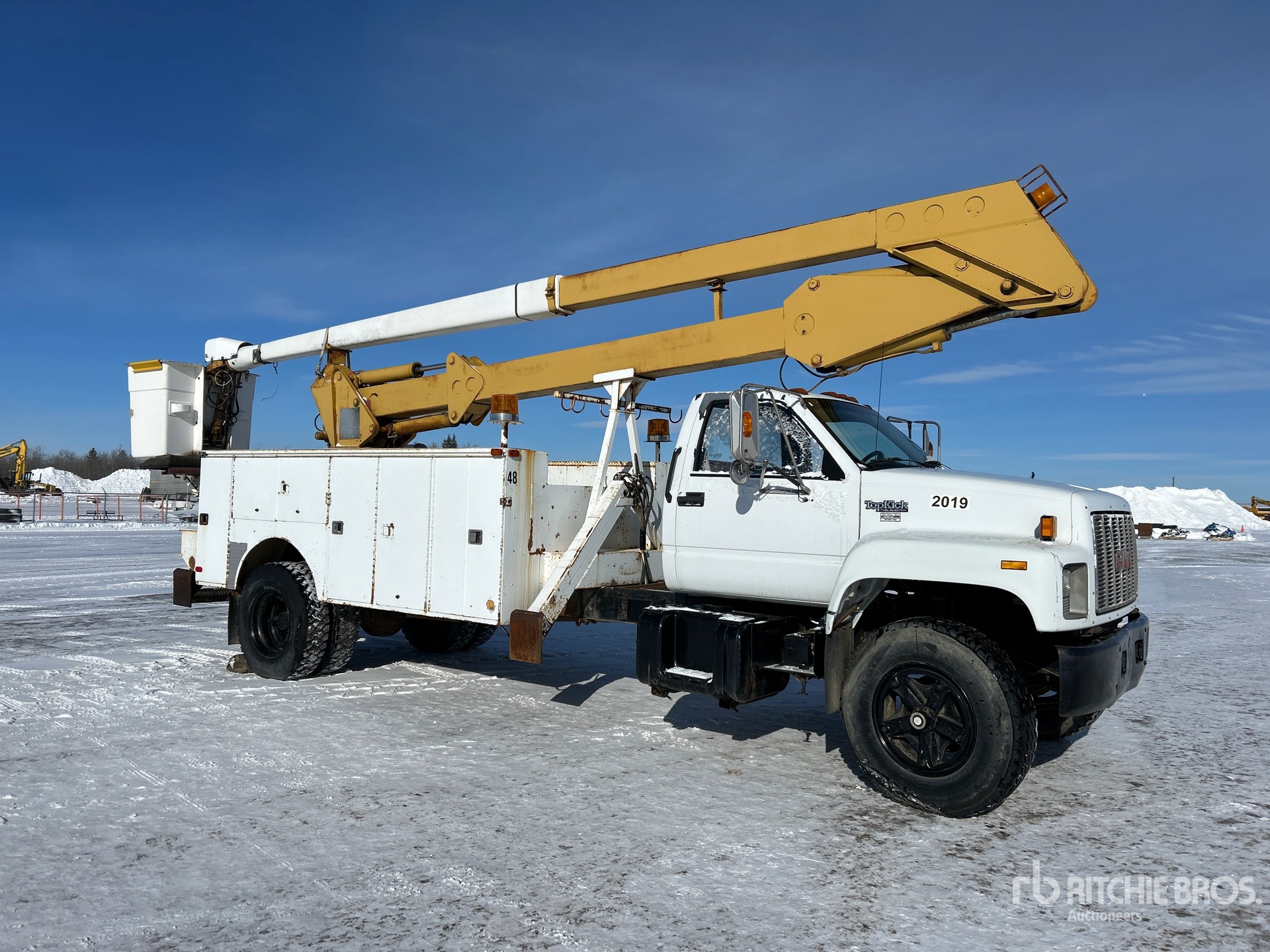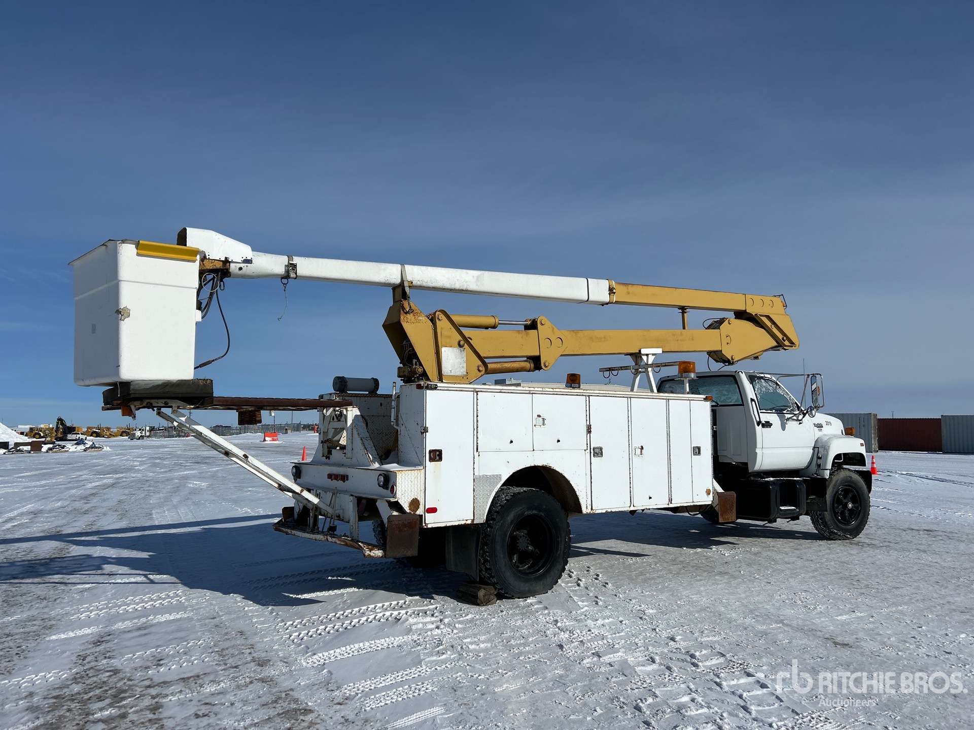 Located in Lane 7, GMC V8 6 L Gasoline Engine, Manual Transmission, 4536 kg Front Axle, 8618 kg Rears, 29000 lb GVWR, 11R22.5 Front Tires, 11R22.5 Rear Tires, Spring Suspension, 229 in Wheelbase, PTO, Rear Mounted, Two-Person Articulated Boom, Utility Body, A-Outriggers, Rear Outriggers, x 57 in Bed