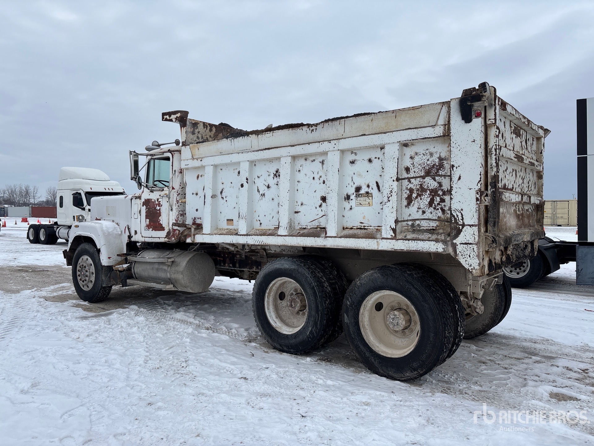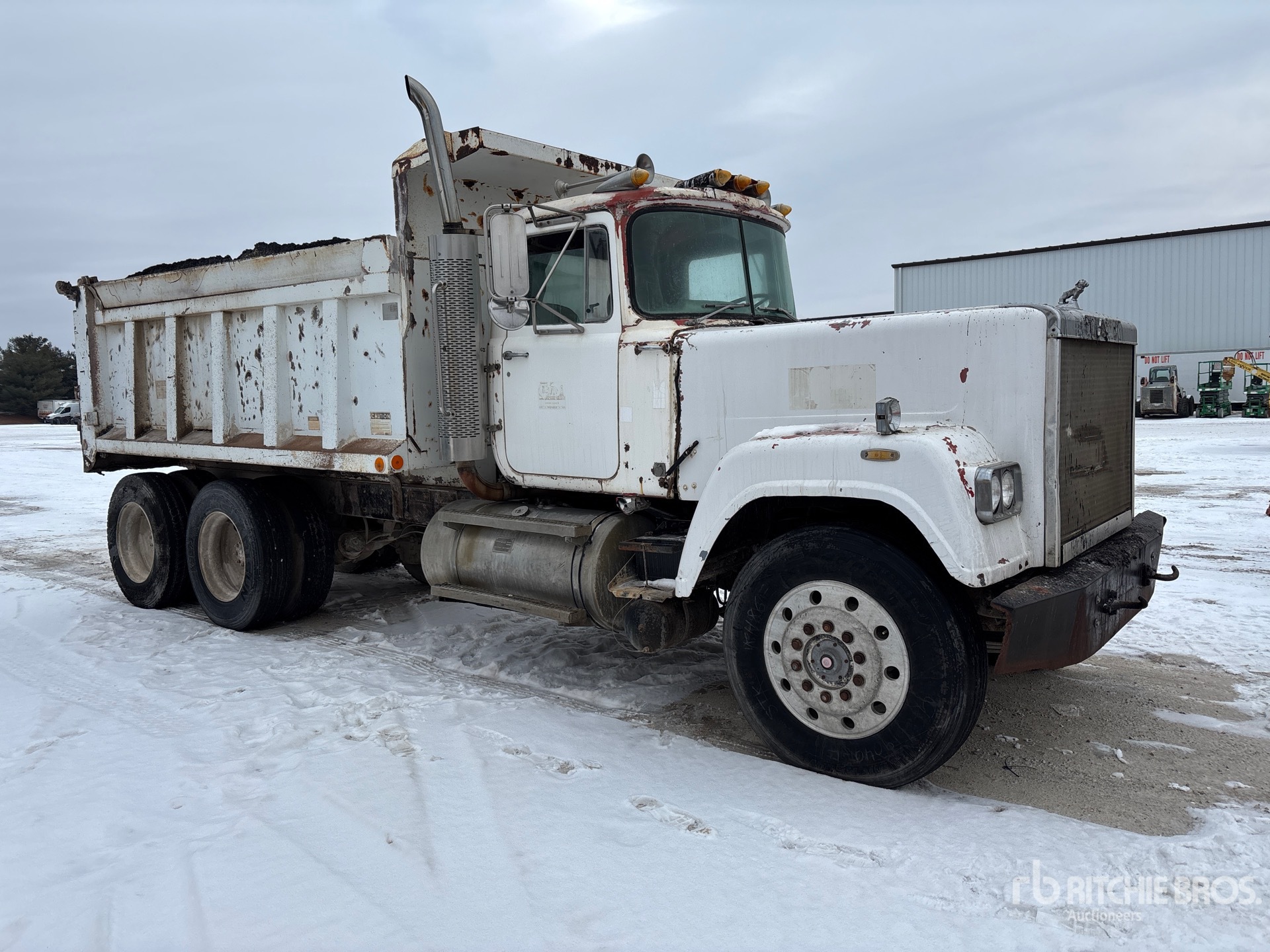 Mack 6 Cylinder Diesel Engine, 6658 Engine hrs, Manual Transmission, Aluminum Front Wheels, 11R24.5 Front Tires, 11R24.5 Rear Tires, Camelback Suspension, 214 in Wheelbase, PTO, Peabody Galion 13 ft 5 in Long x 4 ft High Steel Body