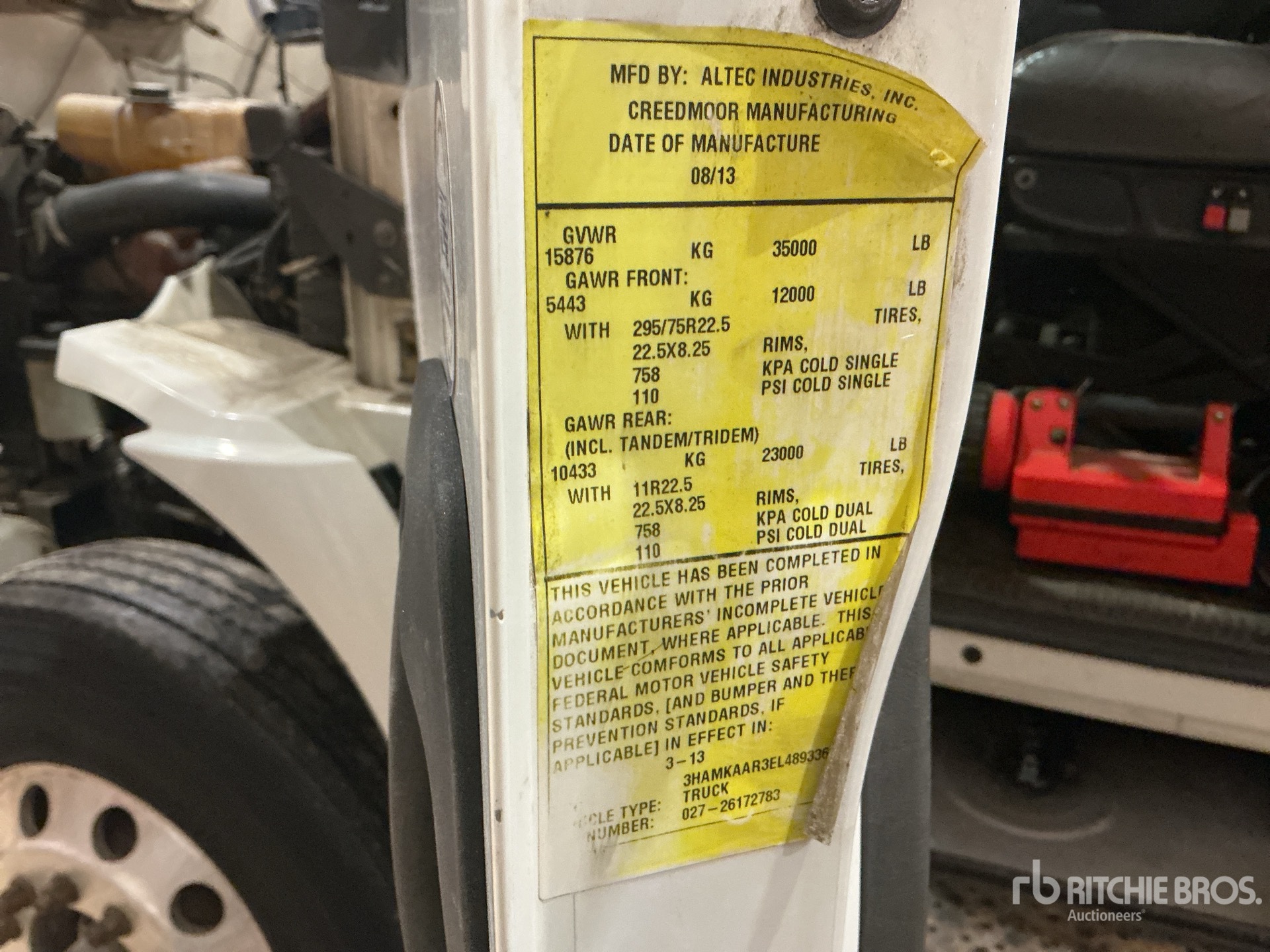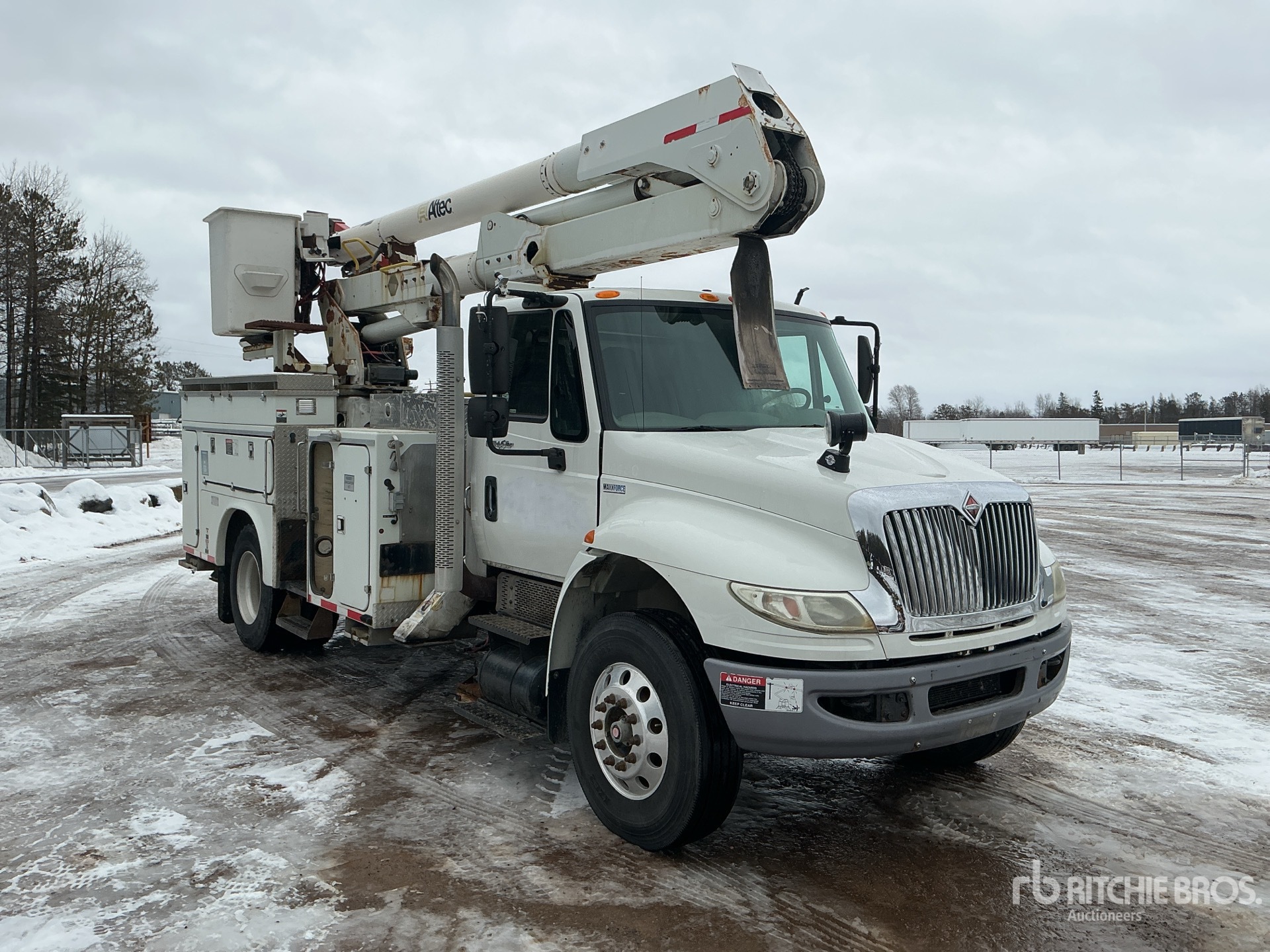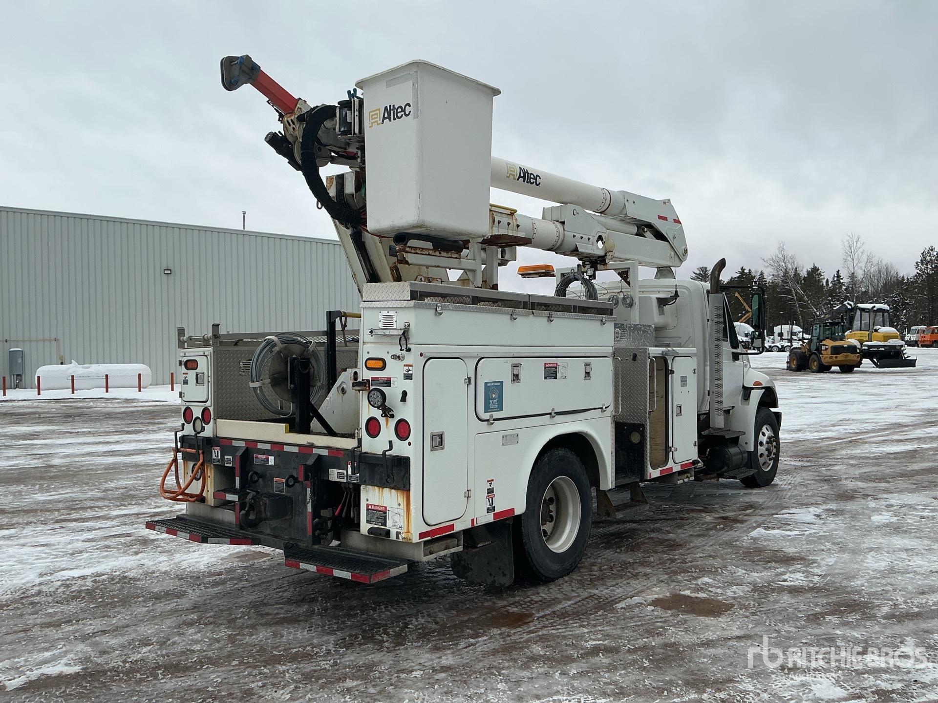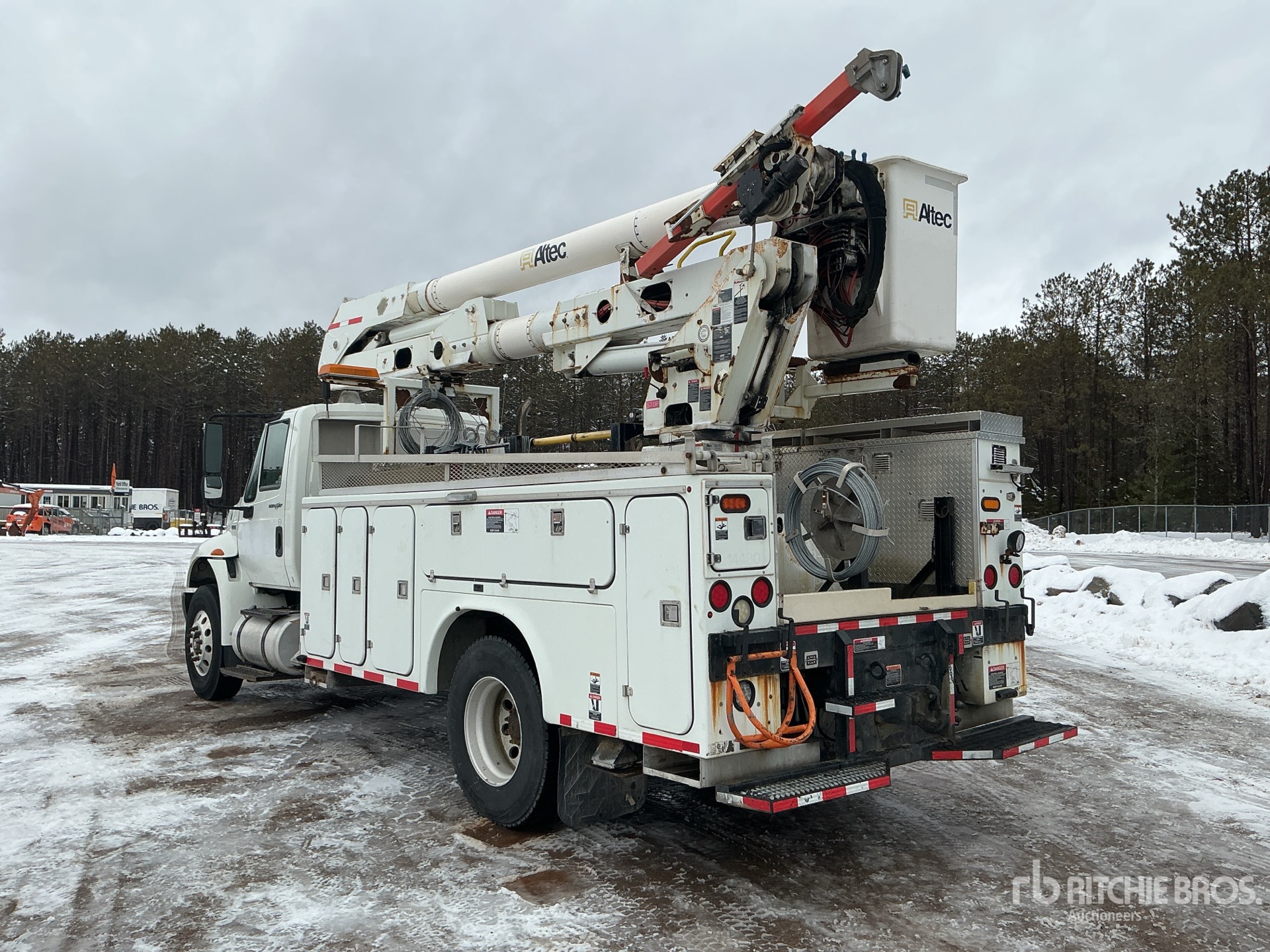 Located in Lane 6 Spot 2, Maxxforce 6 Cylinder 7.6 L Diesel 270 hp Engine, 2013 US EPA Label, CARB Compliant, 6062 Engine hrs, Allison Automated Transmission, 12000 lb Front Axle, 23000 lb Rears, 35000 lb GVWR, Air Ride Cab, Aluminum Wheels, 11R22.5, Air Ride Suspension, 198 in Wheelbase, PTO, 400 lb Capacity, Center Mounted, Insulated One-Person Articulated Boom, Material Handling Jib, X-Type Outriggers, Rear Outriggers, 14 ft 2 in x 102 in Bed, Pintle Hitch