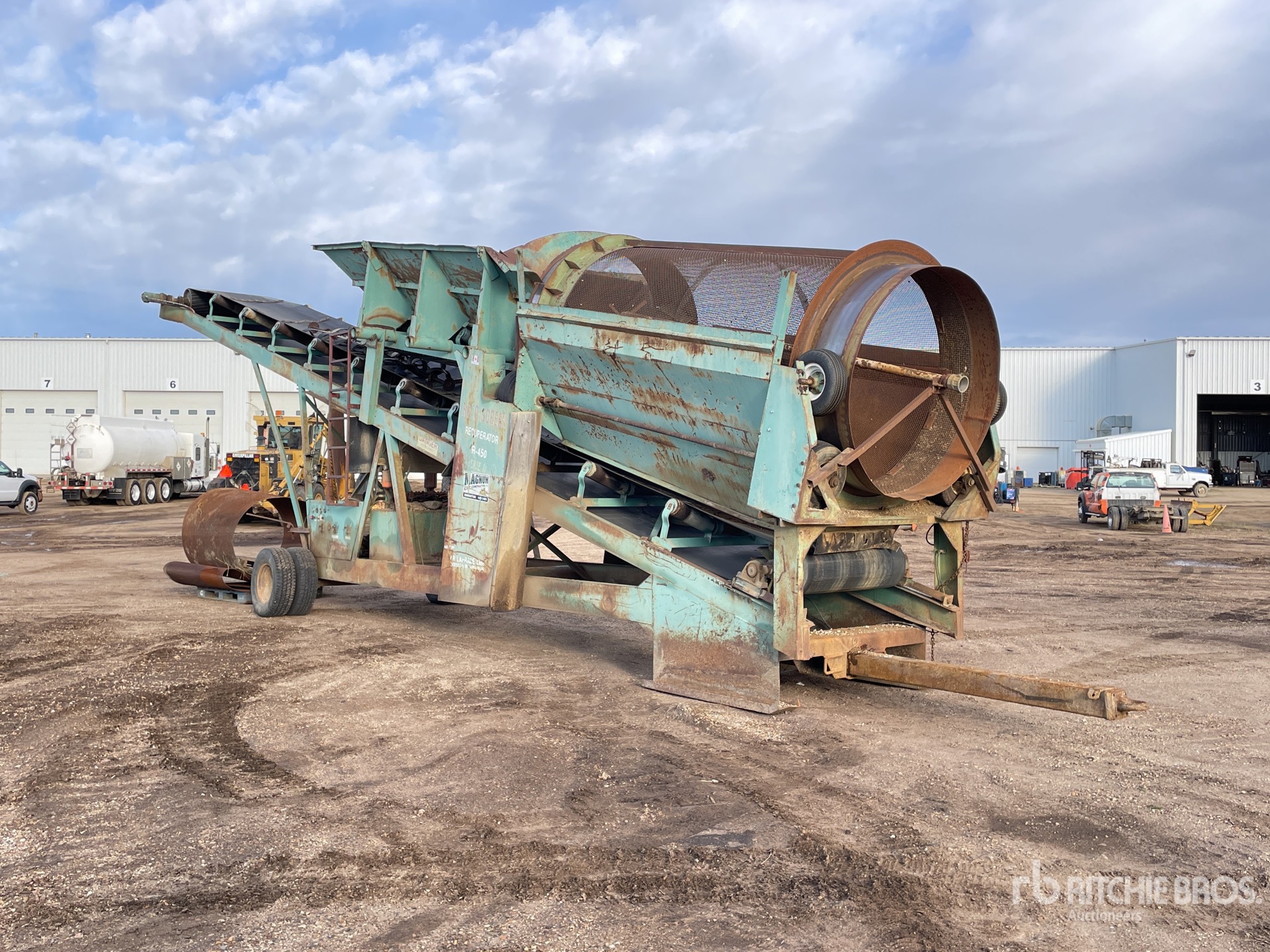 6 ft x 12 ft Apron Feeder 12 ft x 5 ft Trommel Screen, Spray/Wash System, 48 in Wide Fines Discharge Conveyor, 4 Cylinder Diesel Engine, S/A Carrier, Torsion Axle