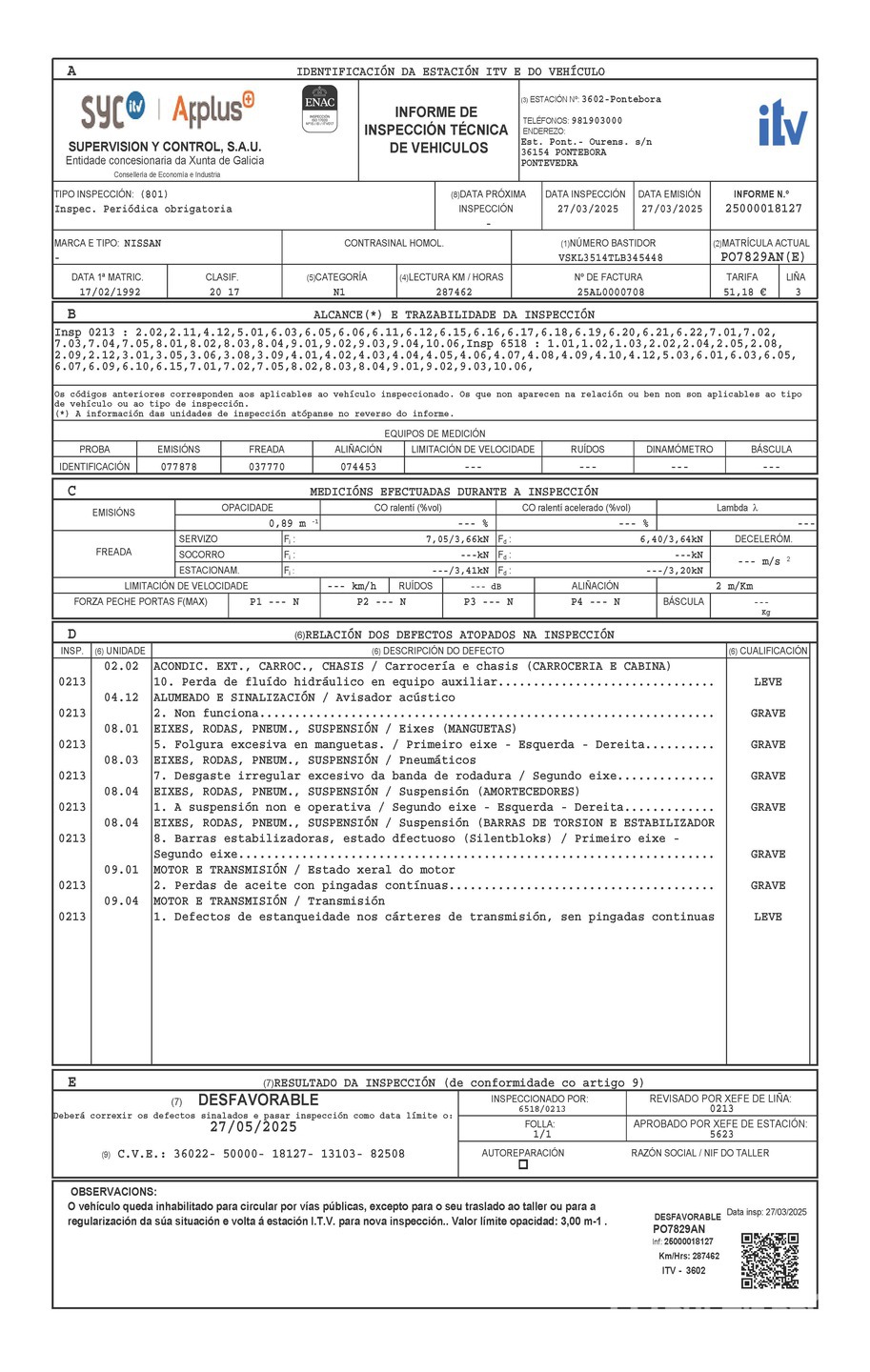Matriculado en Espana, ITV DESFAVORABLE a cuenta comprador/ Spanish Registration, ITV UNFAVORABLE on Buyers account**SOLO SE PODRA RETIRAR EL VEHICULO UNA VEZ TRAMITADO EL CAMBIO DE NOMBRE**THE VEHICLE MAY ONLY BE REMOVED ONCE THE TITLE IS CANCELED IN TRAFFIC OFFICE**ONLY FOR EUROPE MARKET, THIS LOT CAN NOT BE EXPORTED OUTSIDE OF EUROPE, for more information, please contact our office**