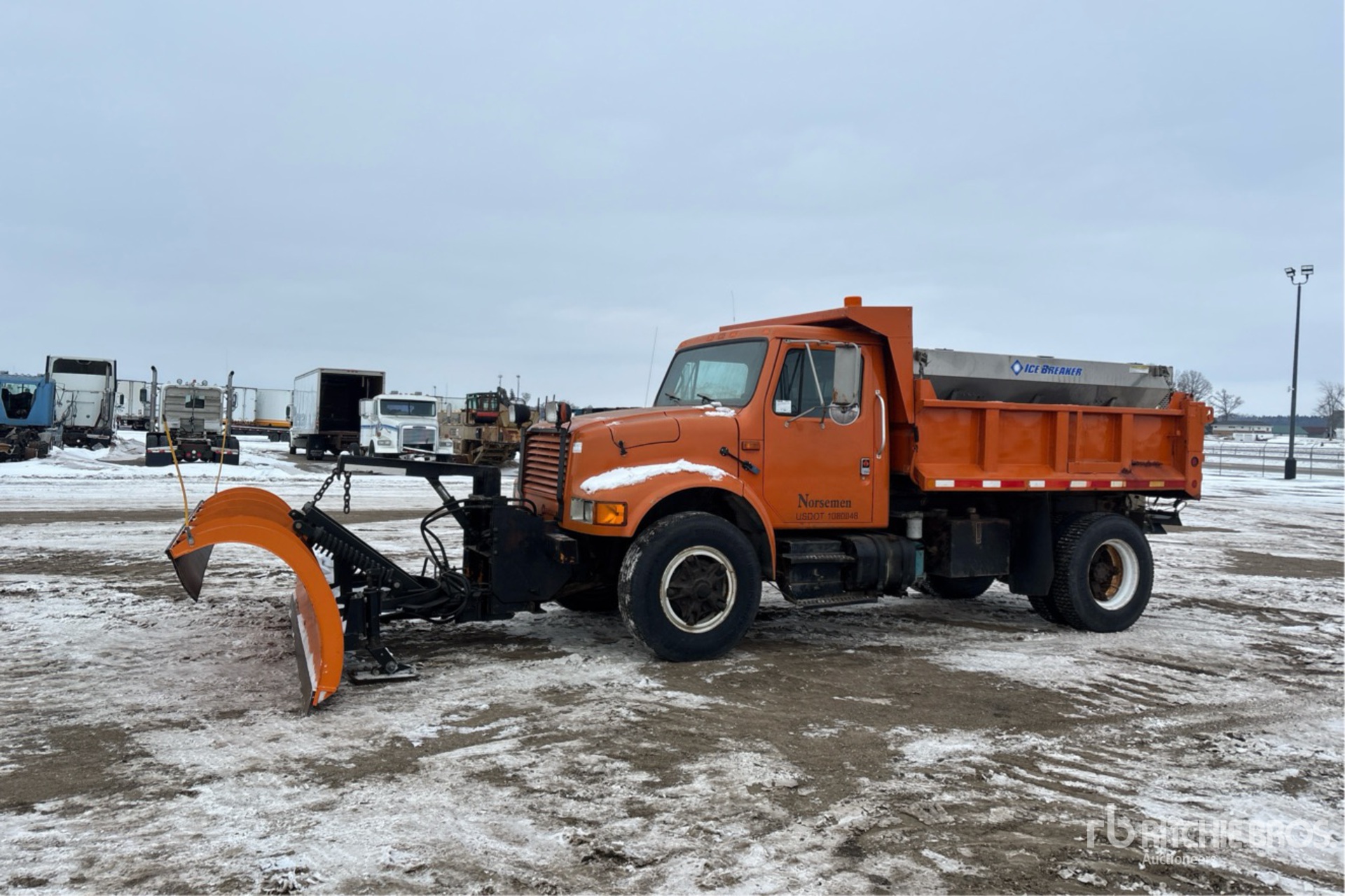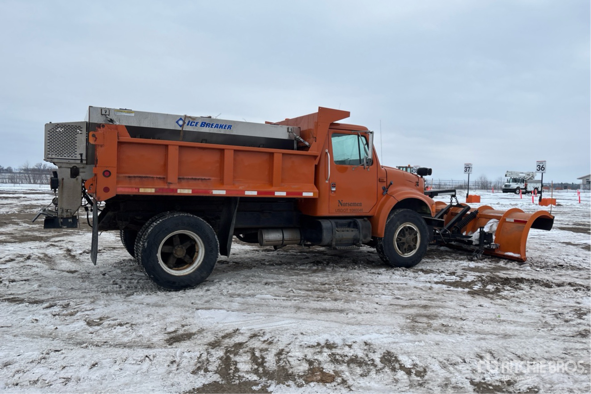 Located in Lane 6, International 6 Cylinder Diesel Engine, 7990 Engine hrs, Automatic Transmission, 11R22.5, Double Frame, Spring Suspension, 144 in Wheelbase, Monroe 11 ft 2-Way Plow, Western Stainless Steel Slide-In Spreader, 1 Spinners, In-Cab Controls, 10 ft Long x 2 ft High Steel Body