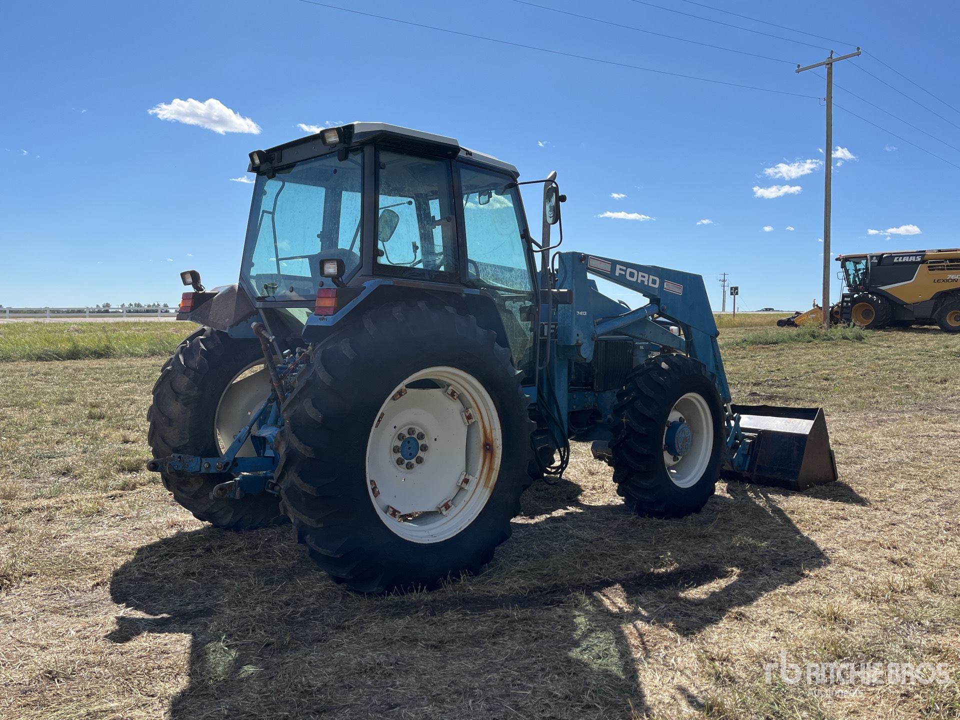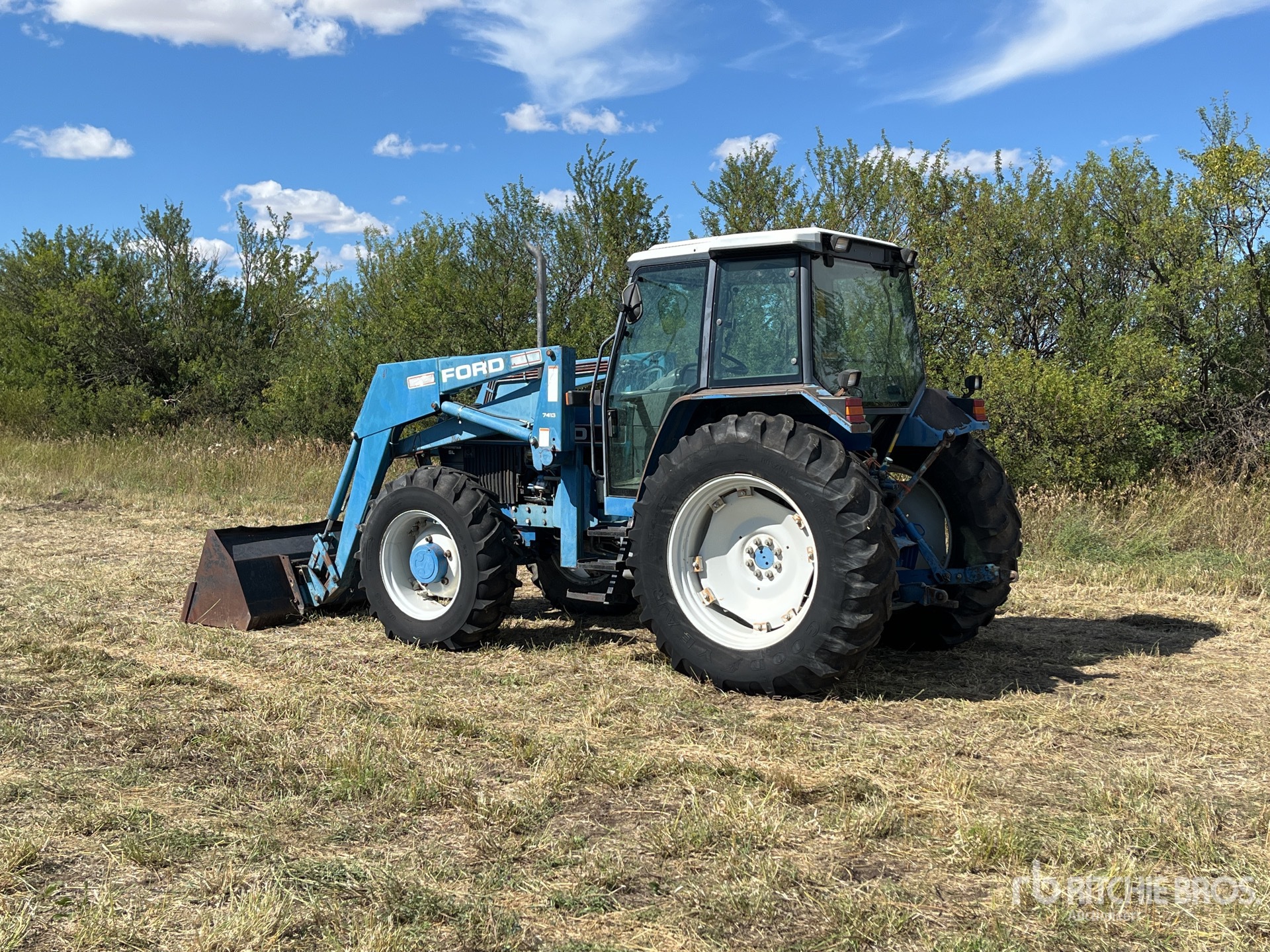 Enclosed Cab, 12 Forward, SynchroShift, Ford 7413 Loader w/Joystick, 96 in Bucket, 4 Rear Remotes, 540 PTO, 3-Point Hitch, 14.9x28 Front Tires, 18.4x38 Rear Tires