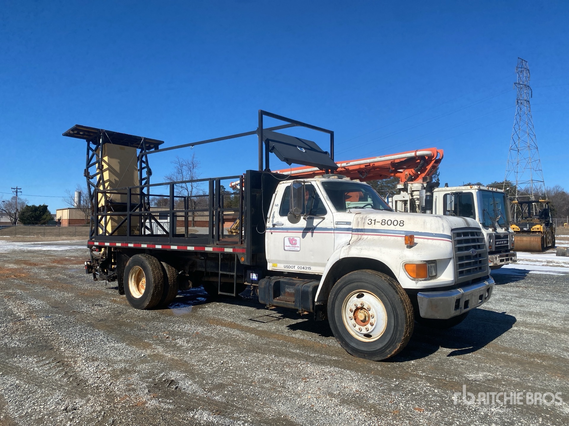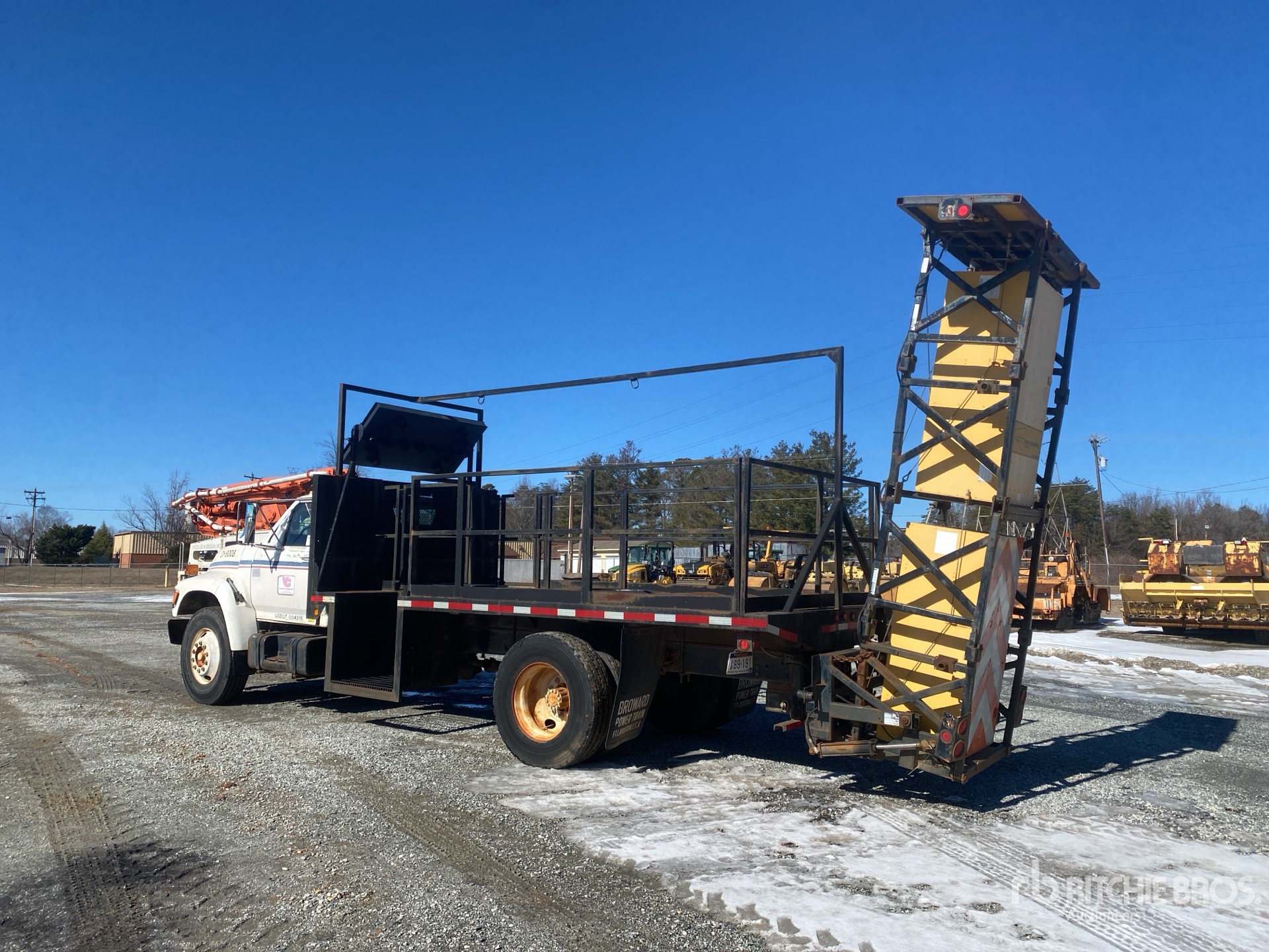 Ford B Series 5.9 L Diesel 190 hp Engine, 1994 US EPA Label, 685 Engine hrs, Manual Transmission, 7000 lb Front Axle, 17500 lb Rears, 24500 lb GVWR, 11R22.5, Spring Suspension, 190 in Wheelbase, PTO, Flatbed, Arrow Board, In-Cab Arrow Board Controller