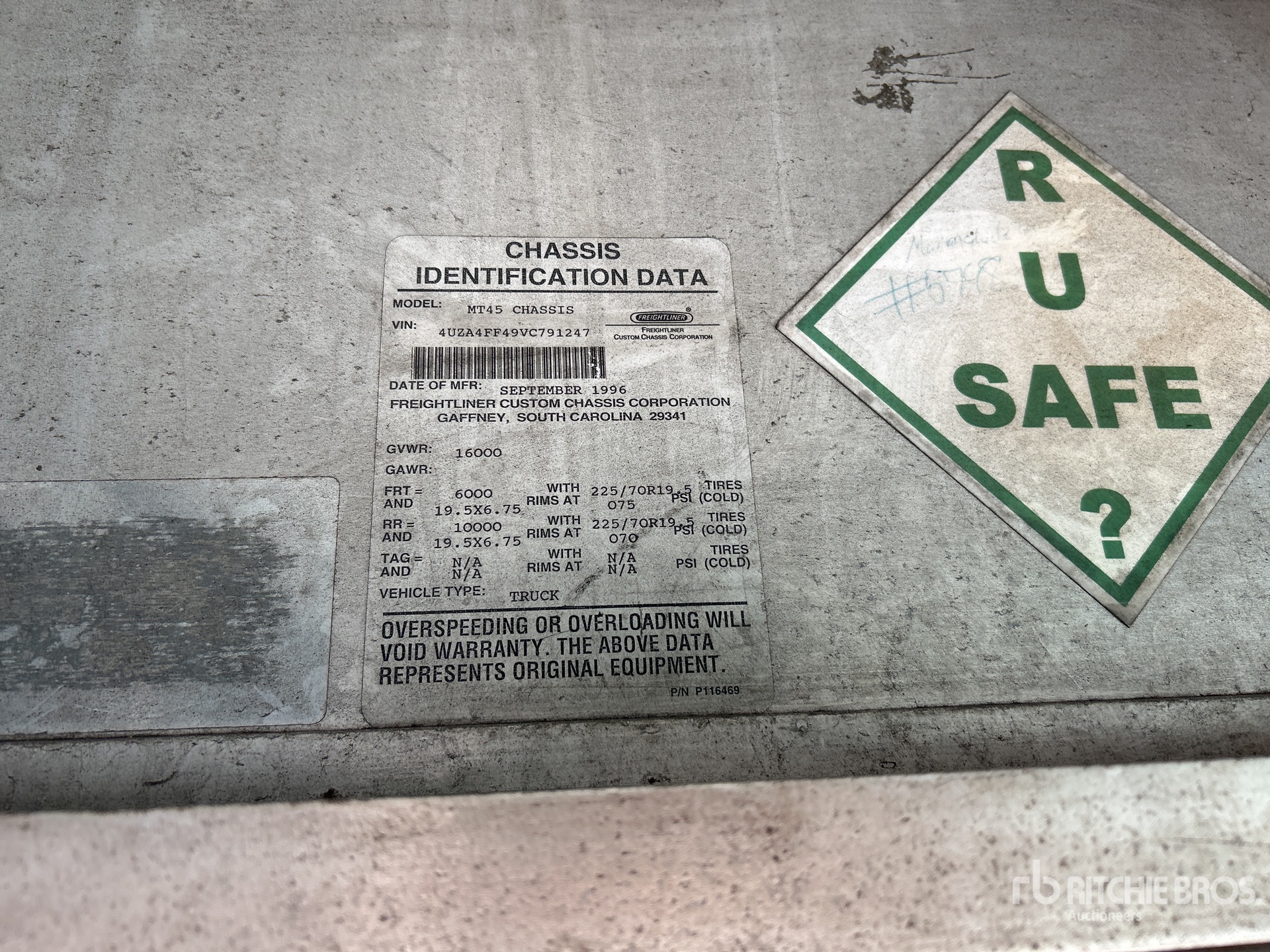The detailed equipment information is limited in scope, and Ritchie Bros. Auctioneers has not inspected any aspects or components of the equipment other than those expressly set forth herein. Unless expressly stated, we make no representations or warranties, express or implied, concerning the equipment or its components, including without limitation any representations or warranties concerning functionality, conformity or compliance with any safety standard or requirement of any applicable authority or regulatory body, fitness for any particular purpose, or merchantability. You are strongly advised to perform your own detailed inspection of the equipment prior to bidding.