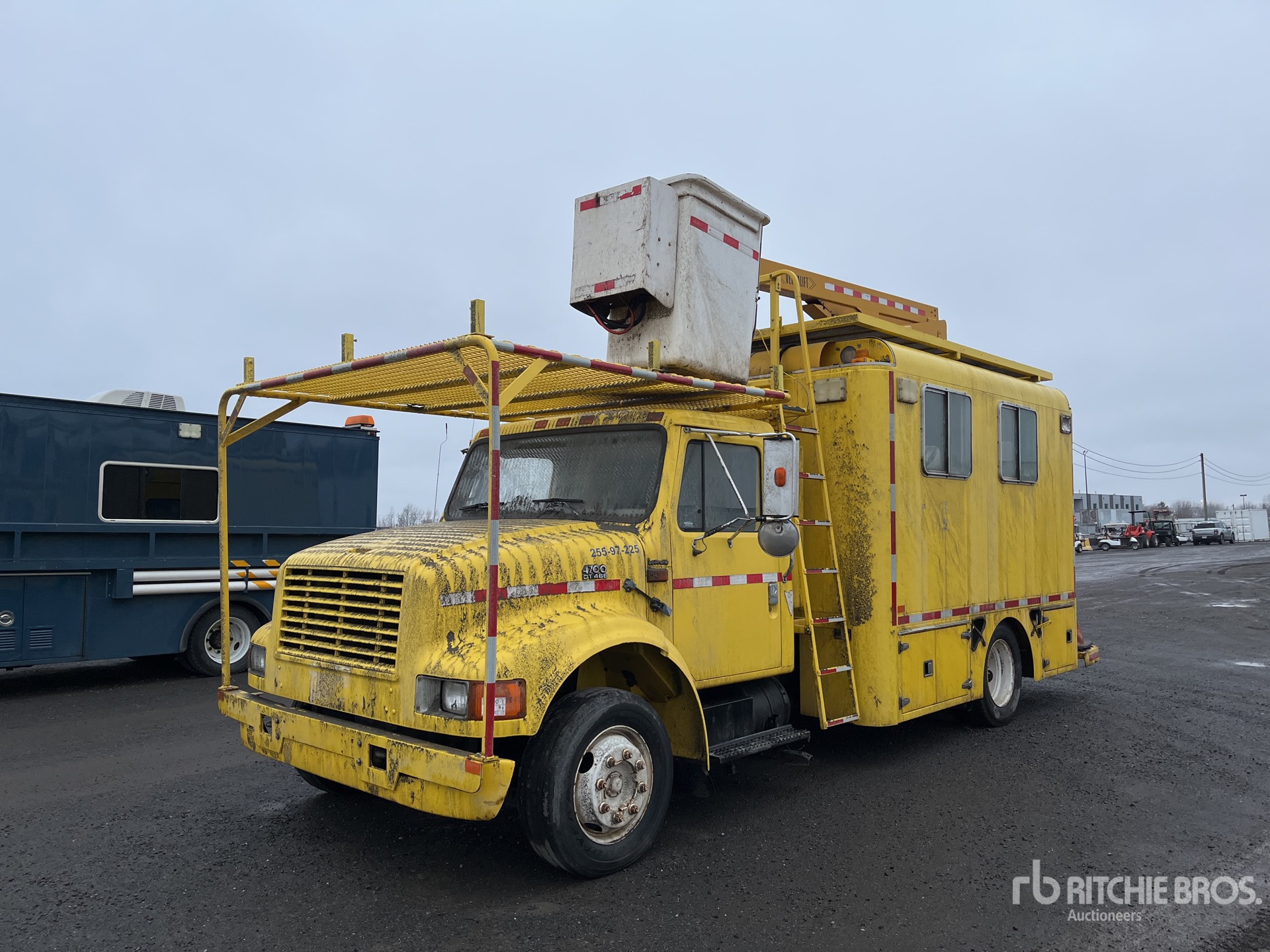 International MaxxForce DT466 6 Cylinder 7.4 L Diesel 190 hp Engine, 1996 US EPA Label, 9031 Engine hrs, Automatic Transmission, 8000 lb Front Axle, 13500 lb Rears, 21500 lb GVWR, 245/70R19.5, Air Ride Suspension, 170 in Wheelbase, PTO, 300 lb Capacity, Center Mounted, Insulated One-Person Telescopic Boom, Remote Control w/Cord, 12 ft x 96 in Bed