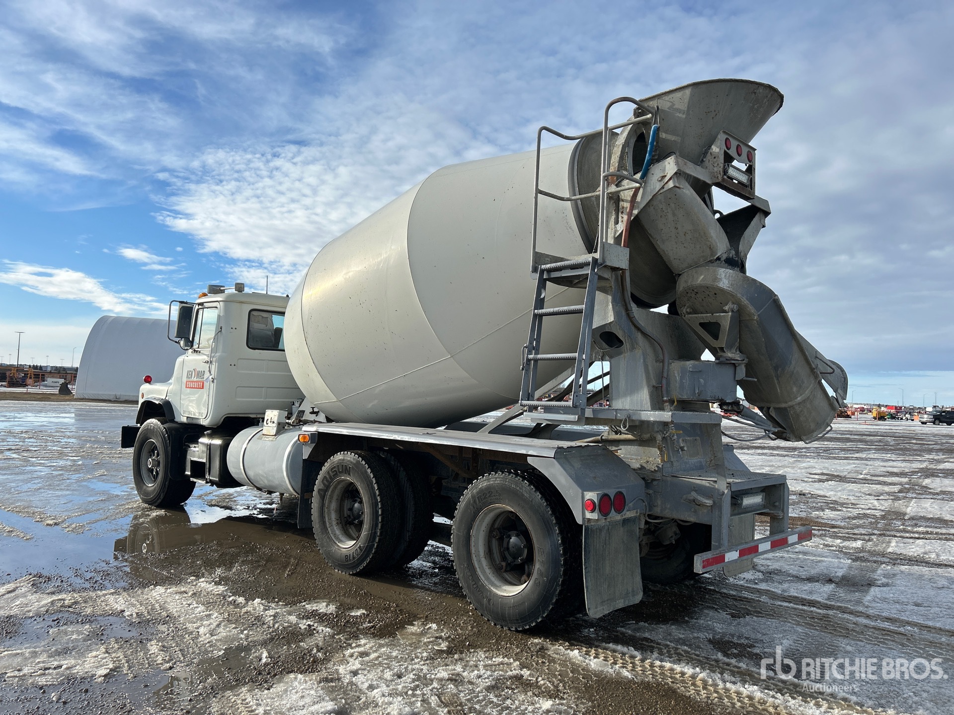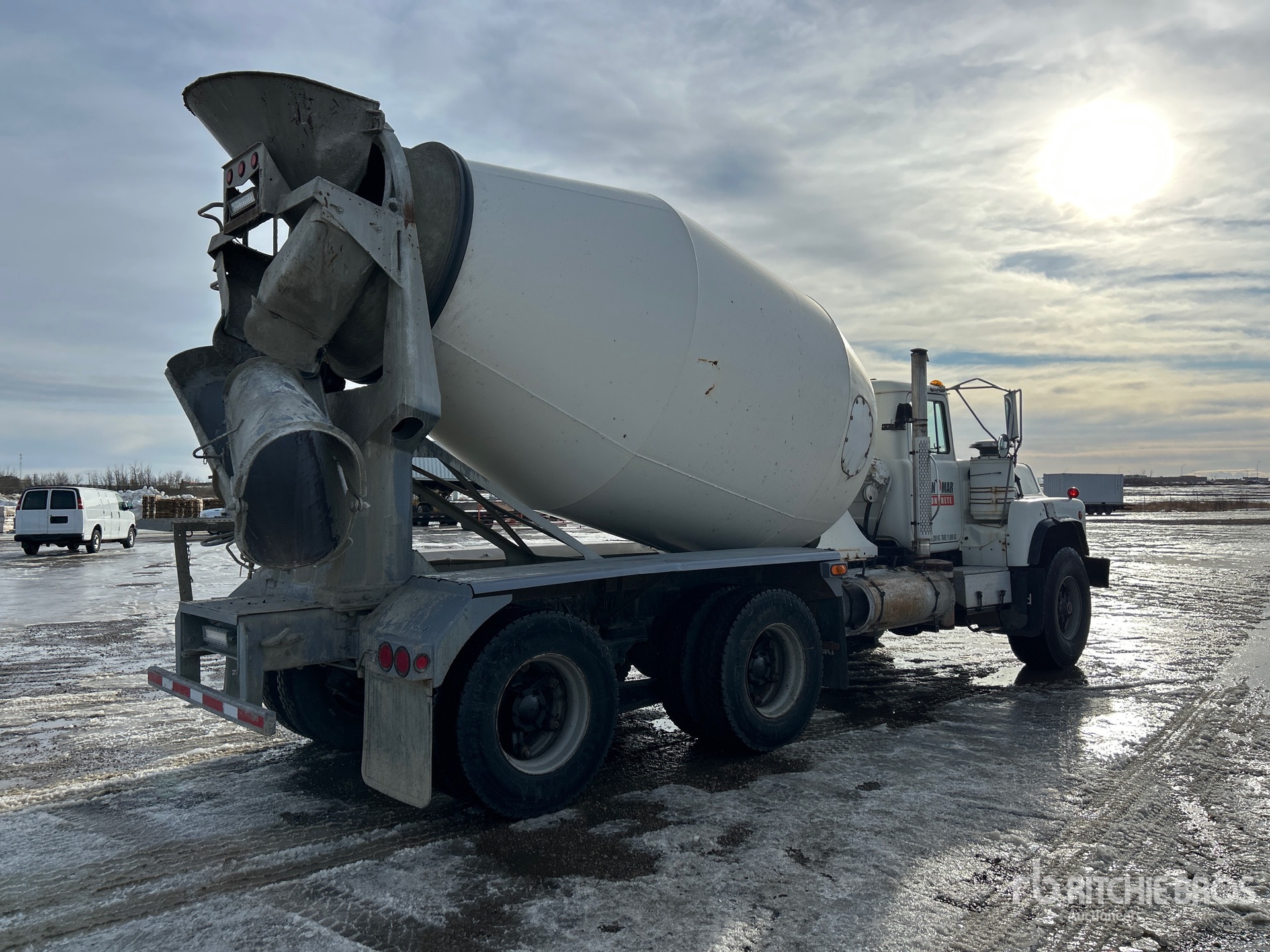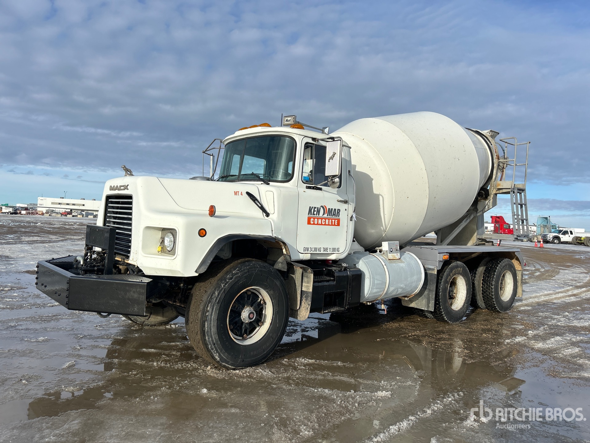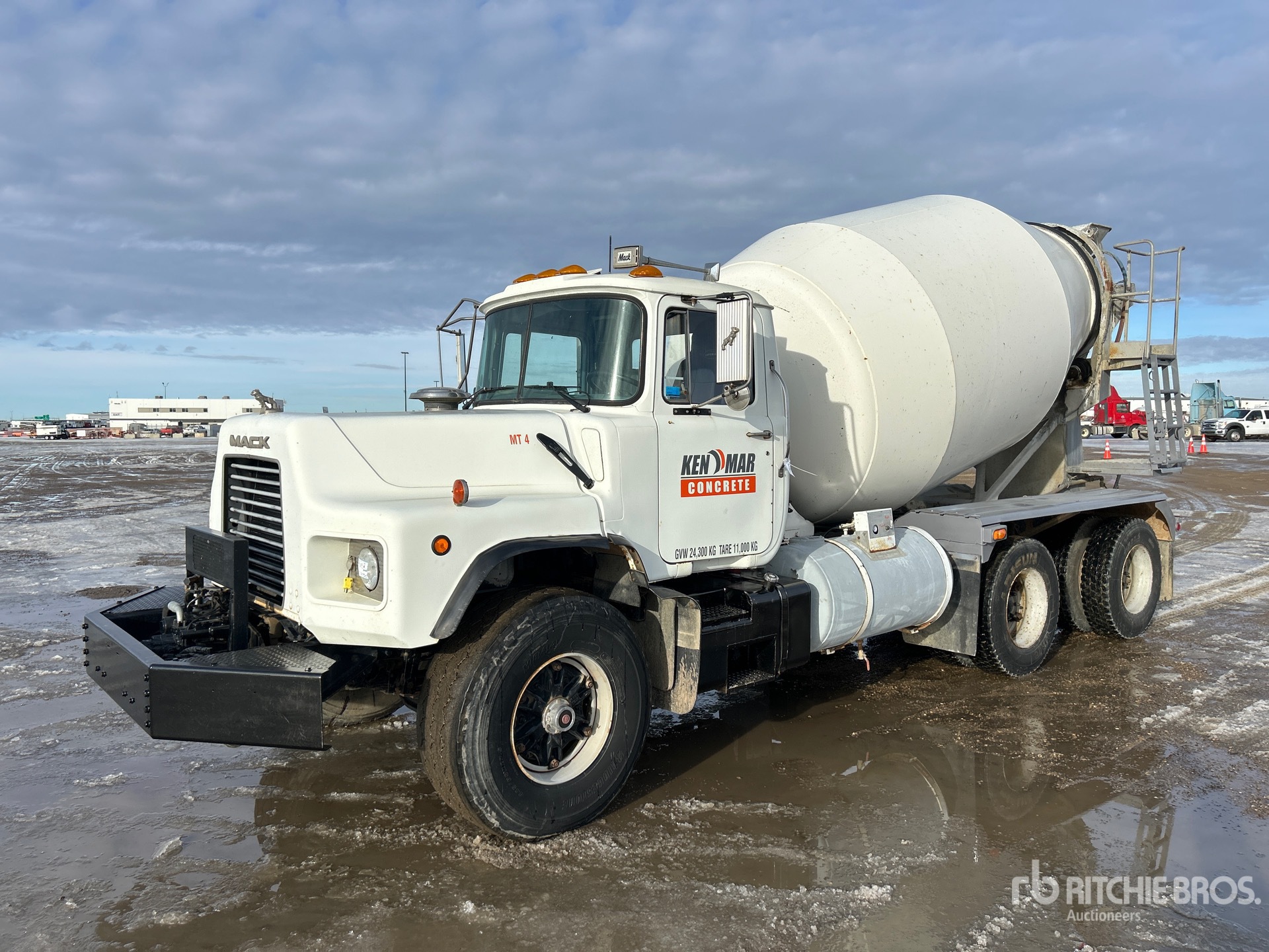 Located in Lane 39 Spot 1, 6 Cylinder 12 L Diesel Engine, 1998 US EPA Label, 19254 Engine hrs, Mack 8-Speed Manual Transmission, 445/65R22.5 Front Tires, 11R22.5 Rear Tires, Double Frame, Hendrickson Rubber over Walking Beam Suspension, 202 in Wheelbase, PTO, London TM 3 m3 Mixer Unit, 4 Removable Chutes, Remote Control w/Cord