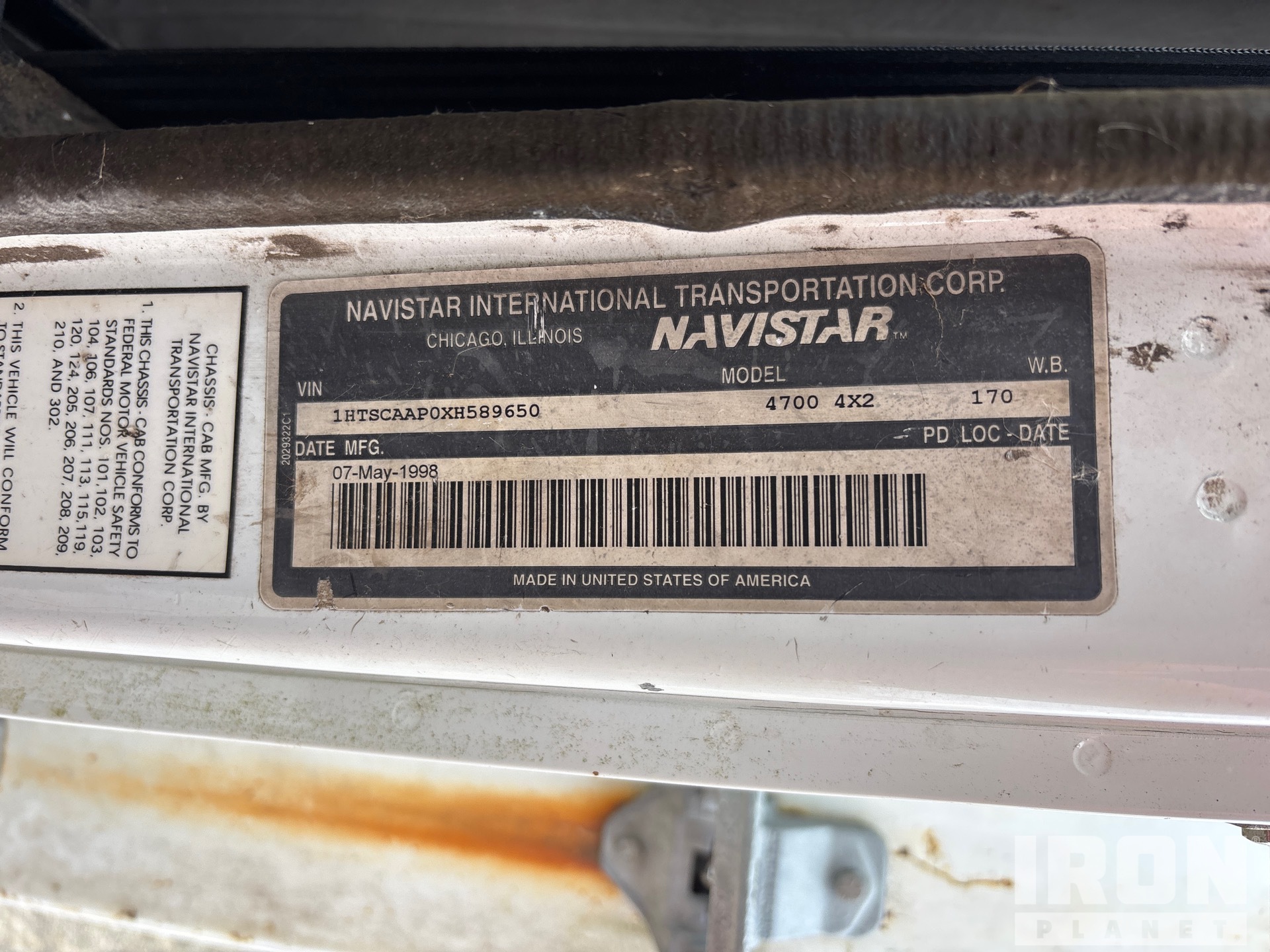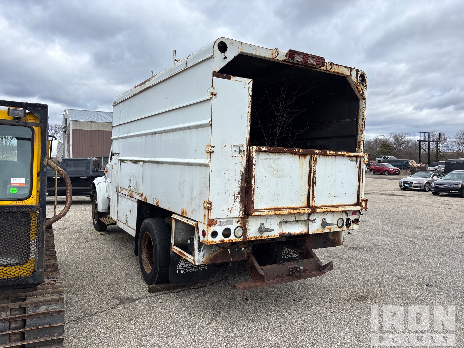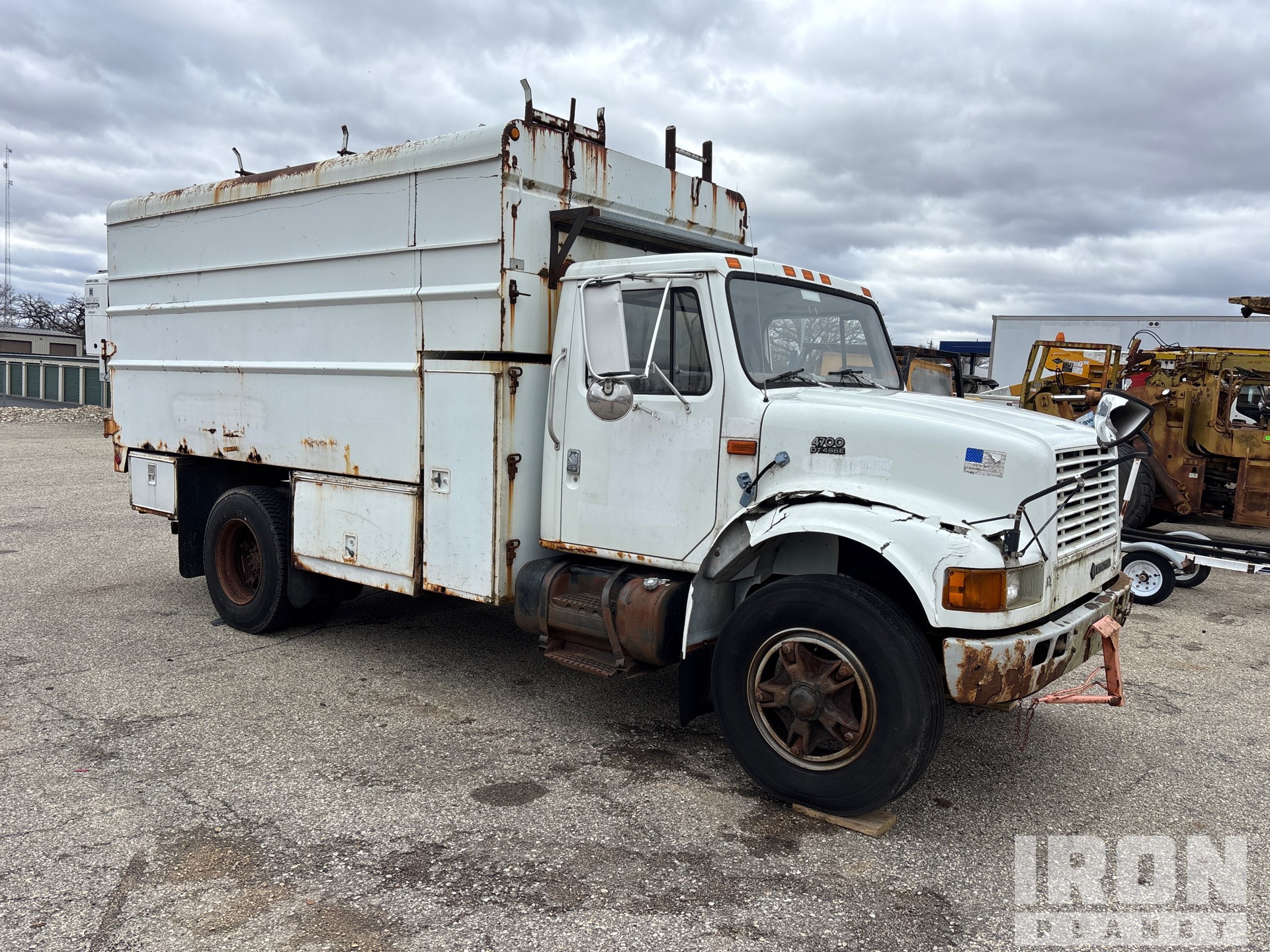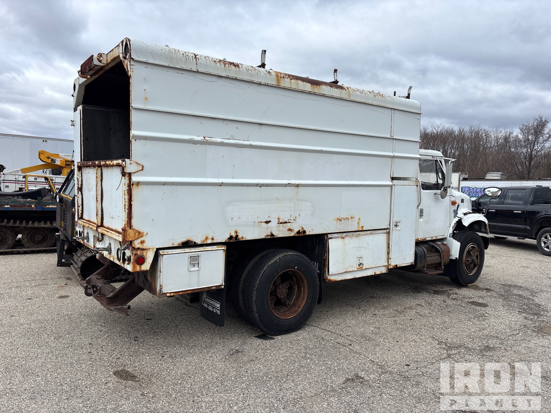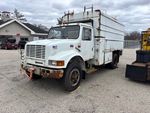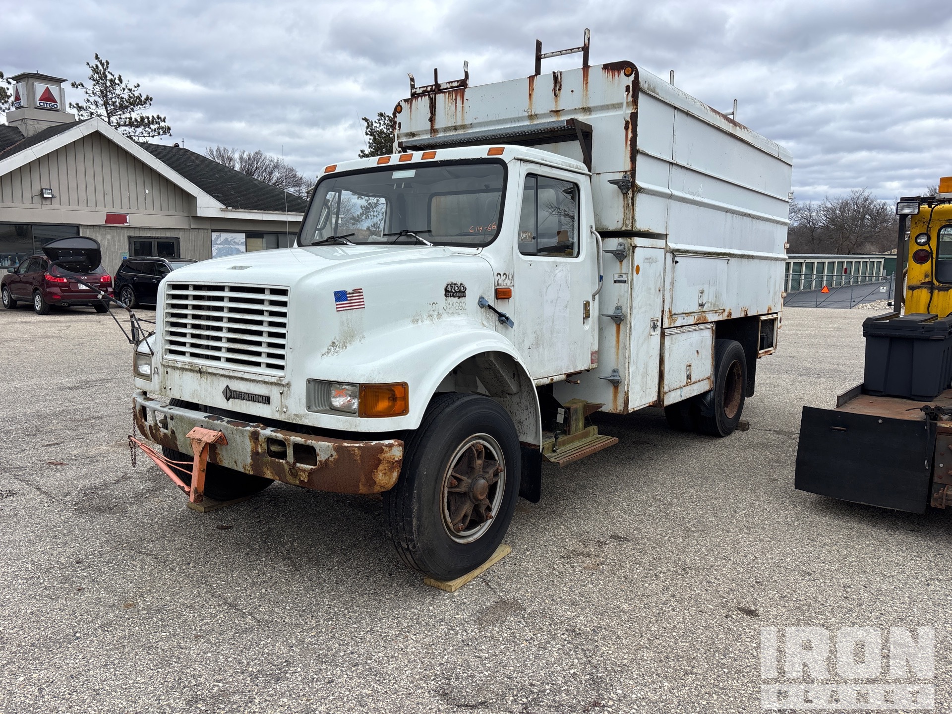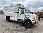 International DT466E 6 Cylinder 7.6 L Diesel 190 hp Engine, 1998 US EPA Label, 12949 Engine hrs, Automatic Transmission, 10R22.5, Spring Suspension, 170 in Wheelbase, PTO, 14 ft 4 in Long x 6 ft High Steel Body, Pintle Hitch