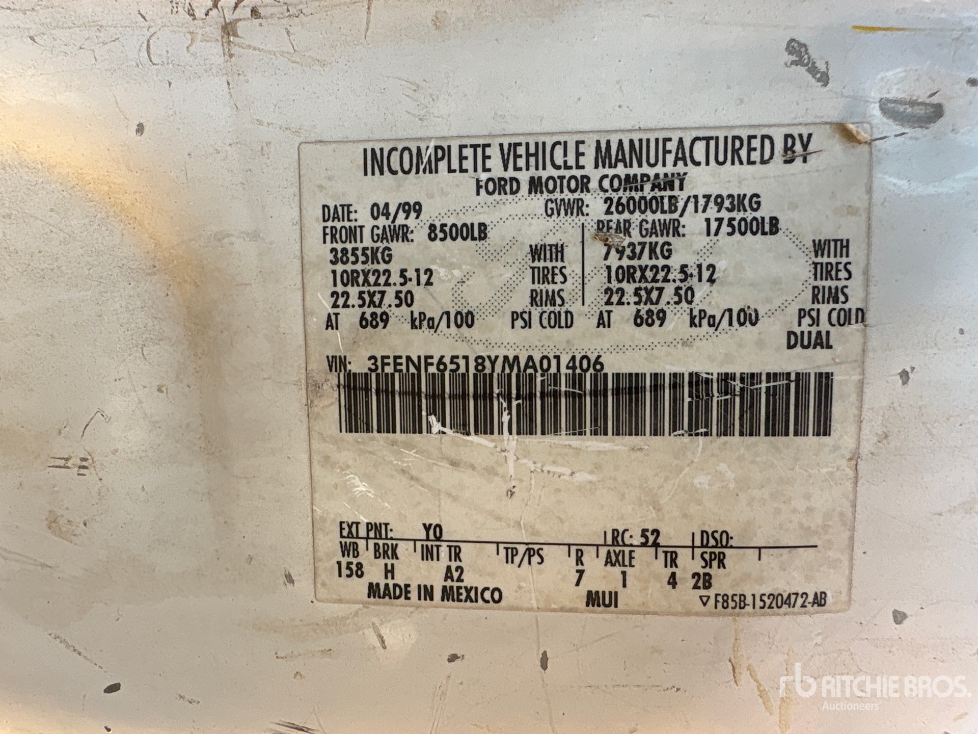 The detailed equipment information is limited in scope, and Ritchie Bros. Auctioneers has not inspected any aspects or components of the equipment other than those expressly set forth herein. Unless expressly stated, we make no representations or warranties, express or implied, concerning the equipment or its components, including without limitation any representations or warranties concerning functionality, conformity or compliance with any safety standard or requirement of any applicable authority or regulatory body, fitness for any particular purpose, or merchantability. You are strongly advised to perform your own detailed inspection of the equipment prior to bidding.