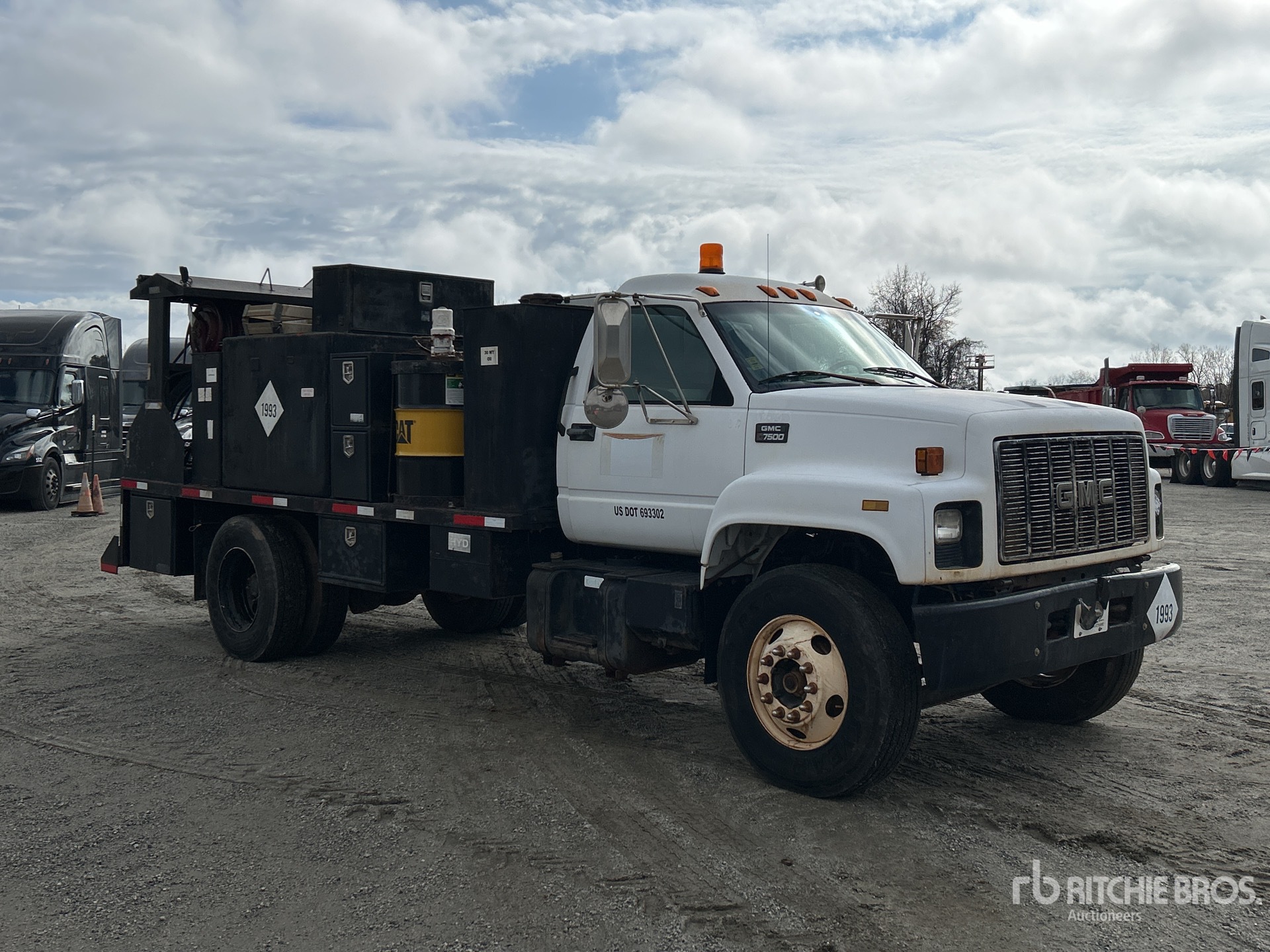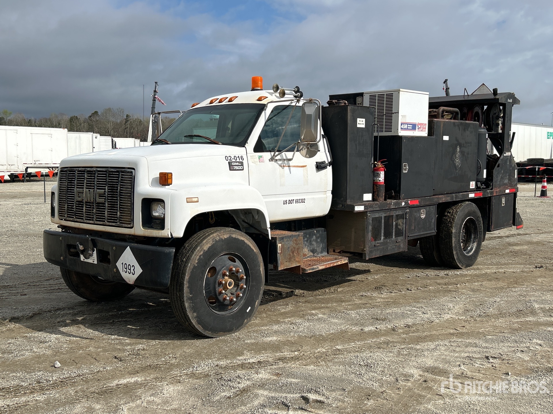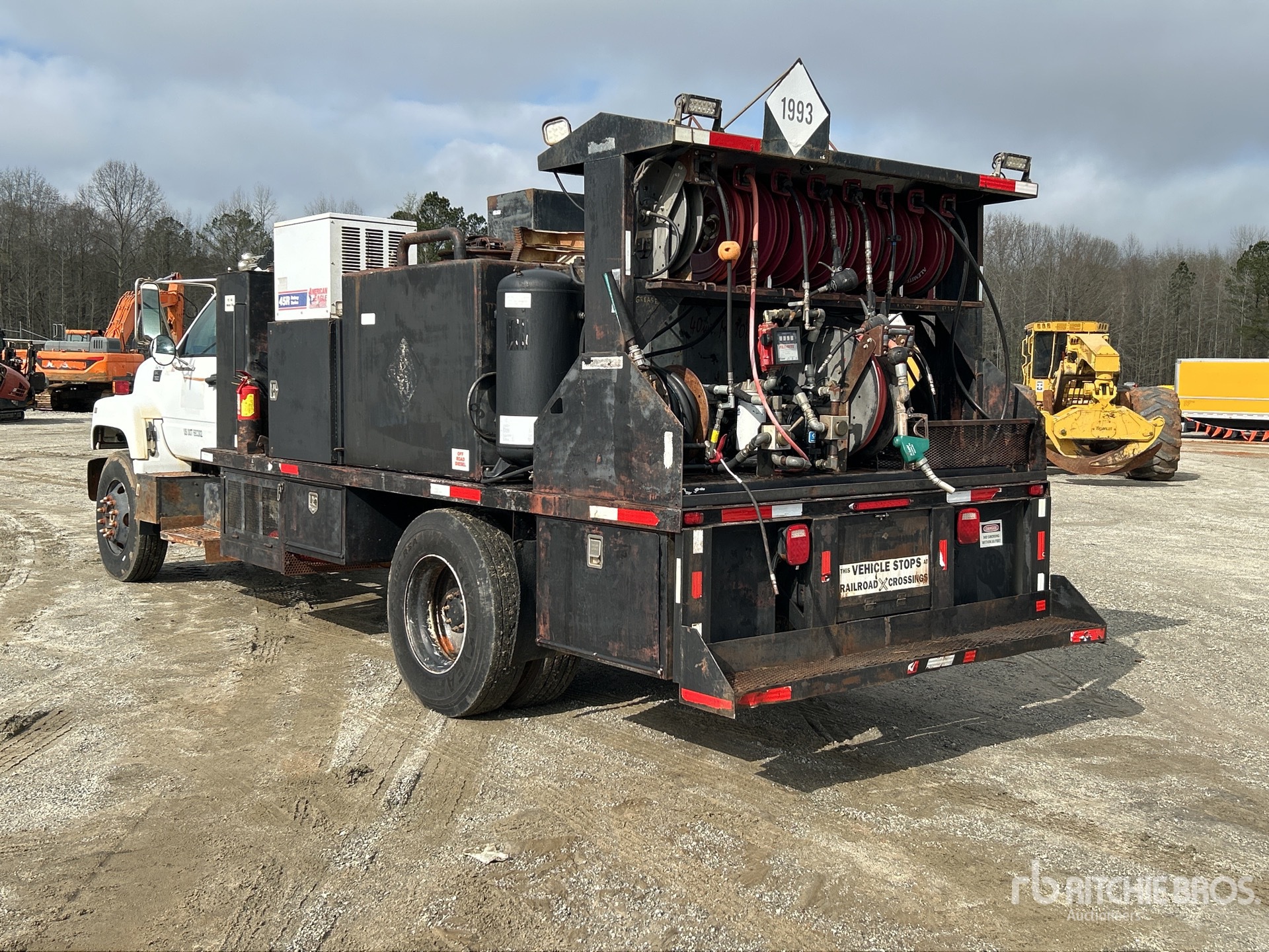 Cat 3126 6 Cylinder 7.2 L Diesel Engine, 1999 US EPA Label, Automatic Transmission, 10000 lb Front Axle, 22000 lb Rears, 32000 lb GVWR, 11R22.5 Front Tires, 11R22.5 Rear Tires, Spring Suspension, 194 in Wheelbase, PTO, 16 ft Body, ( 2 ) Diesel Tank, ( 5 ) Oil Tanks, ( 10 ) Hose Reels, Metered Nozzles, Grease Barrel, Hydraulic Hose Reel, American Eagle 45R Rotary Series Hydraulic Air Compressor, Air Hose Reel