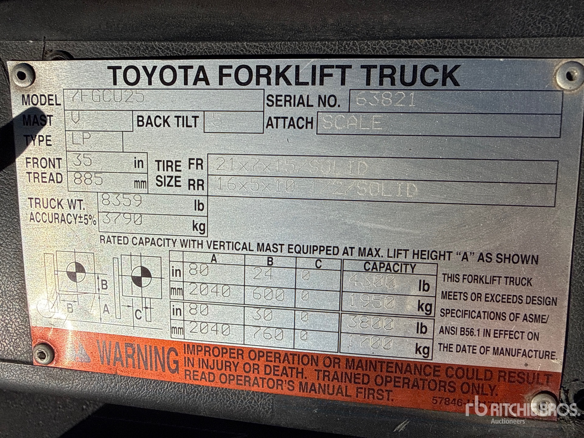 The detailed equipment information is limited in scope, and Ritchie Bros. Auctioneers has not inspected any aspects or components of the equipment other than those expressly set forth herein. Unless expressly stated, we make no representations or warranties, express or implied, concerning the equipment or its components, including without limitation any representations or warranties concerning functionality, conformity or compliance with any safety standard or requirement of any applicable authority or regulatory body, fitness for any particular purpose, or merchantability. You are strongly advised to perform your own detailed inspection of the equipment prior to bidding.
