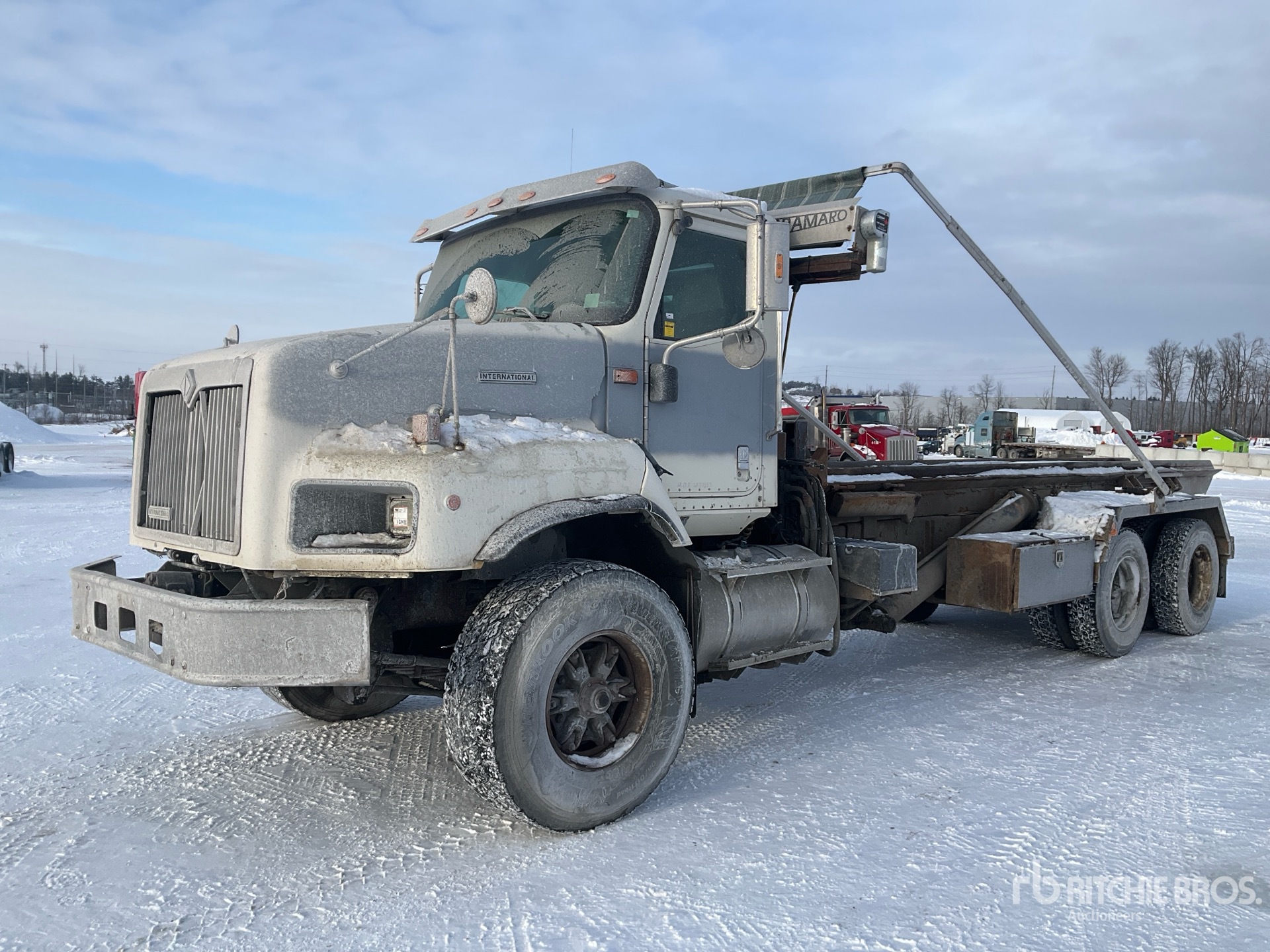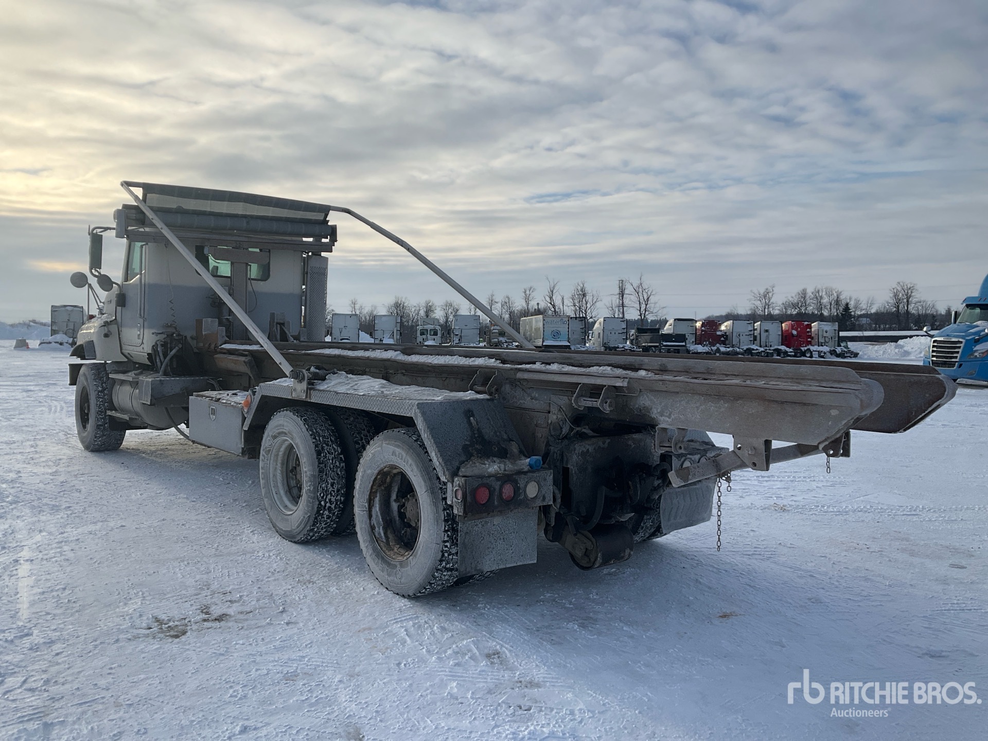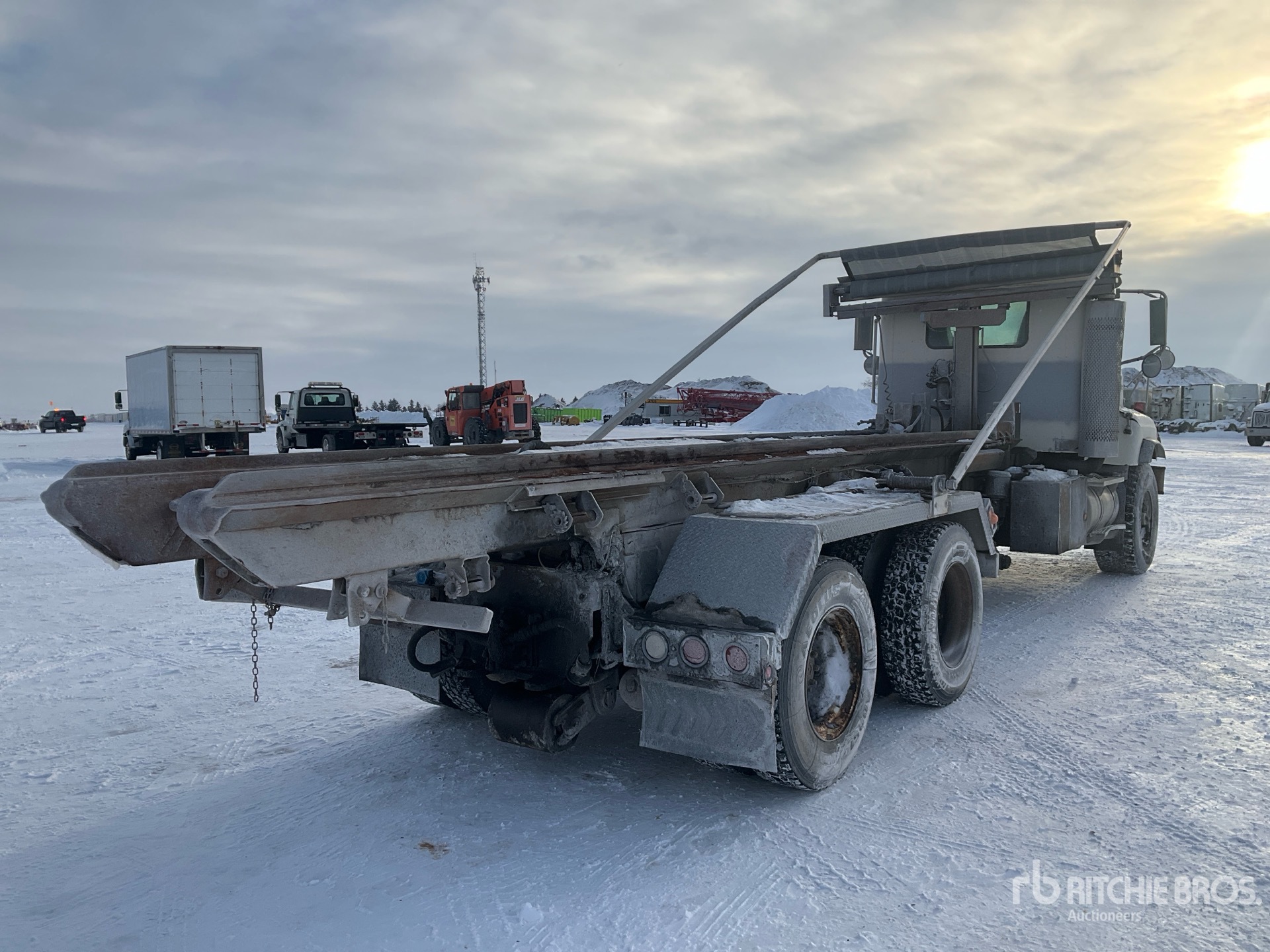 Cummins 6 Cylinder 14 L Diesel Engine, 27390 Engine hrs, Engine Brake, Eaton Fuller 8LL Manual Transmission, Differential Lock, 9072 kg Front Axle, 20866 kg Rears, 29938 kg GVWR, 445/65R22.5 Front Tires, 11R22.5 Rear Tires, Dual Steering Boxes, Double Frame, Hendrickson Spring over Walking Beam Suspension, 248 in Wheelbase, PTO, 2001 UHE U-2230-RO Roll-Off Body, 22 ft Hoist, Pintle Hitch
