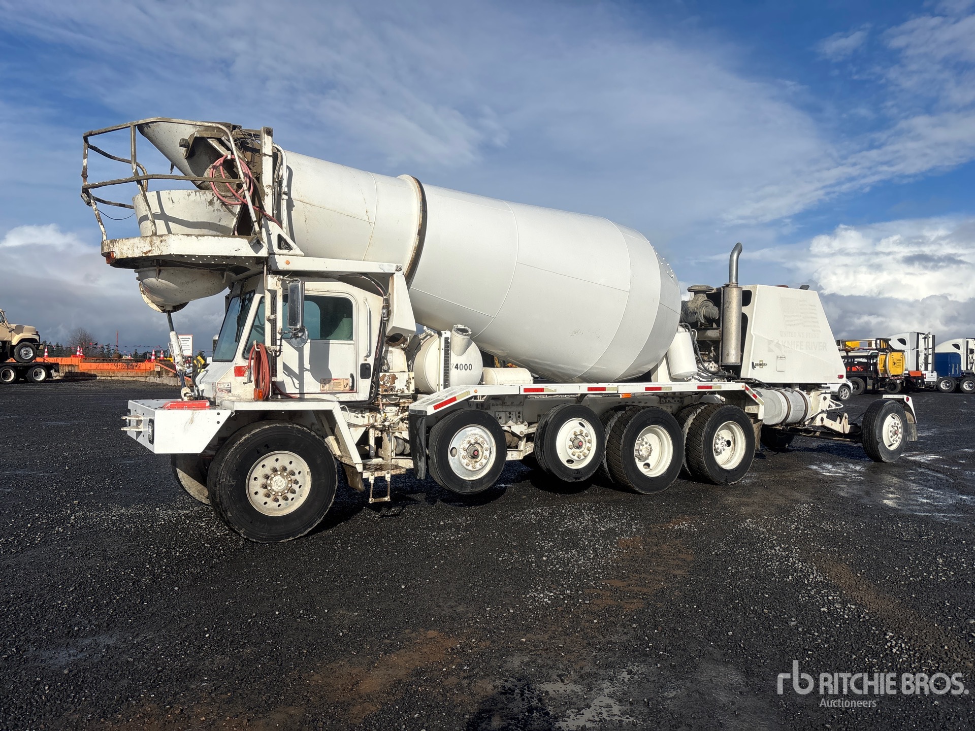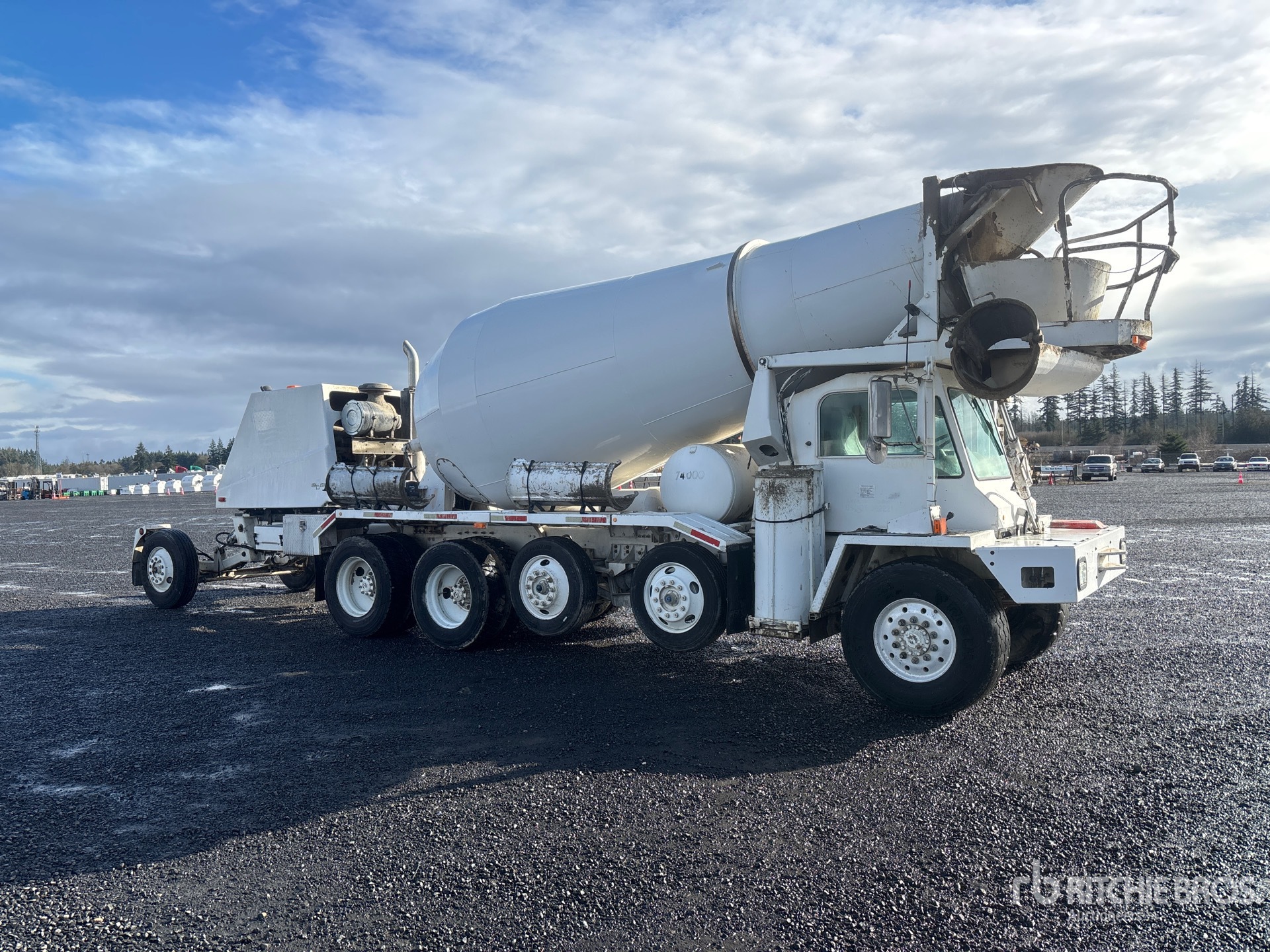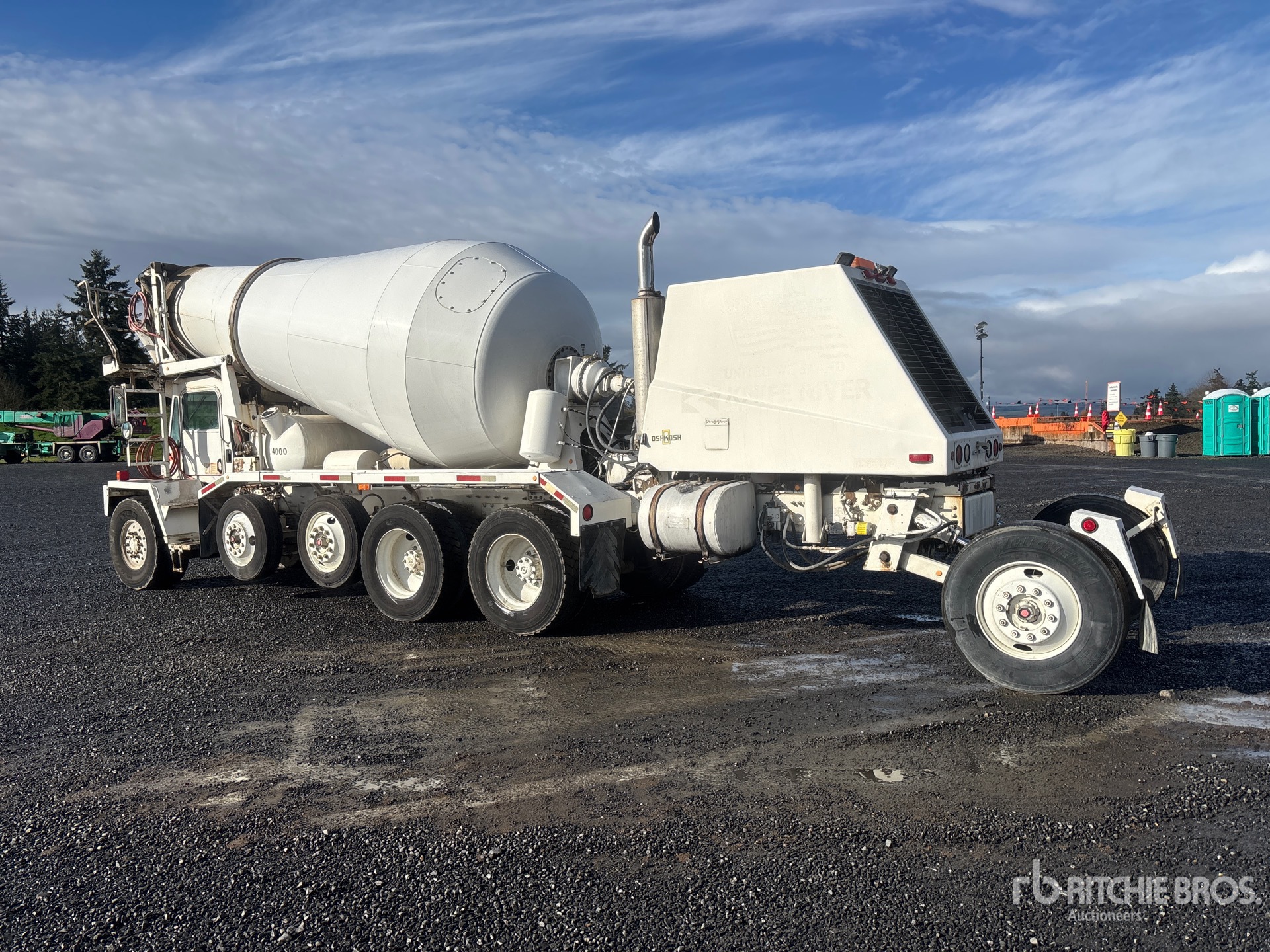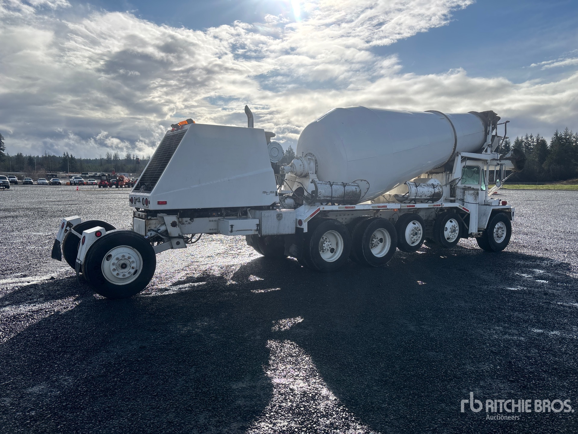 Located in Lane 17 Spot 8, Cat C12 6 Cylinder Diesel Engine, 7236 Engine hrs, Eaton Fuller 9-Speed Manual Transmission, 21000 lb Front Axle, 74000 lb GVWR, Aluminum Front Wheels, 445/65R22.5 Front Tires, 11R24.5 Rear Tires, 2 Steerable Air Lift Pusher Axle, Trailing Tag Axle, Double Frame, Chalmers Suspension, 210 in Wheelbase, PTO, Oshkosh 11 cyd Mixer Unit, 4 Removable Chutes