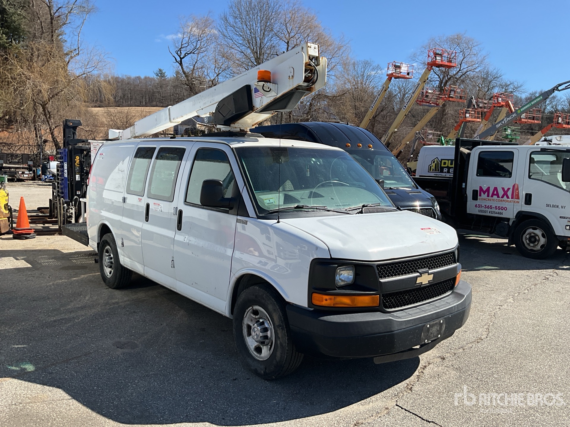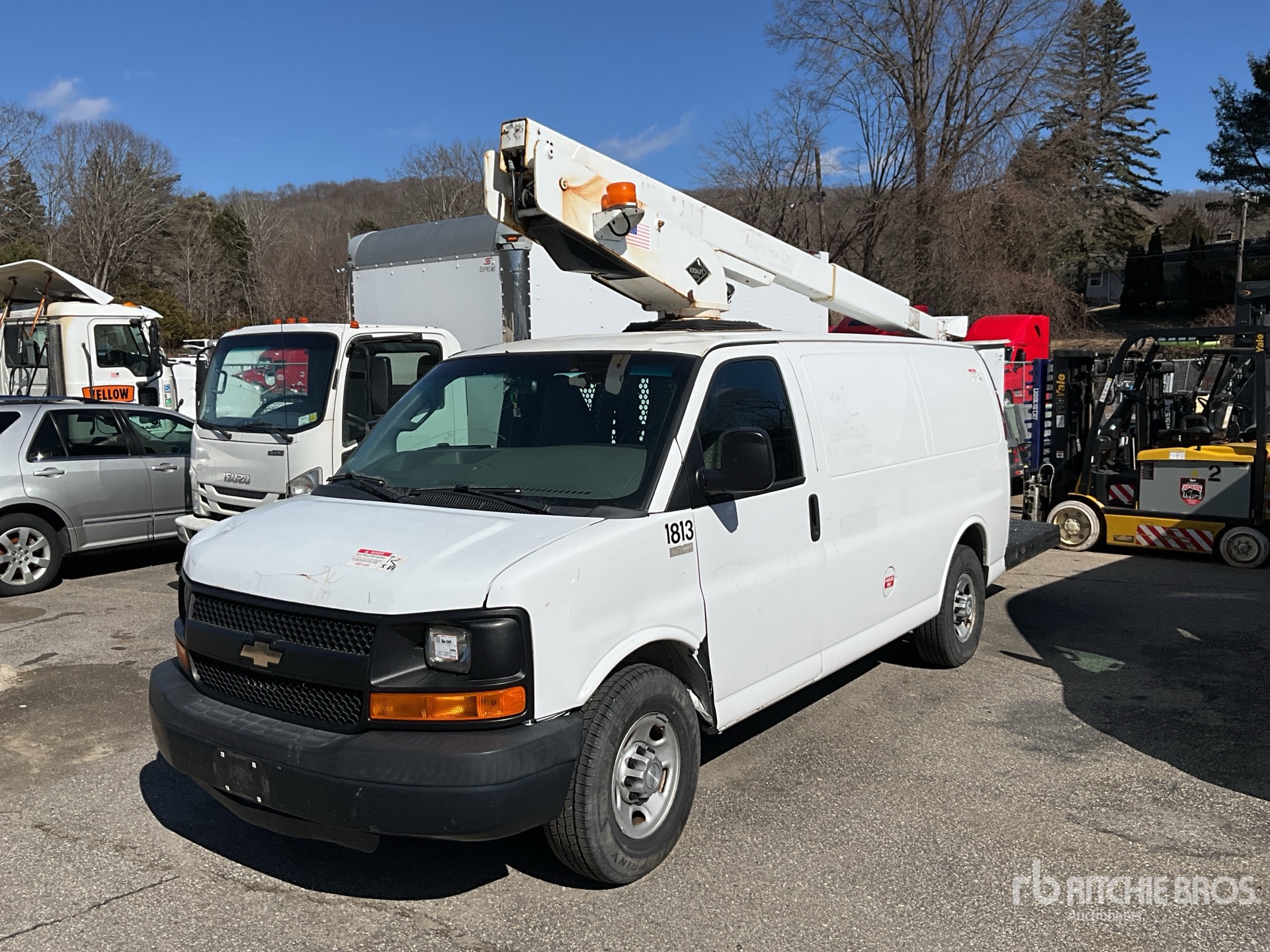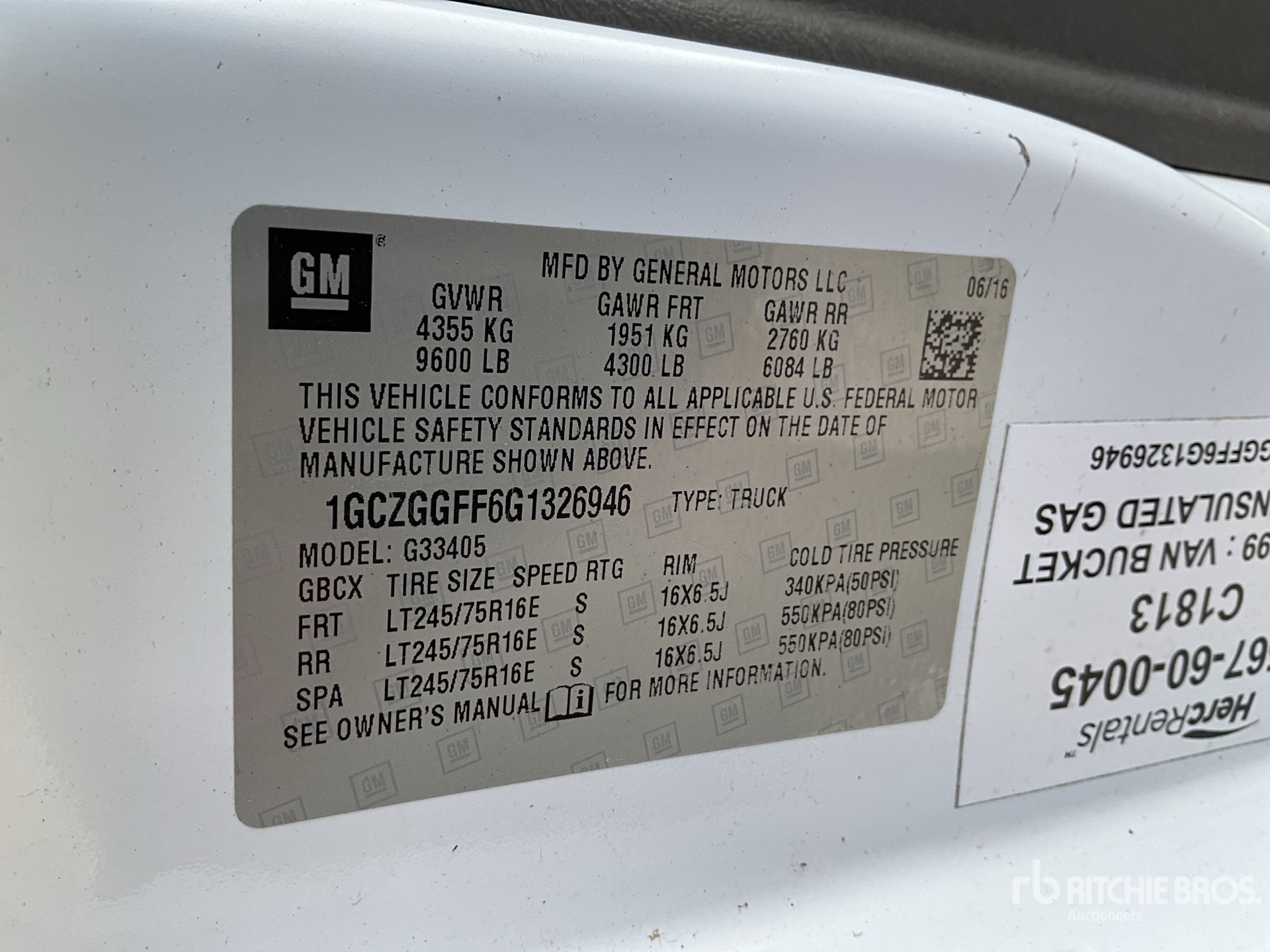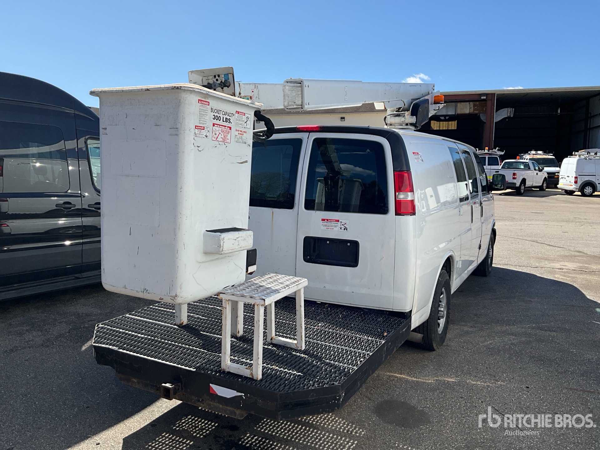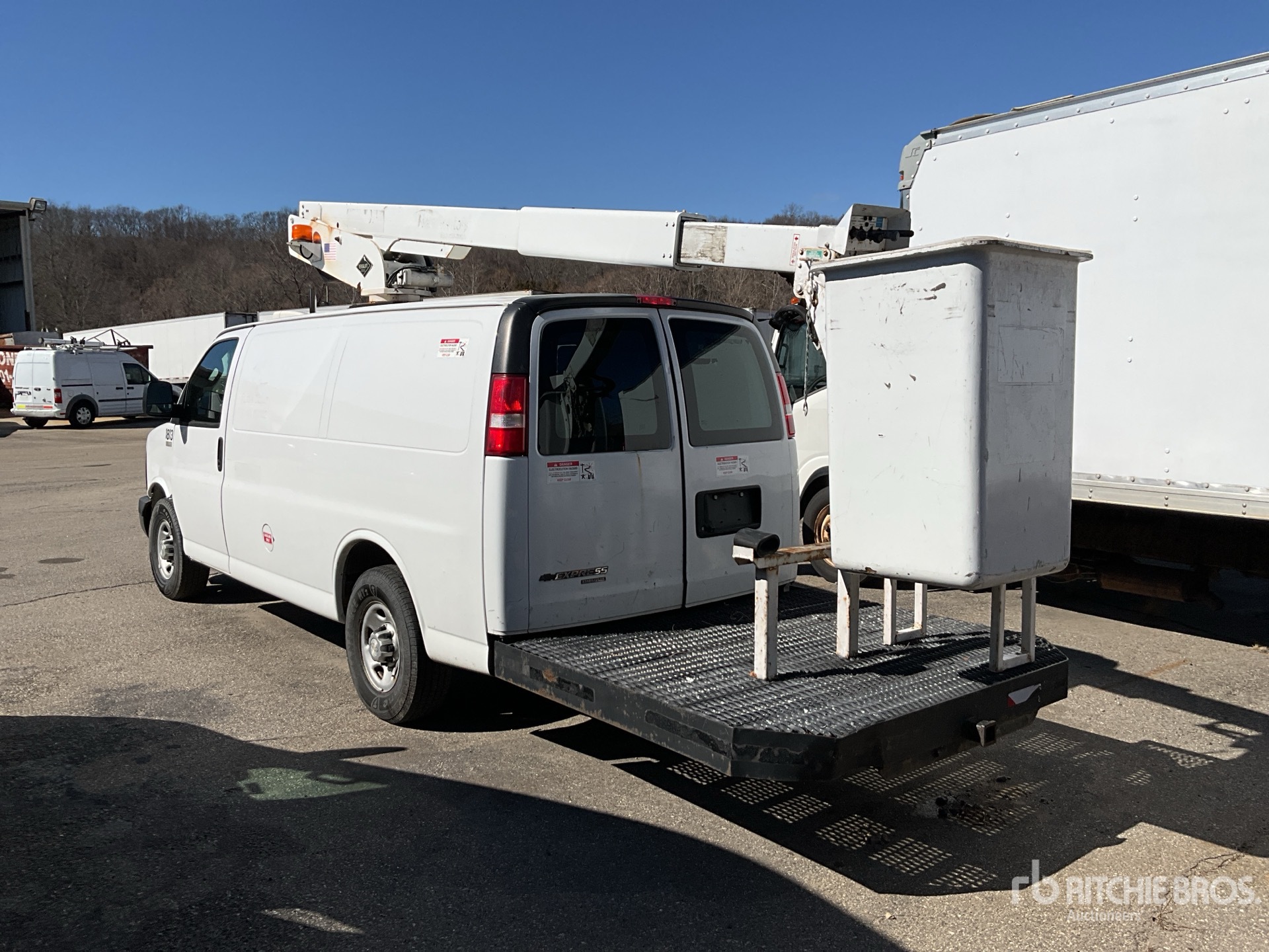 GM V8 4.8 L Gasoline Engine, 2016 US EPA Label, Automatic Transmission, 4300 lb Front Axle, 6084 lb Rears, 9600 lb GVWR, 245/75R16, Spring Suspension, 168 in Wheelbase, Front Mounted, One-Person Telescopic Boom, Van Body, Receiver Hitch, EQUIPMENT-FROM-HERC-RENTALS
