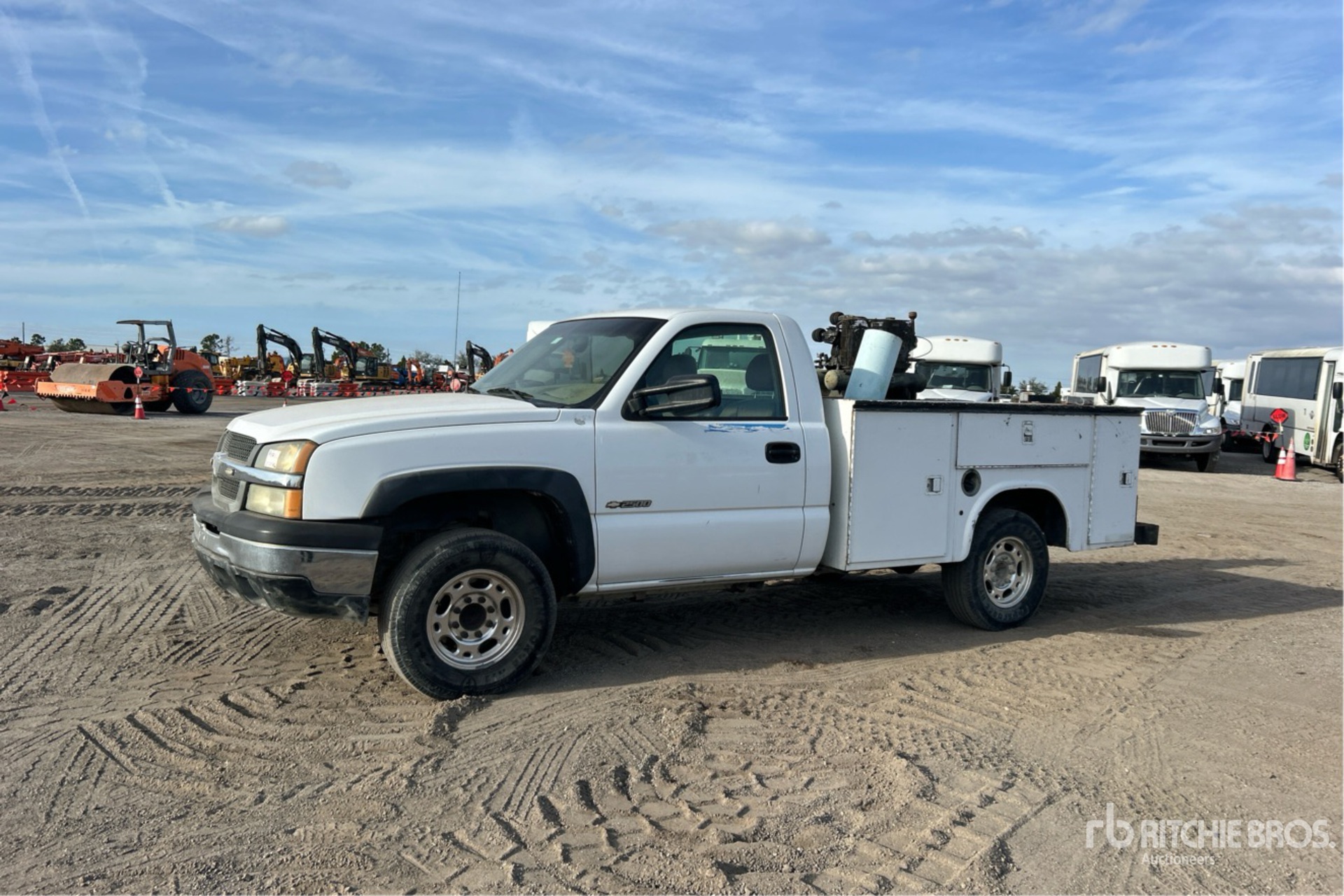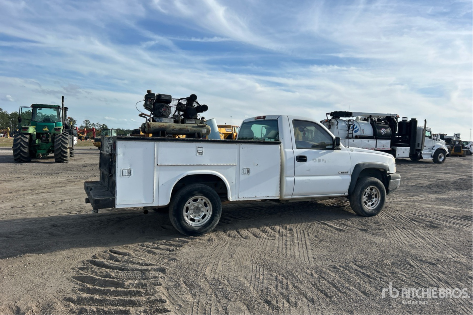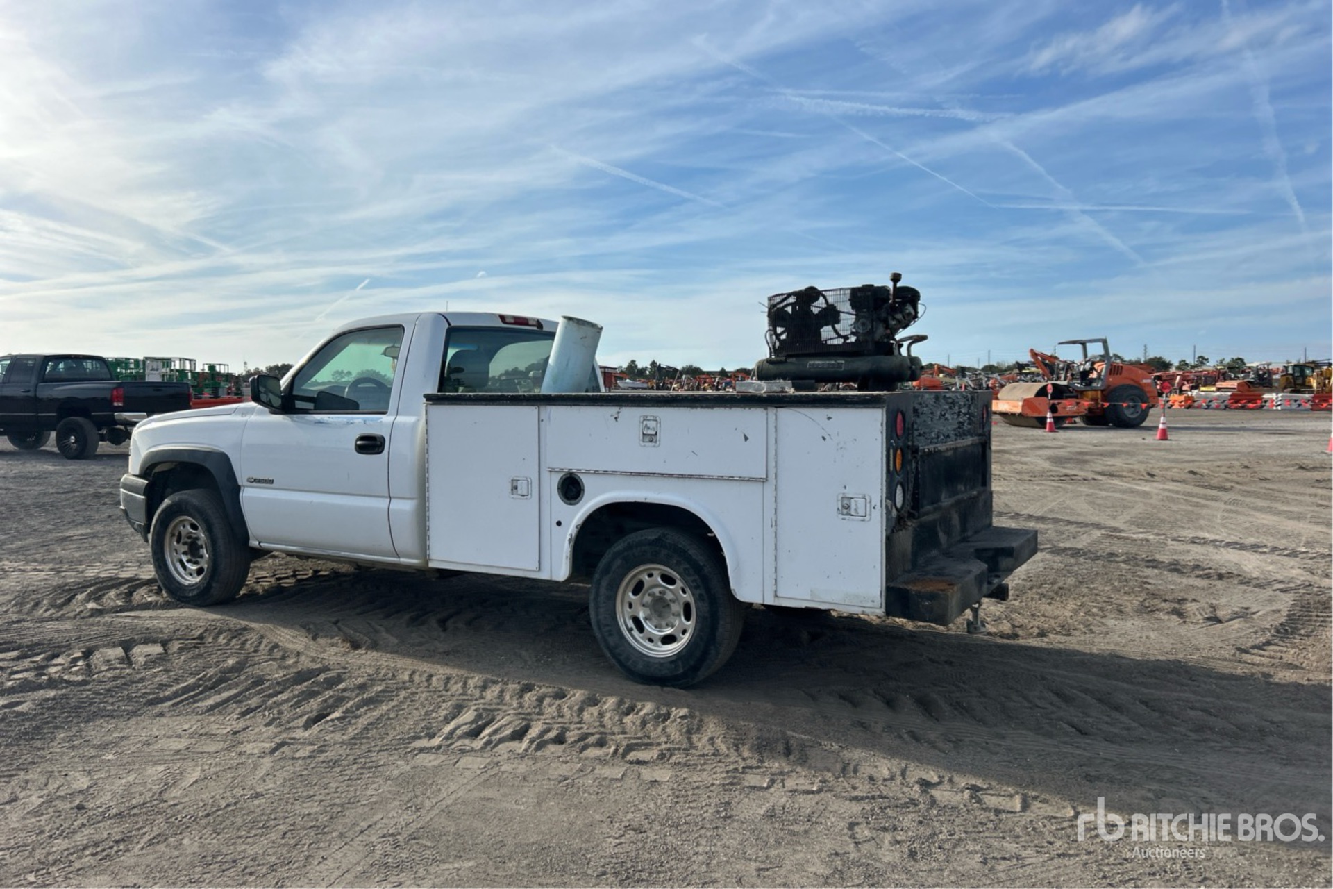 GM V8 6.0 L Gasoline 300 hp Engine, 2003 US EPA Label, Automatic Transmission, 3.73:1 Axle Ratio, 8600 lb GVWR, 245/75R16, Spring Suspension, 133 in Wheelbase, Knapheide 8 ft Body, HCP9100 Gasoline Air Compressor