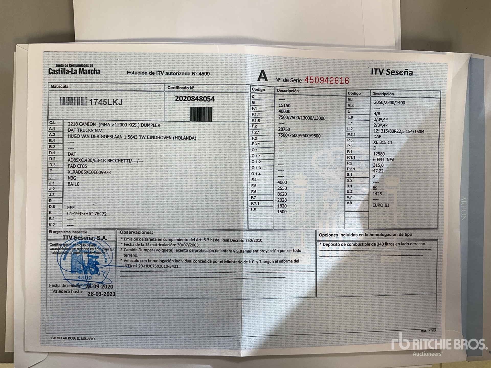 **DOCUMENTACION EXTRAVIADA, DUPLICADO DE LA DOCUMENTACION A CUENTA DEL COMPRADOR/ NO REGISTRATION AVAILABLE**SOLO PARA EL MERCADO NACIONAL Y EUROPEO/ ONLY FOR EUROPE MARKET, THIS LOT CAN NOT BE EXPORTED OUTSIDE OF EUROPE, for more information, please contact our office**