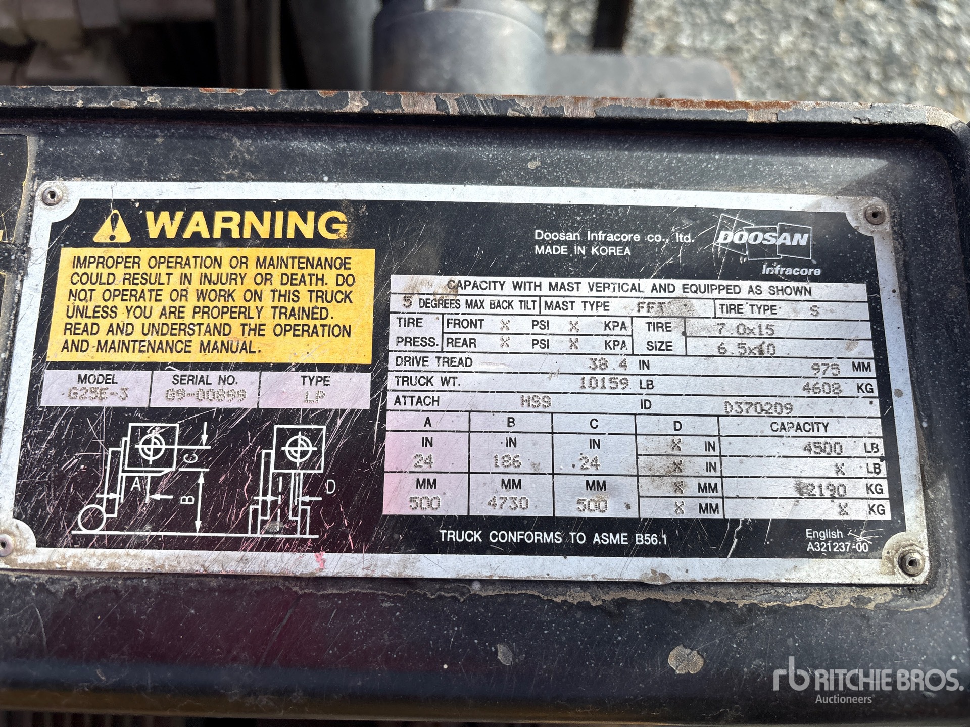 The detailed equipment information is limited in scope, and Ritchie Bros. Auctioneers has not inspected any aspects or components of the equipment other than those expressly set forth herein. Unless expressly stated, we make no representations or warranties, express or implied, concerning the equipment or its components, including without limitation any representations or warranties concerning functionality, conformity or compliance with any safety standard or requirement of any applicable authority or regulatory body, fitness for any particular purpose, or merchantability. You are strongly advised to perform your own detailed inspection of the equipment prior to bidding.