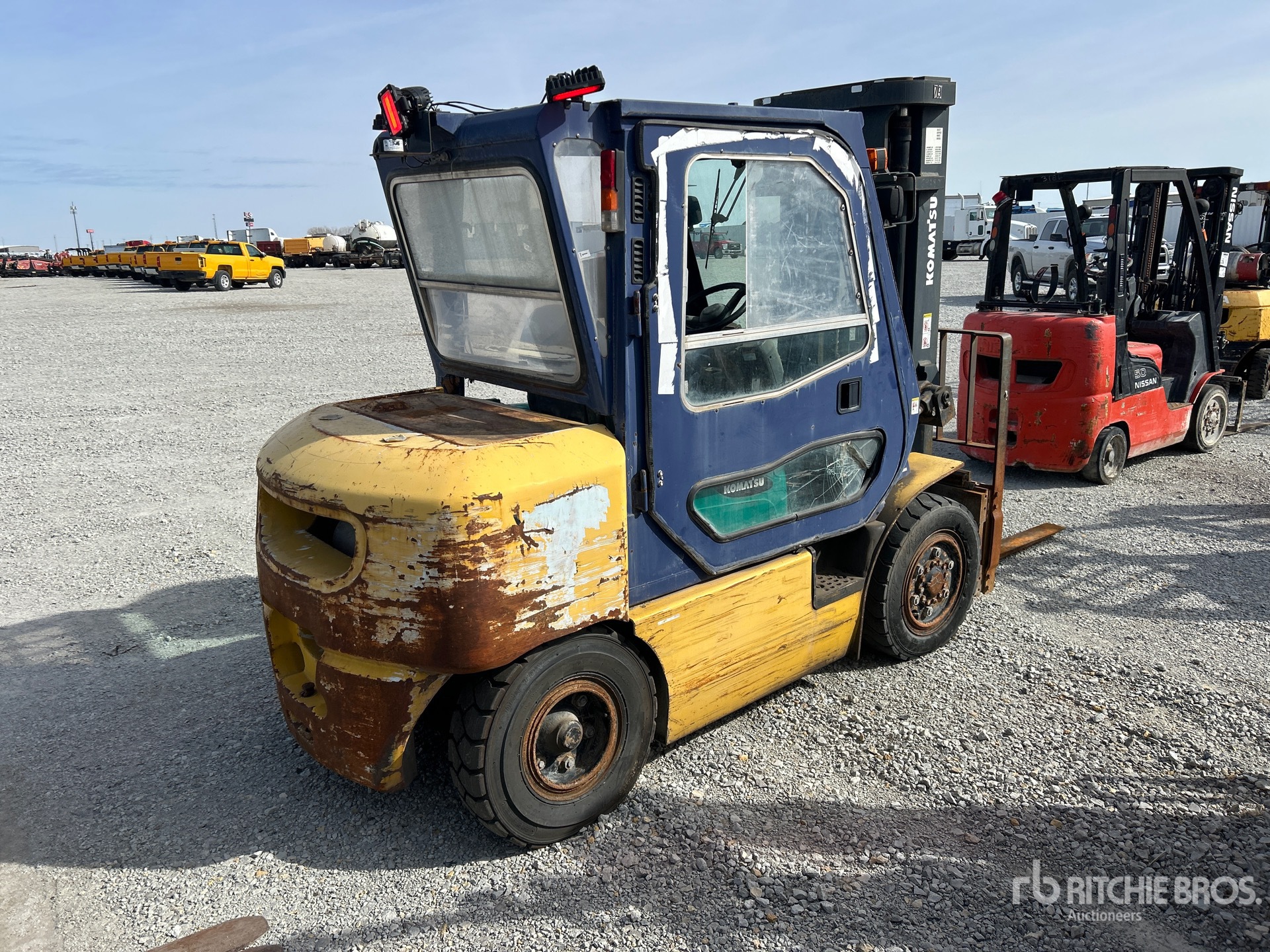 Enclosed Cab, 3 Stage Mast, 197 in Max Lift Height, 90 in Lowered Mast Height, 50 in Forks, Side Shift, 2003 US EPA Label, Komatsu 6D102E 6 Cylinder Diesel Engine
