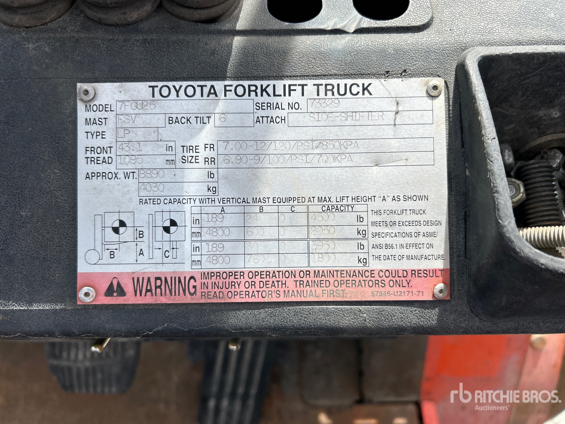 The detailed equipment information is limited in scope, and Ritchie Bros. Auctioneers has not inspected any aspects or components of the equipment other than those expressly set forth herein. Unless expressly stated, we make no representations or warranties, express or implied, concerning the equipment or its components, including without limitation any representations or warranties concerning functionality, conformity or compliance with any safety standard or requirement of any applicable authority or regulatory body, fitness for any particular purpose, or merchantability. You are strongly advised to perform your own detailed inspection of the equipment prior to bidding.