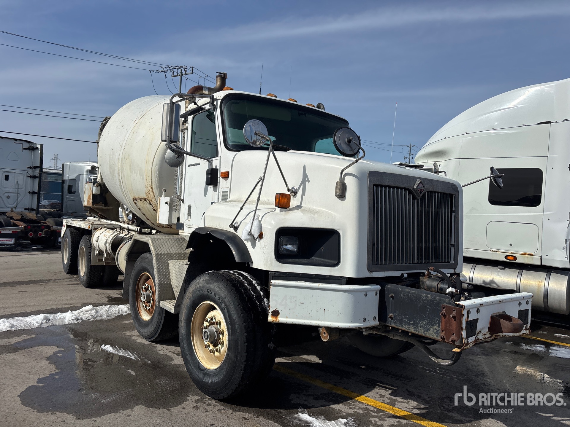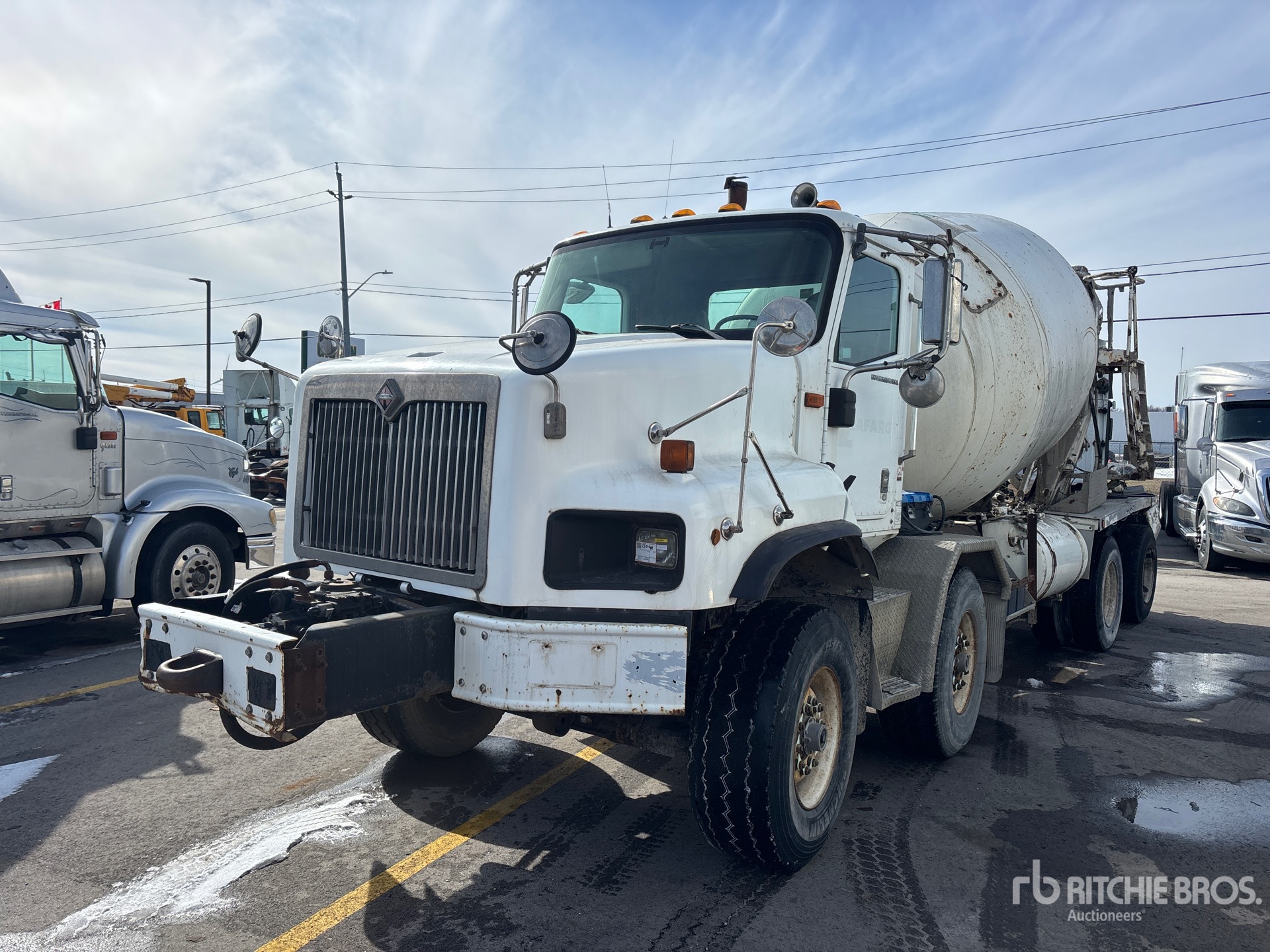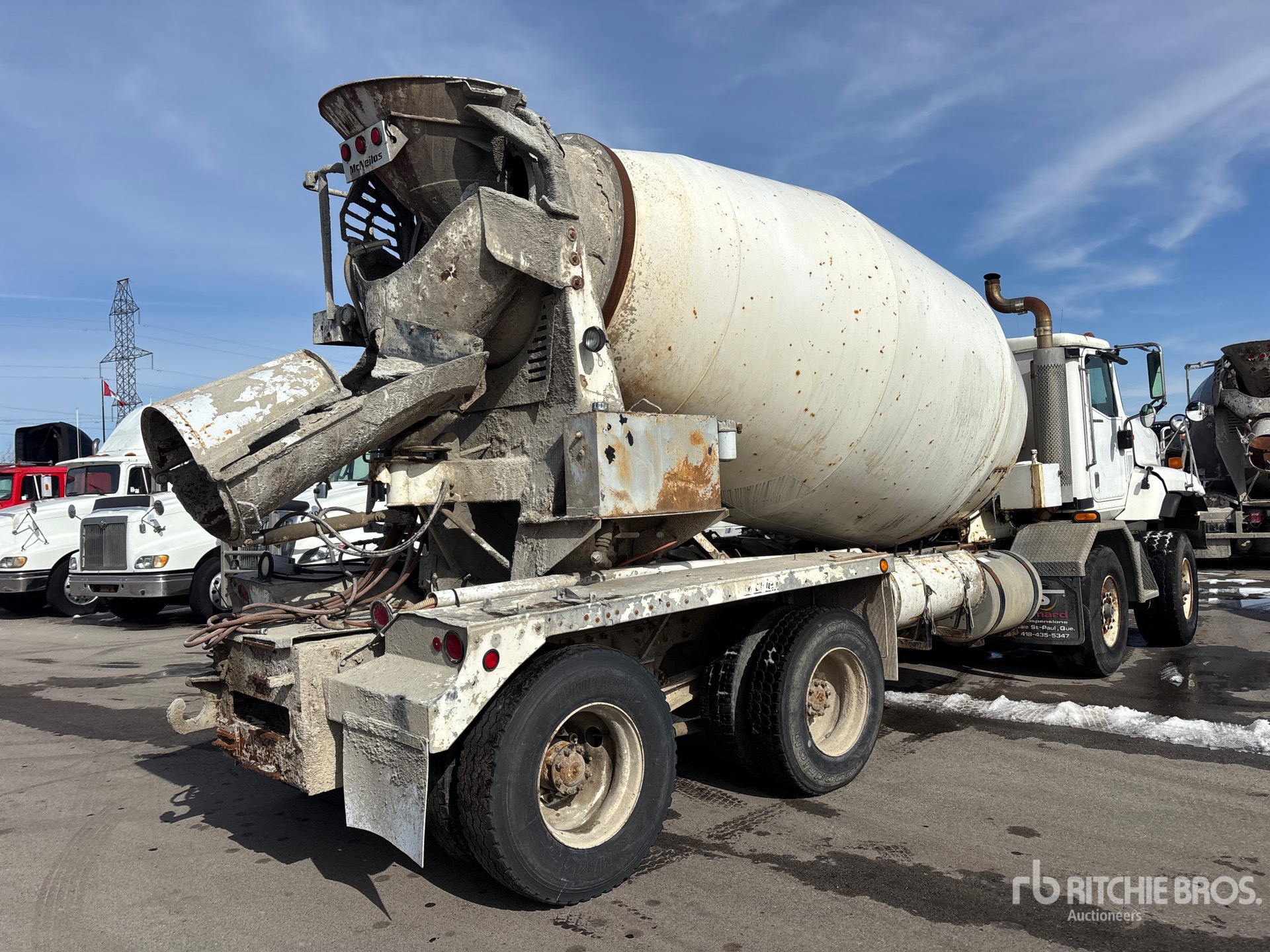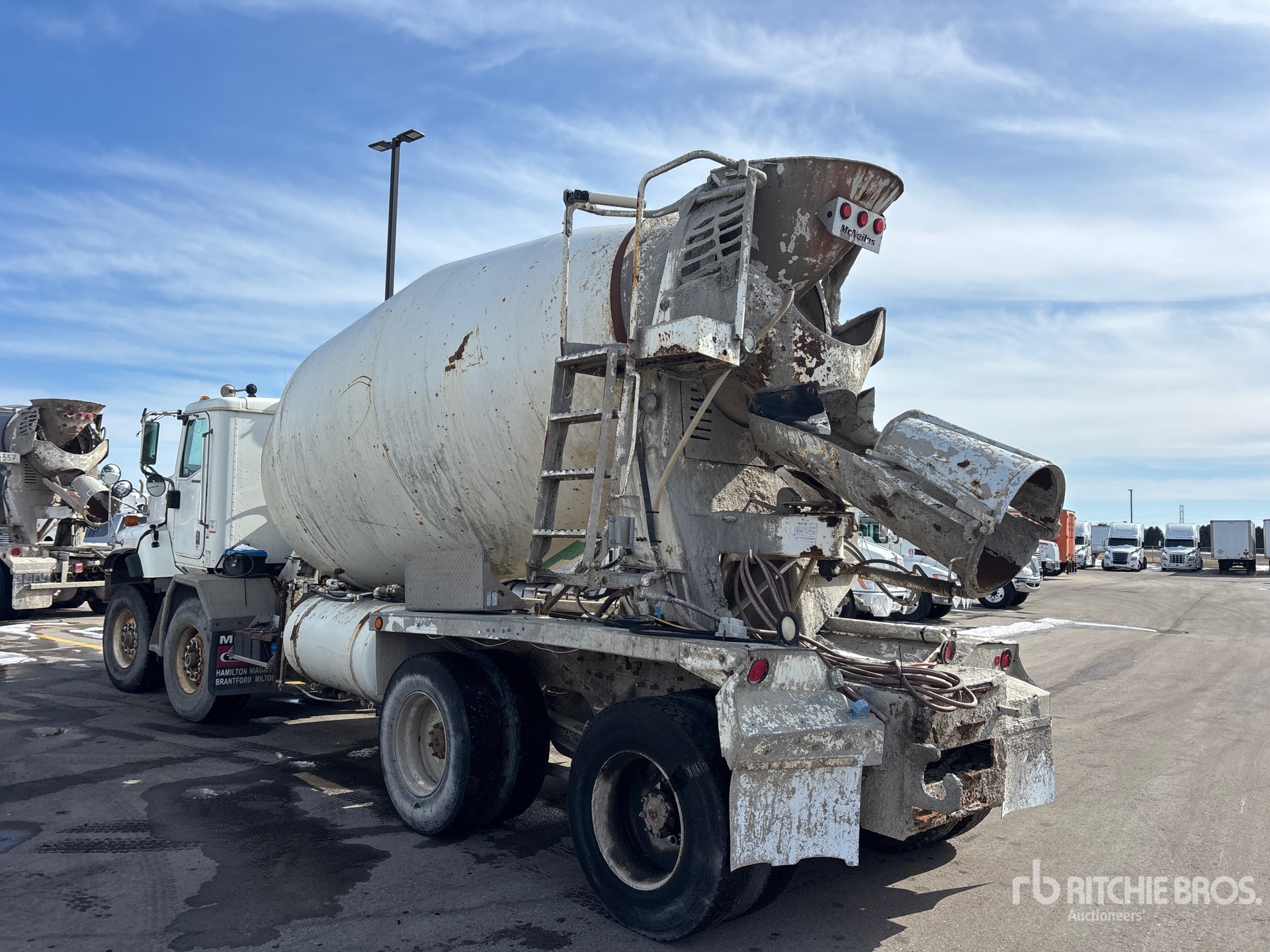 Cummins ISM 350V 6 Cylinder 10.8 L Diesel 335 hp Engine, 2005 US EPA Label, CARB Compliant, 18591 Engine hrs, Eaton Fuller 9LL Manual Transmission, Differential Lock, 20000 lb Front Axle, 46000 lb Rears, 80000 lb GVWR, Air Ride Cab, 425/65R22.5 Front Tires, 11R22.5 Rear Tires, Dual Steering Boxes, Rubber over Walking Beam Suspension, 266 in Wheelbase, McNeilus 9.9 m3 Mixer Unit, 3 Removable Chutes