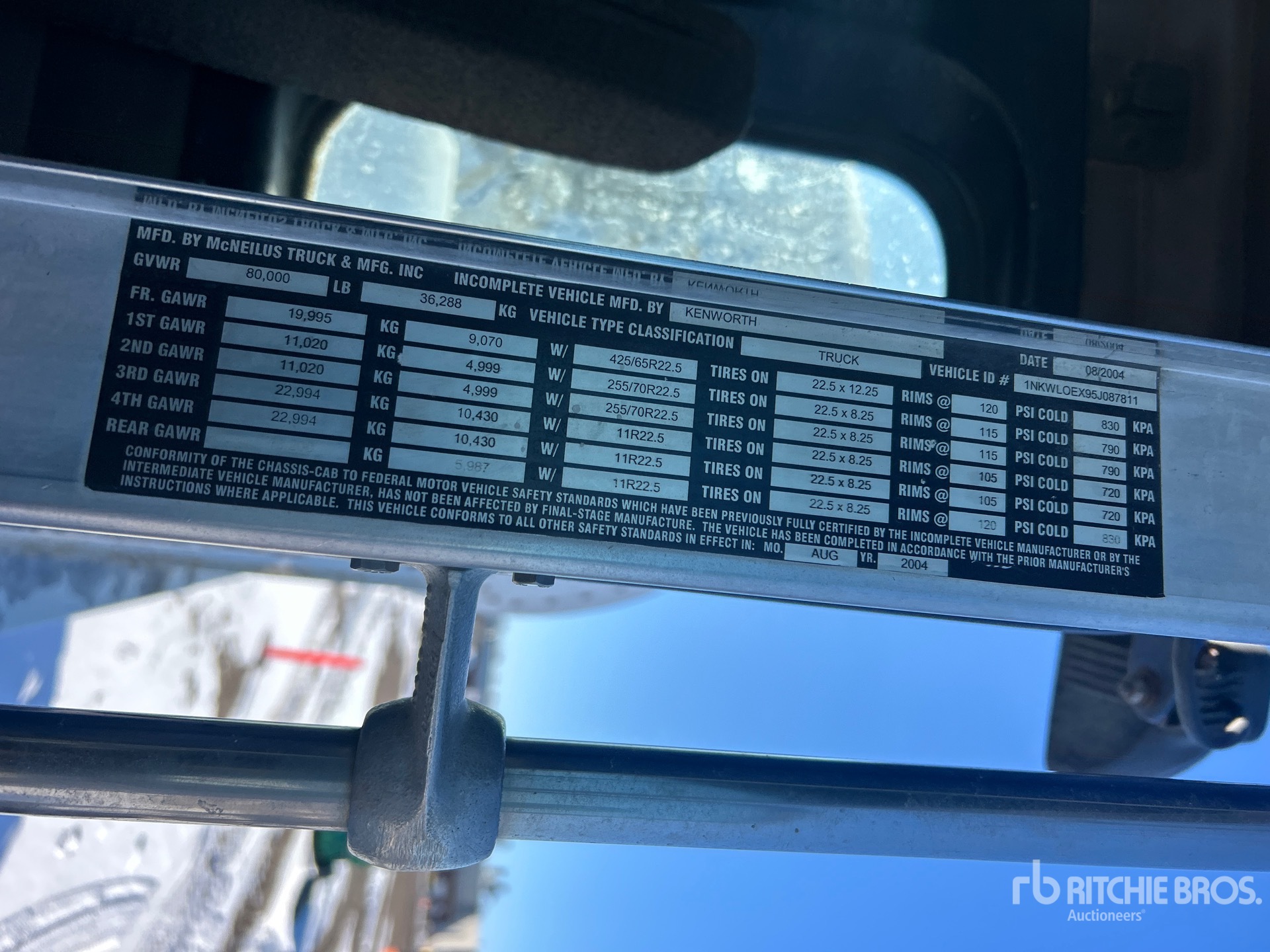Cummins ISM320V 6 Cylinder 10.8 L 305 hp Engine, 2004 US EPA Label, Eaton Fuller 8LL Manual Transmission, Double Differential Locks, 20000 lb Front Axle, 46000 lb Rears, 80000 lb GVWR, Air Ride Cab, Aluminum Front Wheels, 425/65R22.5 Front Tires, 11R22.5 Rear Tires, 2 Steerable Air Lift Pusher Axle, Air Lift Tag Axle, Rubber over Walking Beam Suspension, 248 in Wheelbase, PTO, McNeilus 11 cyd Mixer Unit, 1 Removable Chutes
