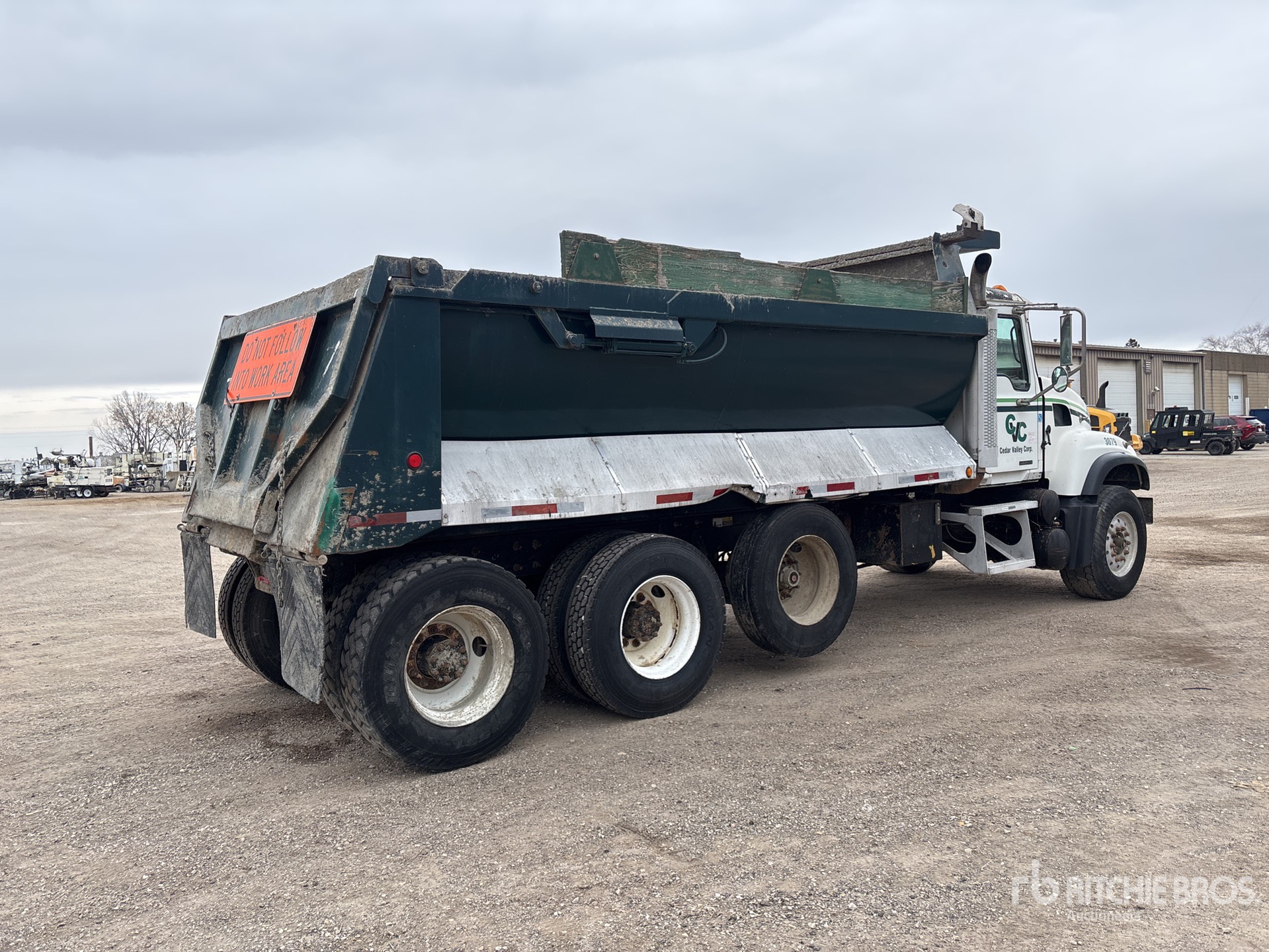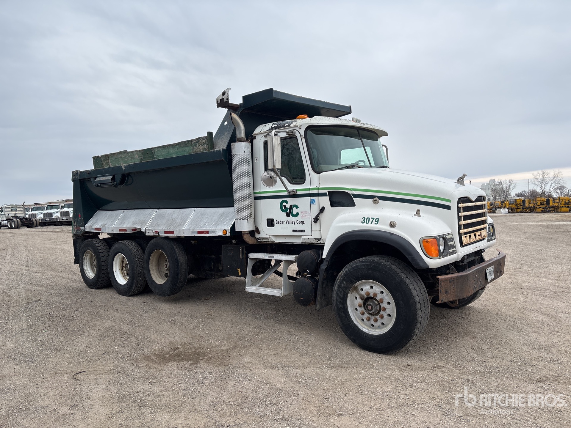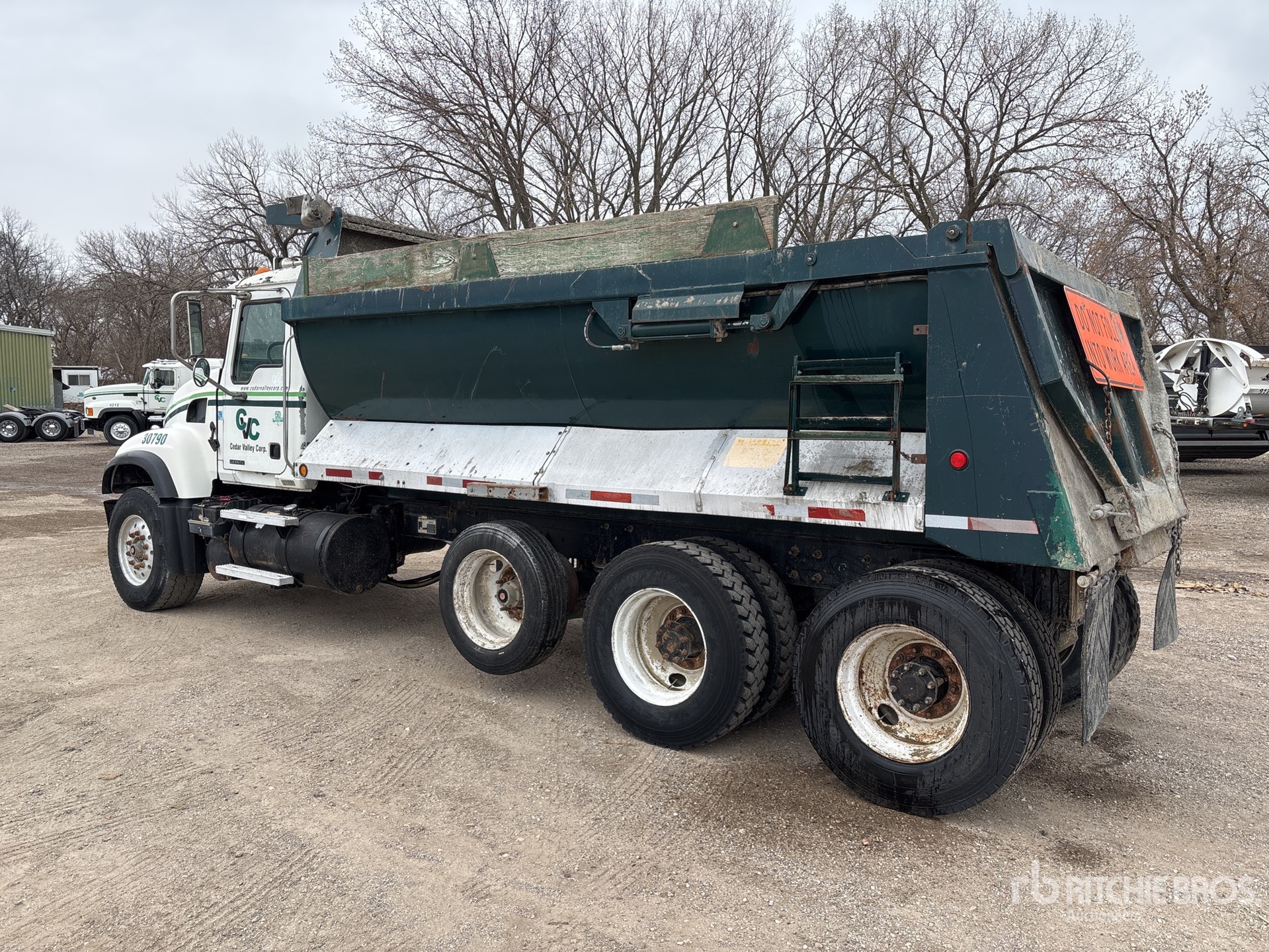 Mack 6 Cylinder 11.9 L Diesel 335 hp Engine, Mack tm308 8-Speed Manual Transmission, 385/65R22.5 Front Tires, 11R22.5 Rear Tires, Air Lift Pusher Axle, Spring Suspension, 238 in Wheelbase, PTO, 16 ft Long x 3 ft 10 in High Steel Body, Round Bottom, High-Lift Tailgate