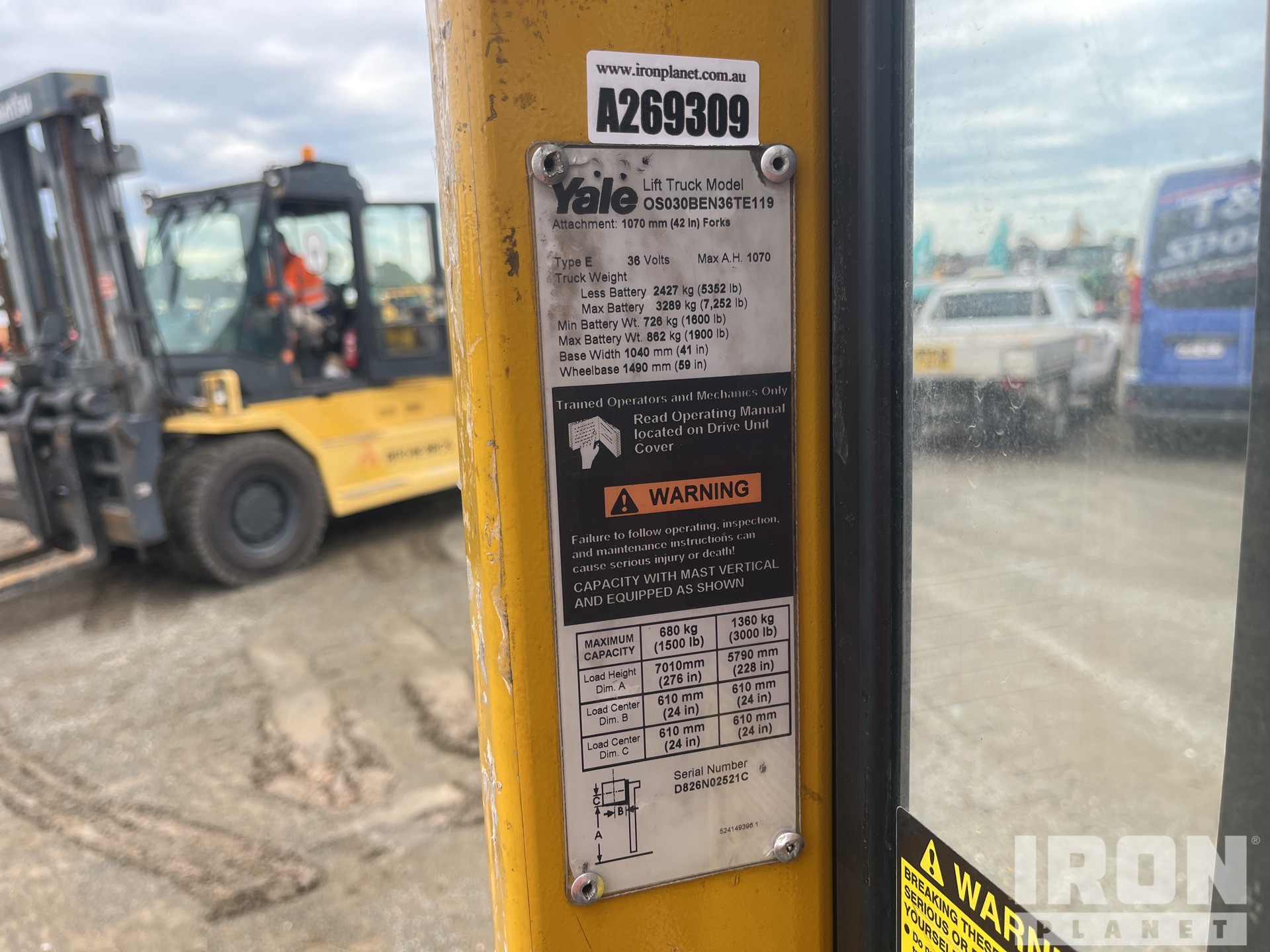 3 Stage Mast, 7010 mm Max Lift Height, 3100 mm Lowered Mast Height, 1100 mm Forks, 36 V, Battery Charger, A269309