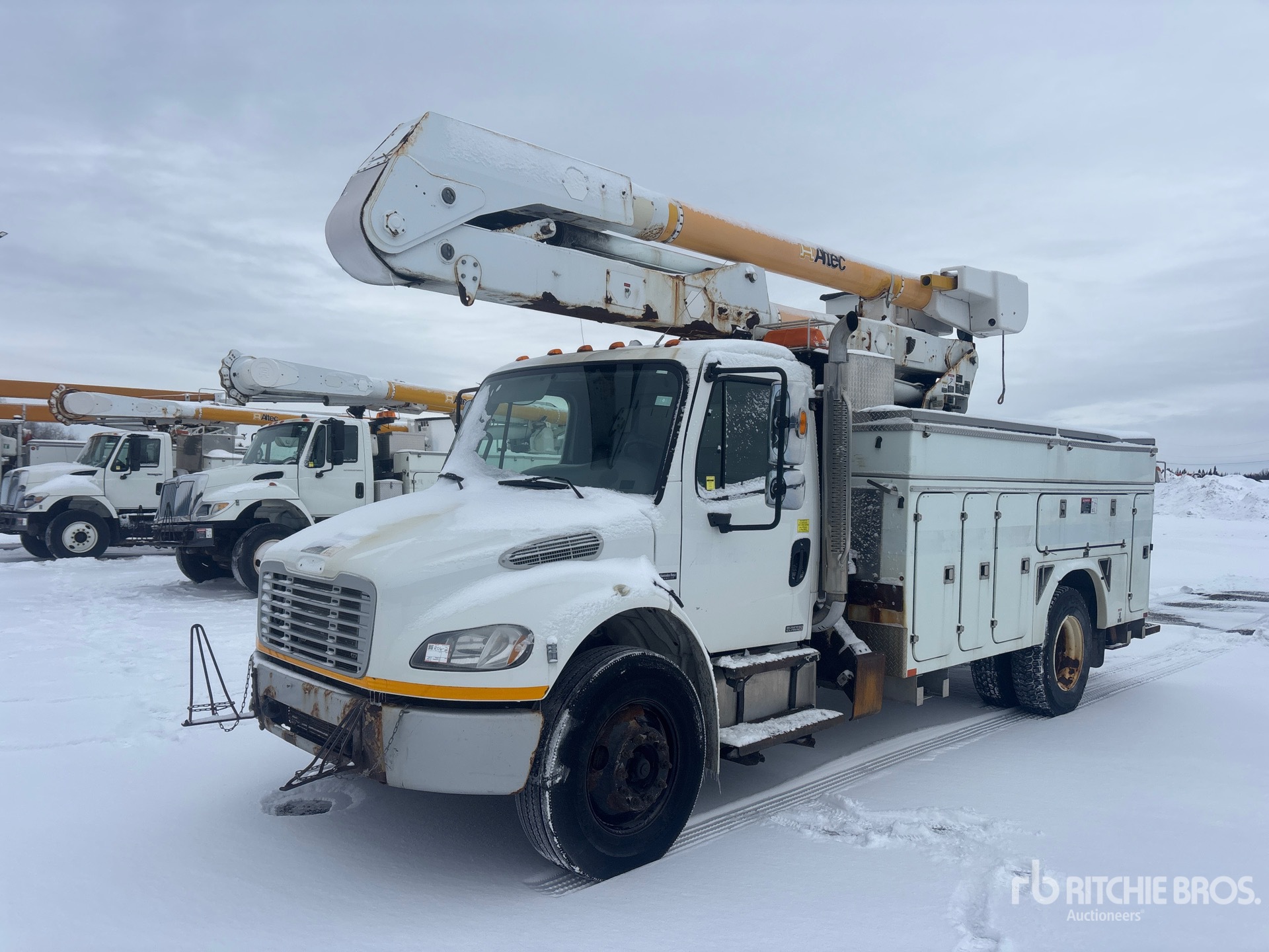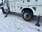 Mercedes Benz 6 Cylinder 6.4 L Diesel Engine, 11206 Engine hrs, Allison 3500 Automatic Transmission, 12000 lb Front Axle, 23000 lb Rears, 6.43:1 Axle Ratio, 35000 lb GVWR, Air Ride Cab, 11R22.5, Spring Suspension, 188 in Wheelbase, PTO, 400 lb Capacity, Center Mounted, One-Person Articulated Boom, Utility Body, Boom Tip Mounted Winch, A-Outriggers, Rear Outriggers, Air Hose Reel, 14 ft 3 in x 98 in Bed, Pintle Hitch