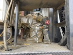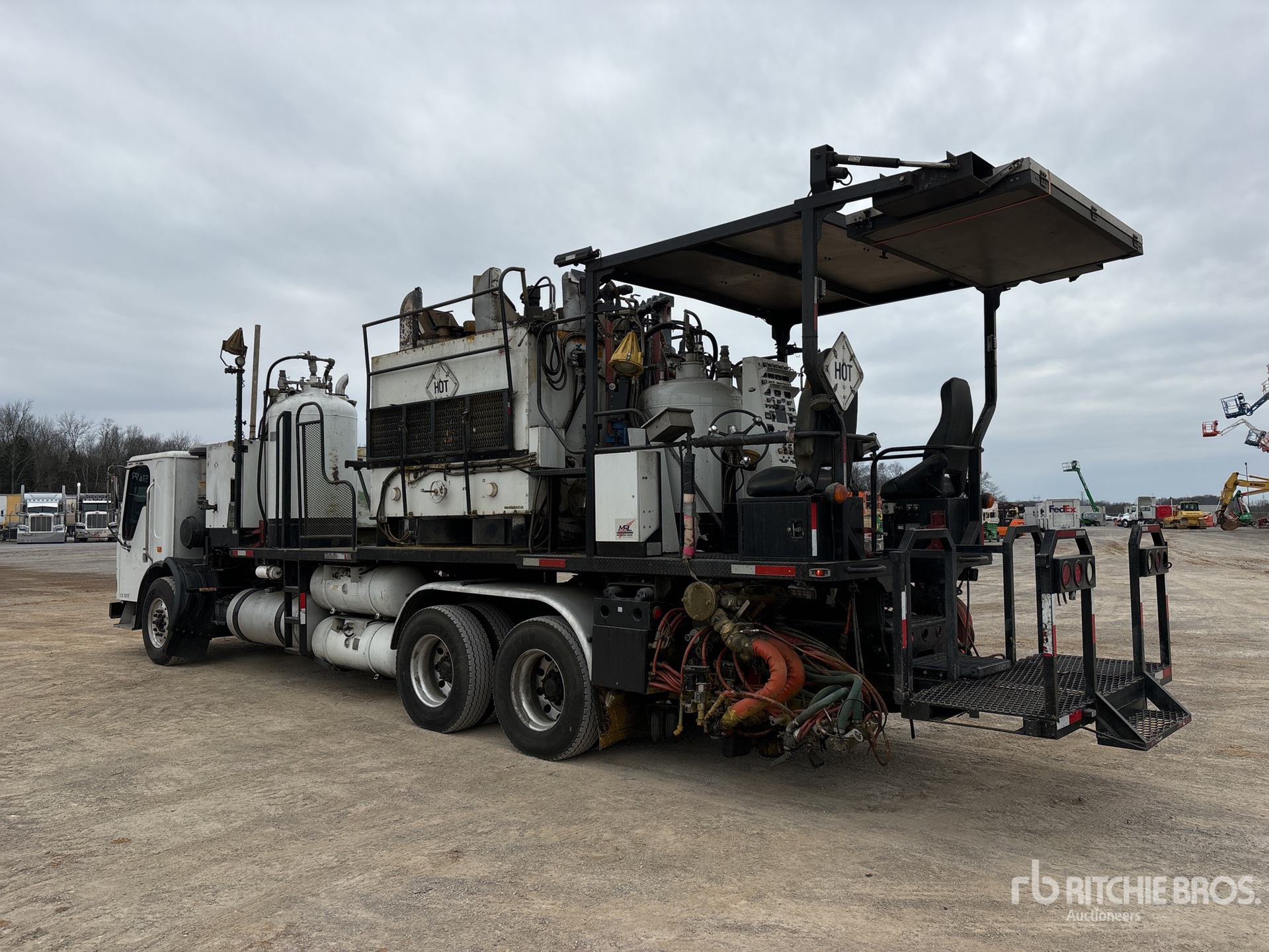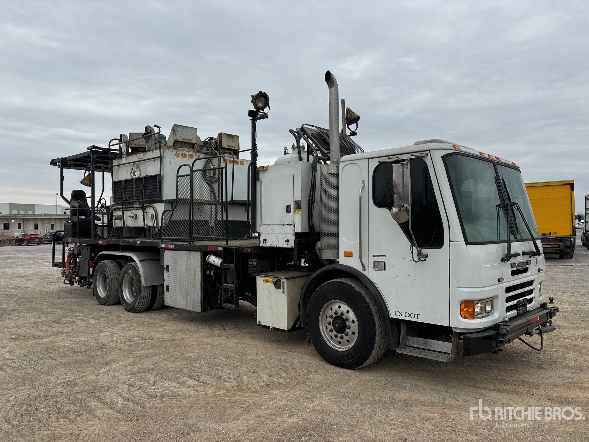 Cat C11 6 Cylinder Diesel Engine, 15998 Engine hrs, Allison 4000 Automatic Transmission, 18740 lb Front Axle, 46000 lb Rears, 64740 lb GVWR, Aluminum Wheels, 385/65R22.5 Front Tires, 11R22.5 Rear Tires, Dual Steering Boxes, Double Frame, Airliner Air Ride Suspension, 236 in Wheelbase, Dual Steering, Dual Paint Controls, Arrow Board, Sullair 250 cfm Air Compressor, John Deere Auxiliary Engine