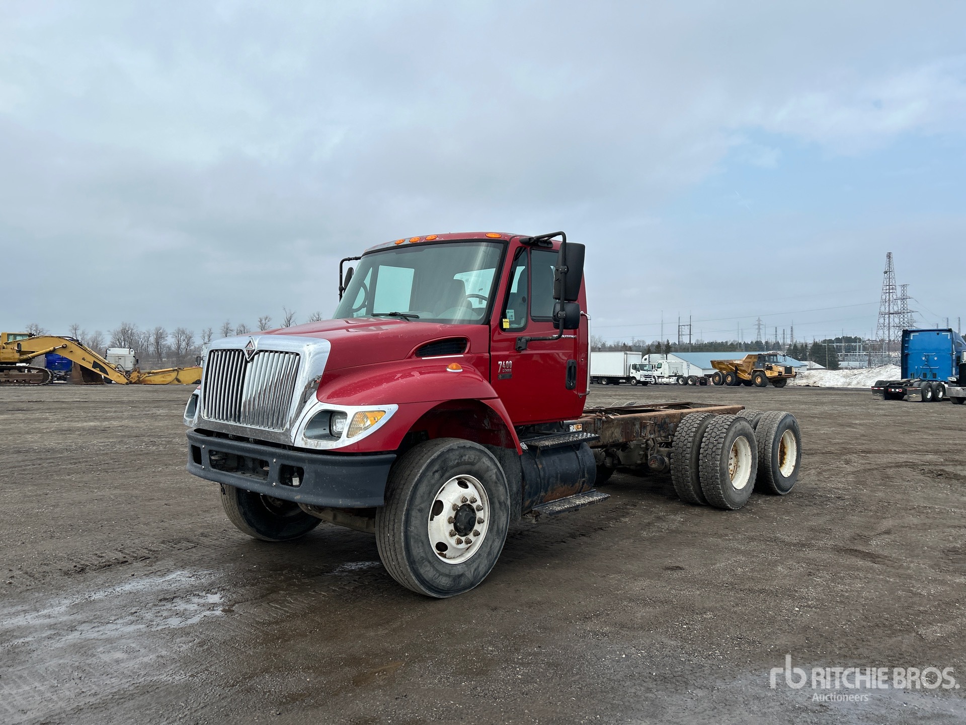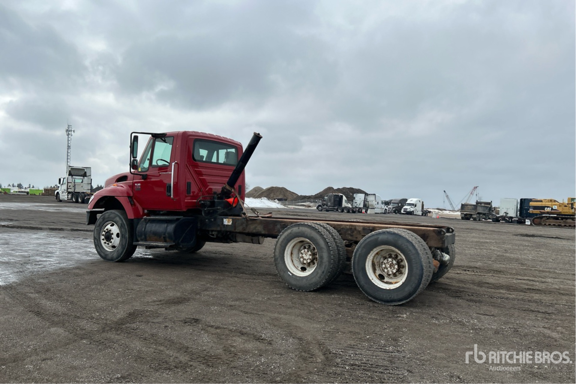 International DT466 6 Cylinder 7.6 L Diesel 260 hp Engine, 2005 US EPA Label, CARB Compliant, 16713 Engine hrs, Eaton Fuller 8LL Manual Transmission, Differential Lock, 16000 lb Front Axle, 40000 lb Rears, 56000 lb GVWR, Air Ride Cab, 315/80R22.5 Front Tires, 11R22.5 Rear Tires, Dual Steering Boxes, Double Frame, Spring over Walking Beam Suspension, 201 in Wheelbase, PTO, 132 in Cab to Axle, 184 in Cab to End of Frame