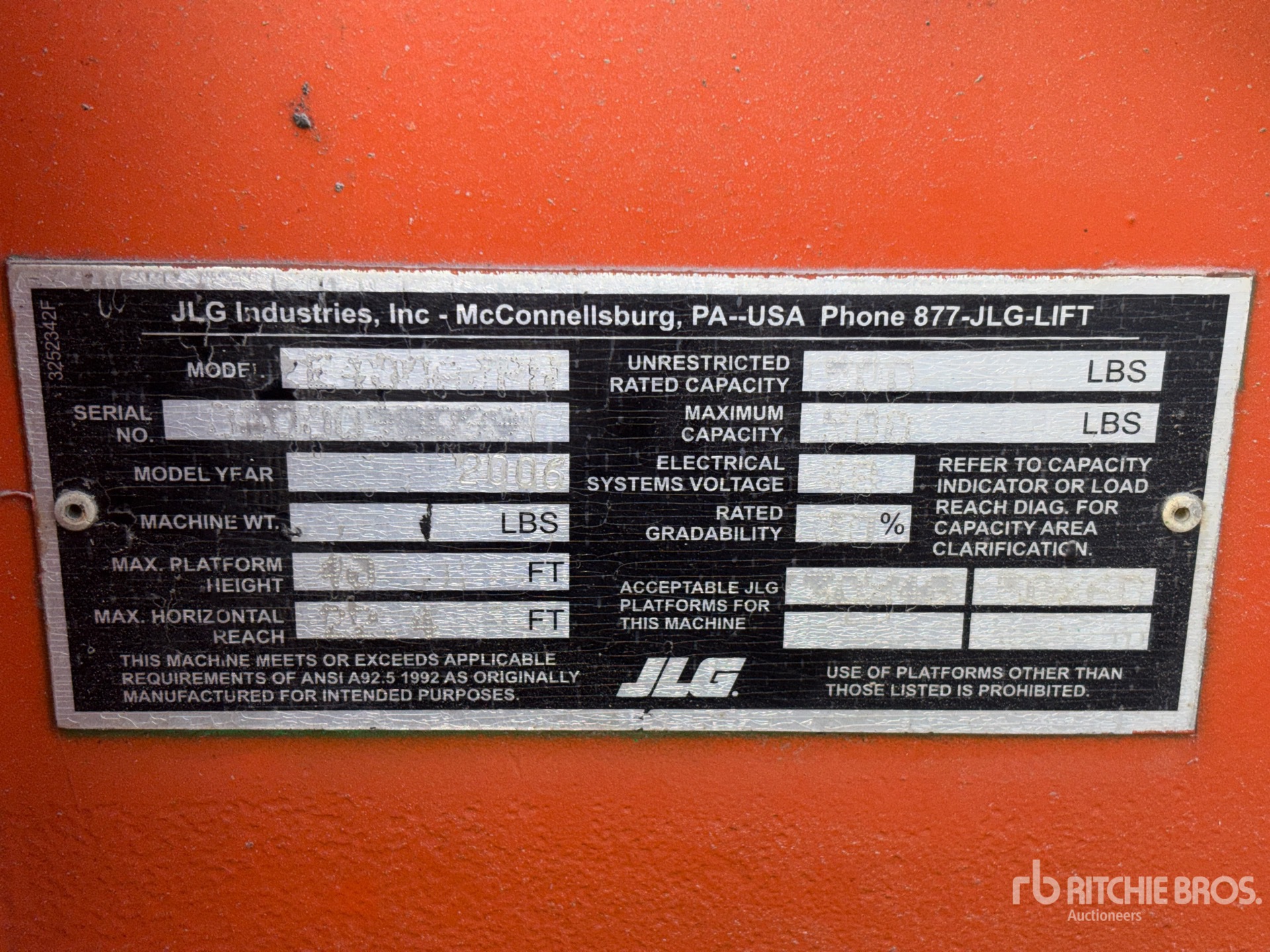 40 ft Max Platform Height, 500 lb Max Weight Capacity, Jib, Power to Platform, 25x7-12 Non-Marking Tires
