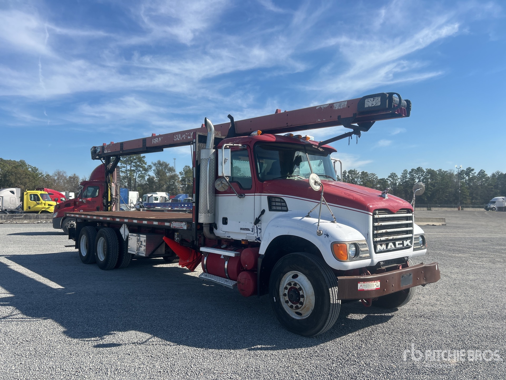 Located in Lane 36 Spot 47, Mack 6 Cylinder Diesel Engine, 21216 Engine hrs, Eaton Fuller Manual Transmission, 11R22.5, Spring Suspension, 268 in Wheelbase, PTO, 24 ft x 95 in Bed, Forklift Mount Kit