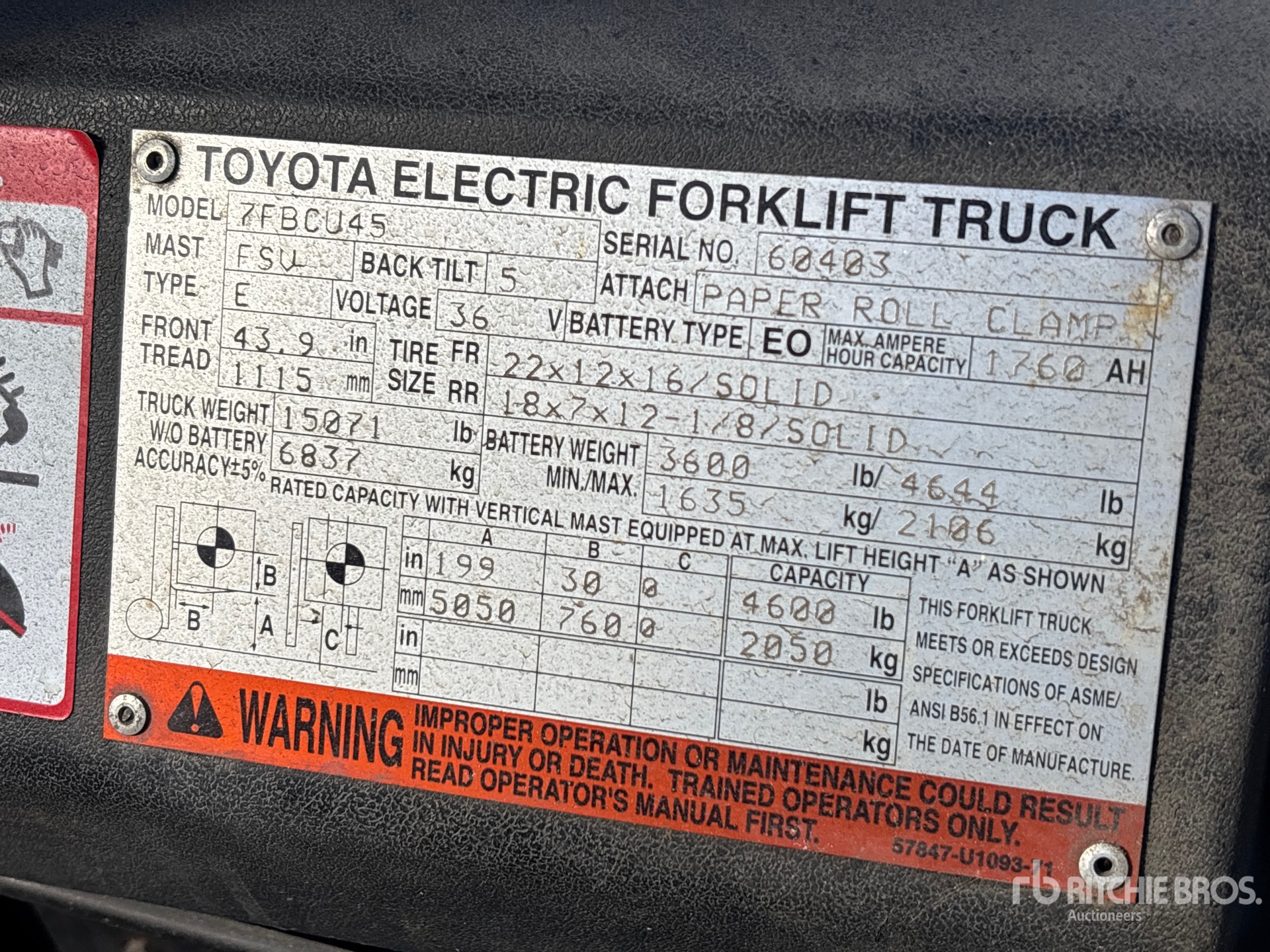 The detailed equipment information is limited in scope, and Ritchie Bros. Auctioneers has not inspected any aspects or components of the equipment other than those expressly set forth herein. Unless expressly stated, we make no representations or warranties, express or implied, concerning the equipment or its components, including without limitation any representations or warranties concerning functionality, conformity or compliance with any safety standard or requirement of any applicable authority or regulatory body, fitness for any particular purpose, or merchantability. You are strongly advised to perform your own detailed inspection of the equipment prior to bidding.
