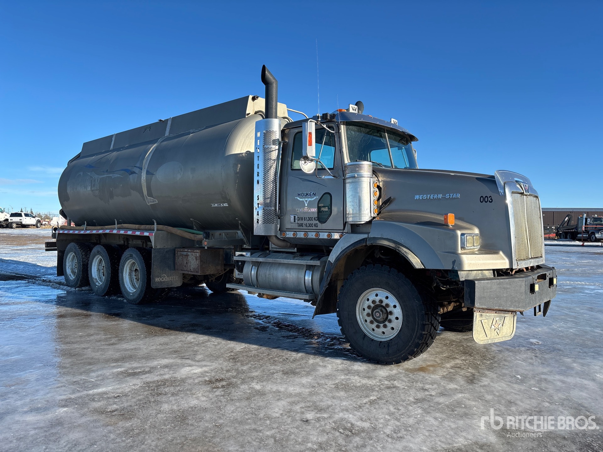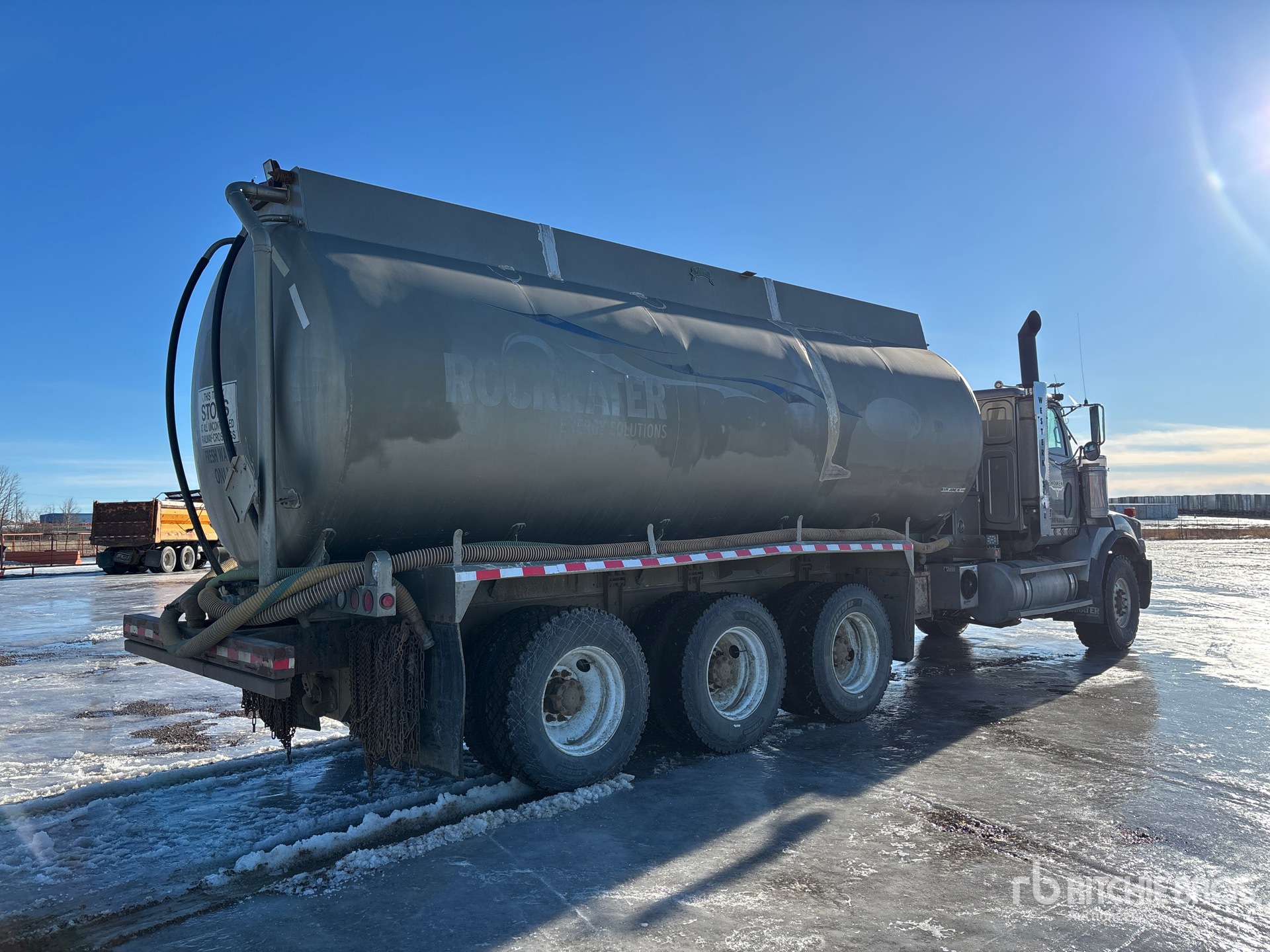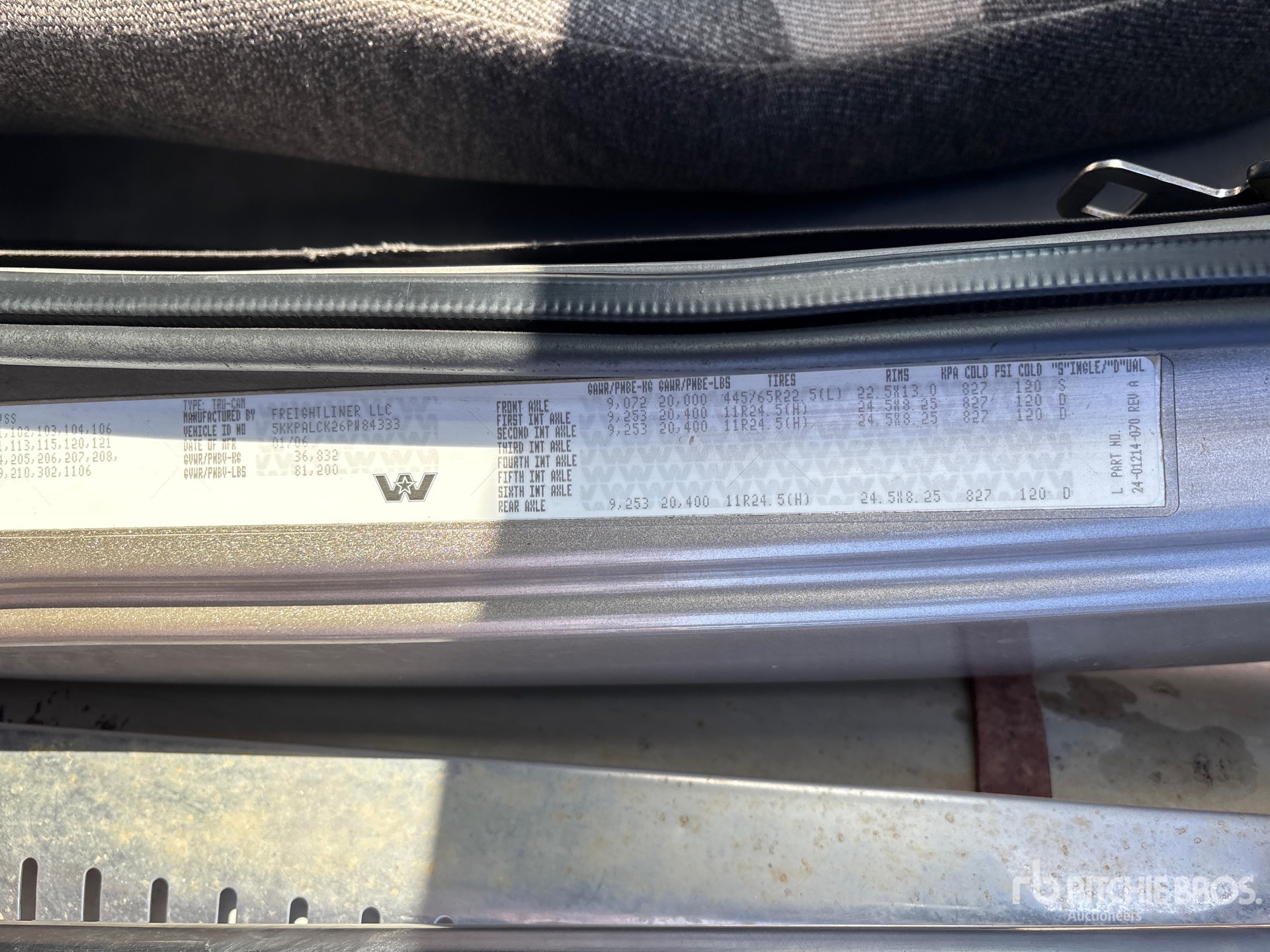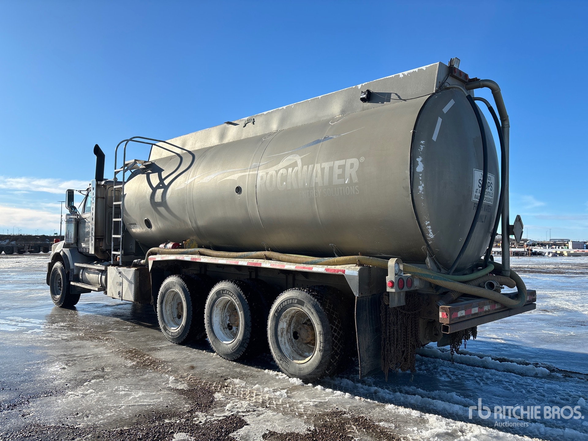 Detroit Series 60 6 Cylinder 14 L Diesel 515 hp Engine, 2006 US EPA Label, CARB Compliant, Positive Air Shutoff, 28470 Engine hrs, Engine Brake, Eaton Fuller RTLO-16918B 18-Speed Manual Transmission, Triple Differential Locks, 20000 lb Front Axle, 61200 lb Rears, Meritor RZ-166 Drive Axles, 4.89:1 Axle Ratio, 81200 lb GVWR, Aluminum Front Wheels, 445/65R22.5 Front Tires, 11R24.5 Rear Tires, Double Frame, Airliner Air Ride Suspension, 272 in Wheelbase, PTO, 2001 Wabash 24970 L Steel Tank, Tank Lining, Catwalk, Hydraulic Driven Pump, Dribble Bar