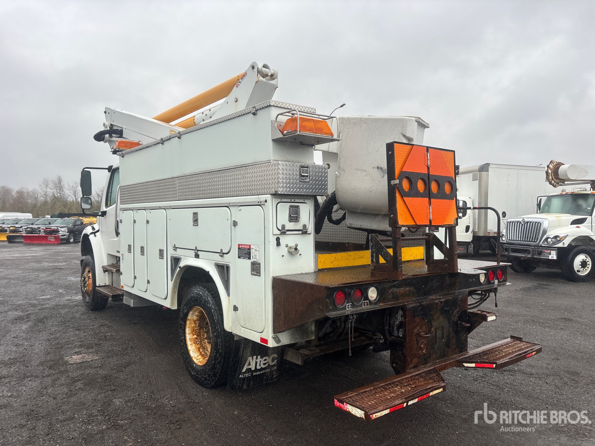 Mercedes Benz MBE900-250 6 Cylinder 7.2 L Diesel Engine, 150677 Engine hrs, Allison 3000 Automatic Transmission, 13000 lb Front Axle, 20000 lb Rears, 5.88:1 Axle Ratio, 33000 lb GVWR, Air Ride Cab, 11R22.5, Spring Suspension, 182 in Wheelbase, PTO, 400 lb Capacity, Center Mounted, Insulated Articulated Boom, Utility Body, A-Outriggers, Air Hose Reel, 14 ft 8 in x 95 in Bed
