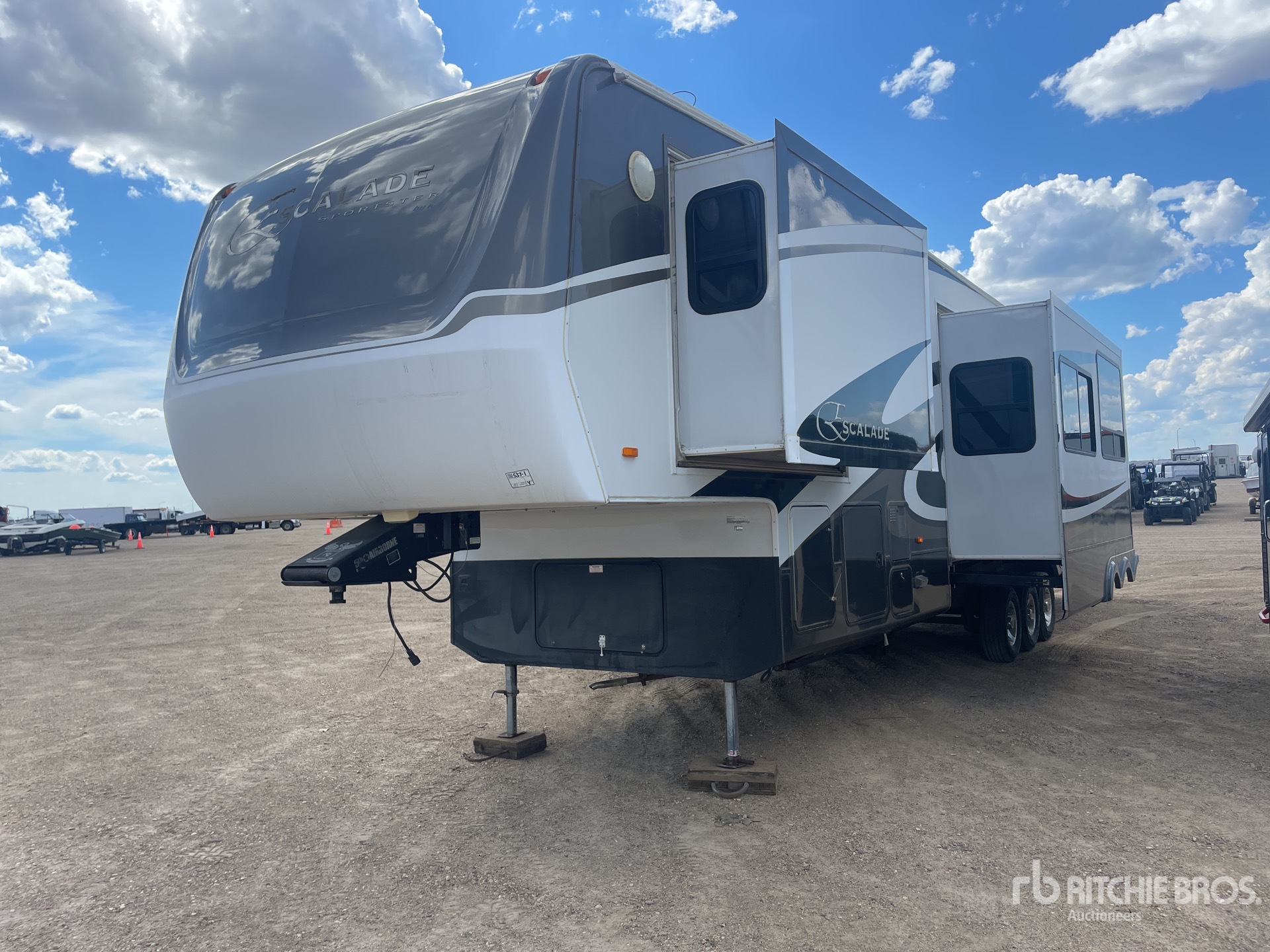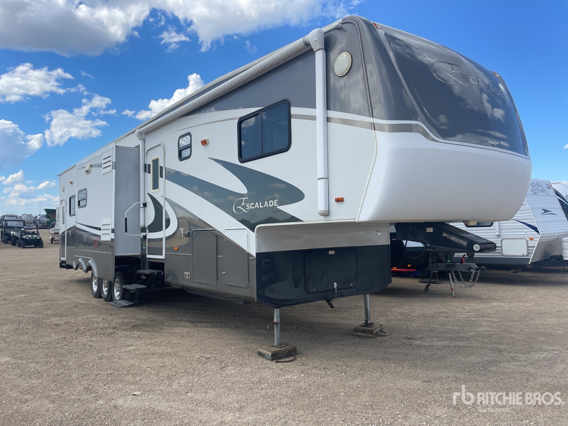 Air Conditioner, Clothes Washer & Dryer, 3 Slide Outs, Power Leveling Jacks, Power Awning, Onan Marquis Gold 5.5 kVA Generator, 5th Wheel, Spring Suspension, Electric Brakes, 235/85R16 Tires