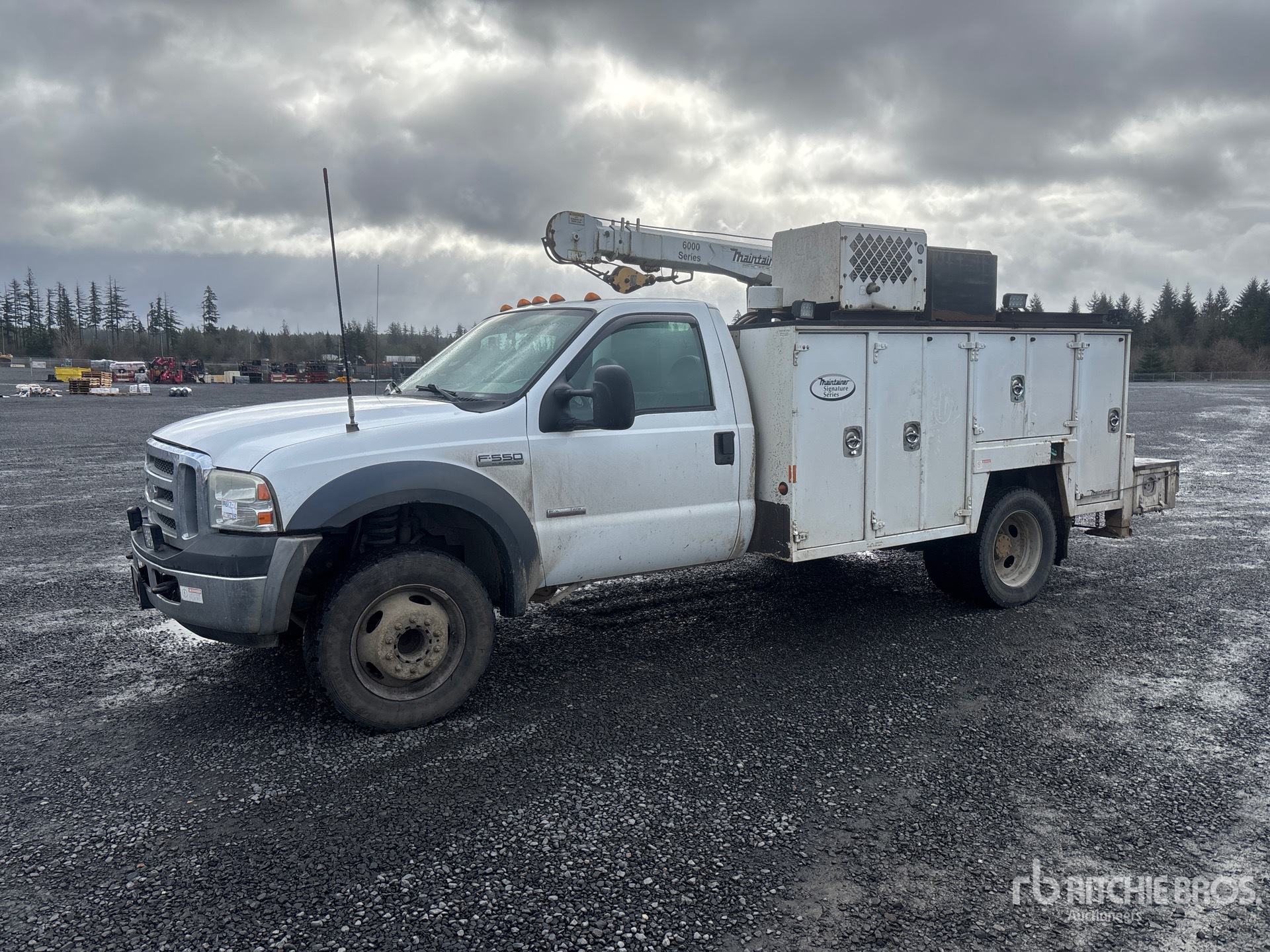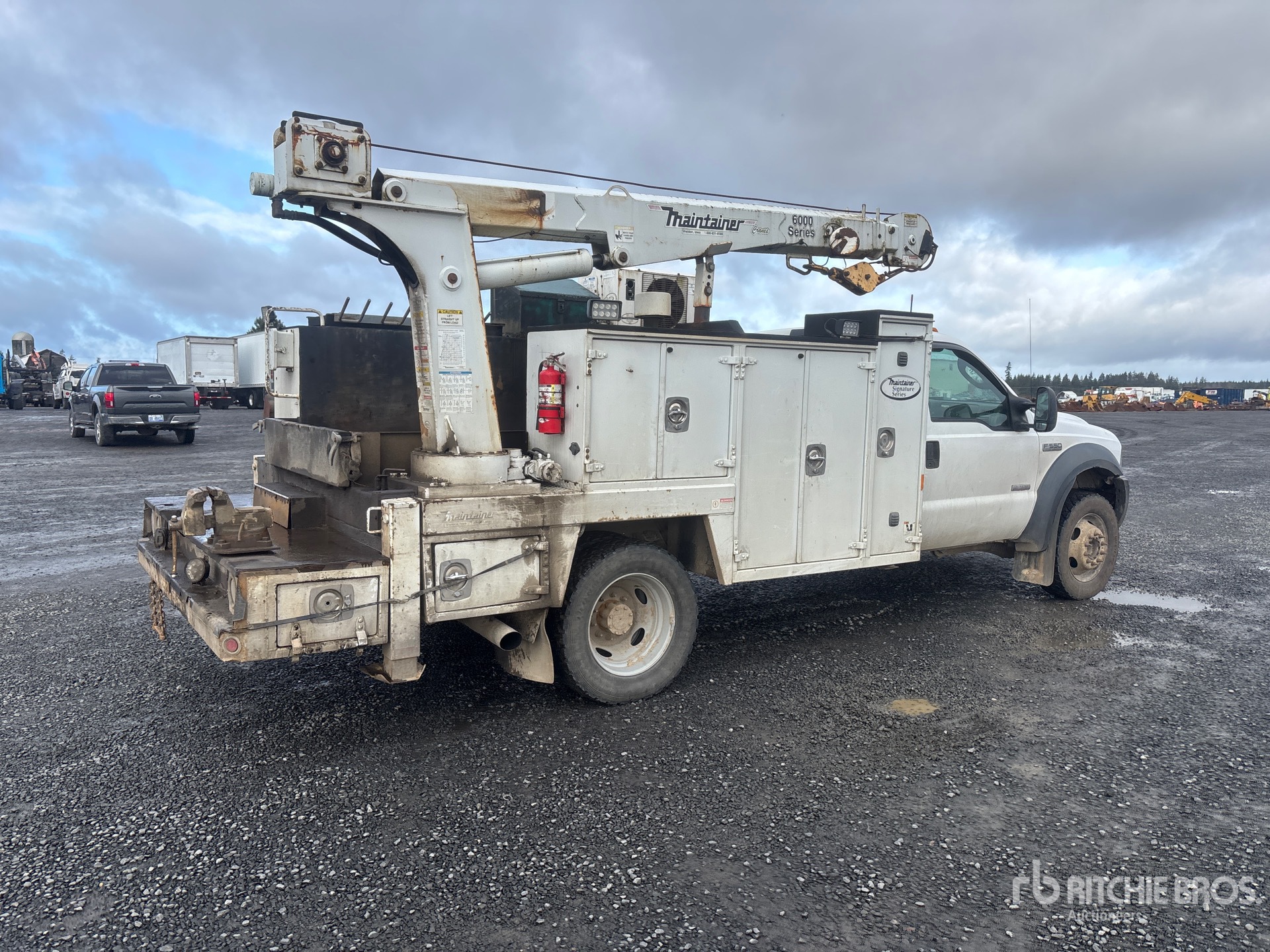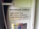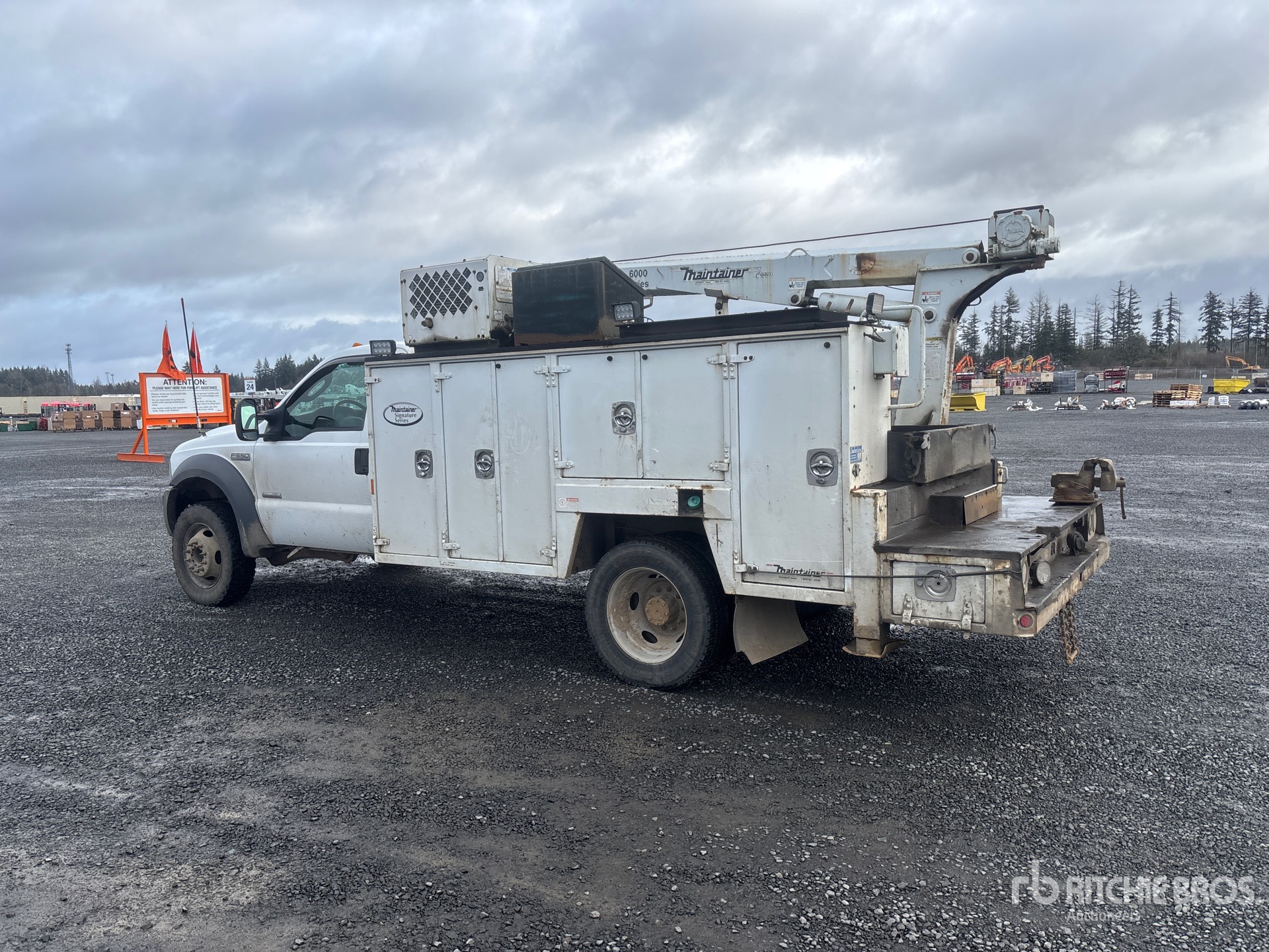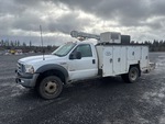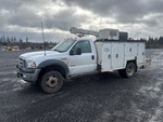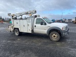 Located in Lane 9 Spot 16, Ford Powerstroke V8 Diesel Engine, 1999 US EPA Label, Manual Transmission, 6000 lb Front Axle, 13660 lb Rears, 19000 lb GVWR, 245/70R19.5, Spring Suspension, 165 in Wheelbase, PTO, Maintainer 11 ft Body, Hydraulic Stabilizers, Maintainer 6000 Series 6350 lb 3 Section Hydraulic Crane, Wired Remote Control, Ingersoll-Rand VHP40RMH Hydraulic Air Compressor, Air Hose Reel