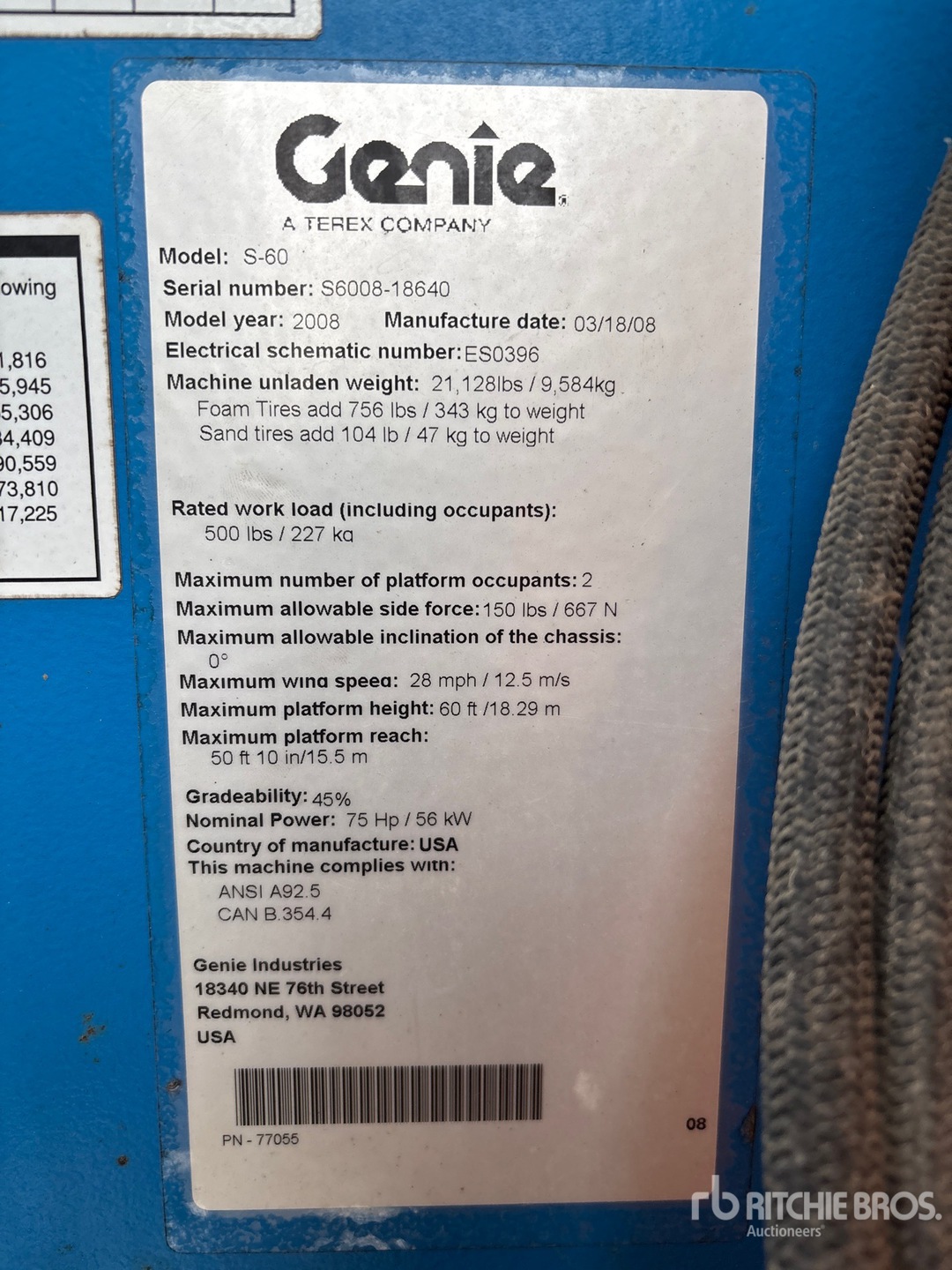 60 ft Max Platform Height, 500 lb Max Weight Capacity, Power to Platform, Onboard Generator, 2007 US EPA Label, EDI 4 Cylinder 75 hp 2.3 L Dual Fuel Engine, 355/55D625 NHS Foam-Filled Tires