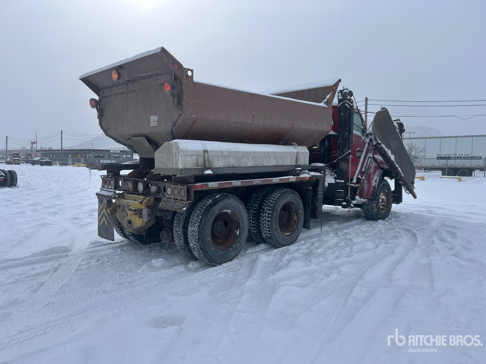 Cummins ISC 330 6 Cylinder 8.3 L Diesel 330 hp Engine, 2007 US EPA Label, 5777 Engine hrs, Eaton Fuller 10-Speed Manual Transmission, Differential Lock, 20000 lb Front Axle, 40000 lb Rears, 27216 kg GVWR, Air Ride Cab, 425/65R22.5 Front Tires, 11R22.5 Rear Tires, Dual Steering Boxes, Spring Suspension, 192 in Wheelbase, PTO, 11 ft Snow Wing, Force SSC5100 Steel Spreader, 1 Spinners, In-Cab Controls, 12 ft Long x 3 ft 6 in High Steel Body, Rear Hydraulics