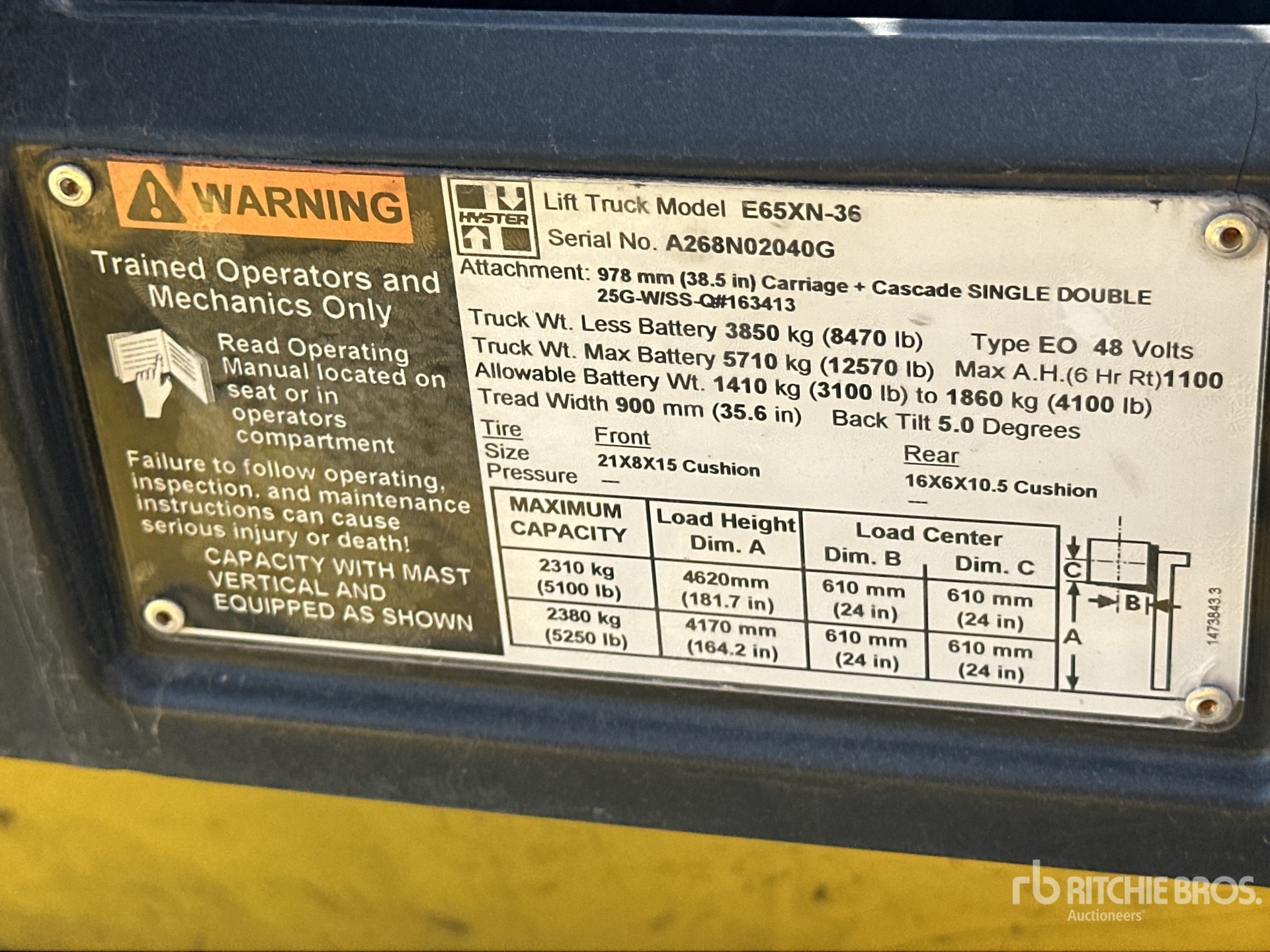 The detailed equipment information is limited in scope, and Ritchie Bros. Auctioneers has not inspected any aspects or components of the equipment other than those expressly set forth herein. Unless expressly stated, we make no representations or warranties, express or implied, concerning the equipment or its components, including without limitation any representations or warranties concerning functionality, conformity or compliance with any safety standard or requirement of any applicable authority or regulatory body, fitness for any particular purpose, or merchantability. You are strongly advised to perform your own detailed inspection of the equipment prior to bidding.