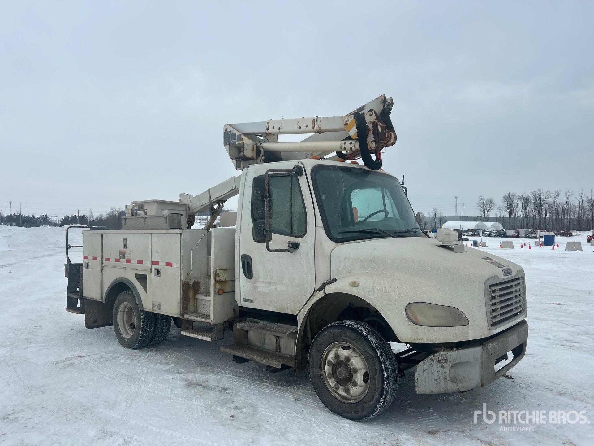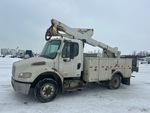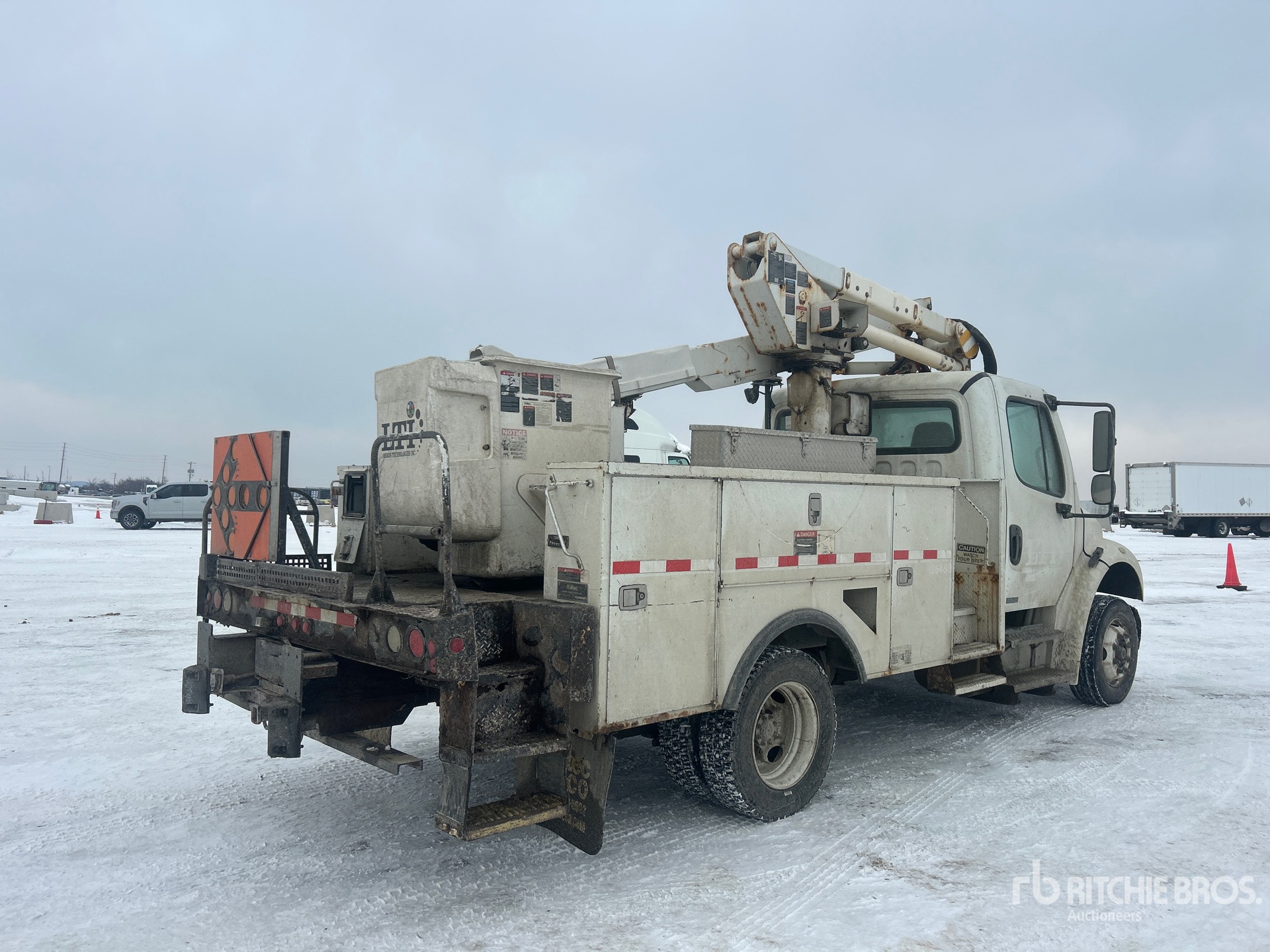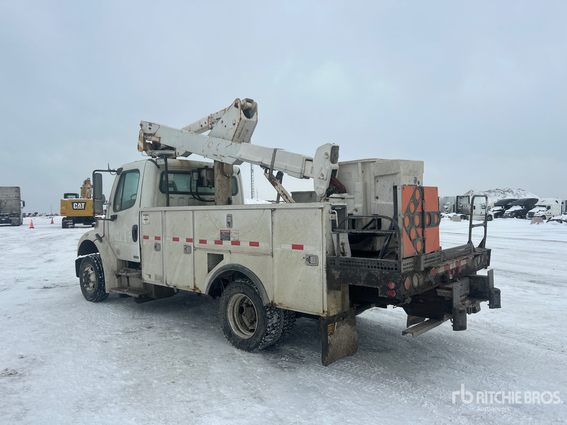 Cummins ISB 6 Cylinder Diesel 240 hp Engine, 2009 US EPA Label, 19000 Engine hrs, Exhaust Brake, Automatic Transmission, Differential Lock, 8000 lb Front Axle, 15000 lb Rears, 19500 lb GVWR, Steel, 245/70R19.5, Spring Suspension, 152 in Wheelbase, PTO, 300 lb Capacity, Center Mounted, Insulated One-Person Articulating-Telescopic Boom, Utility Body, 13 ft 6 in x 94 in Bed