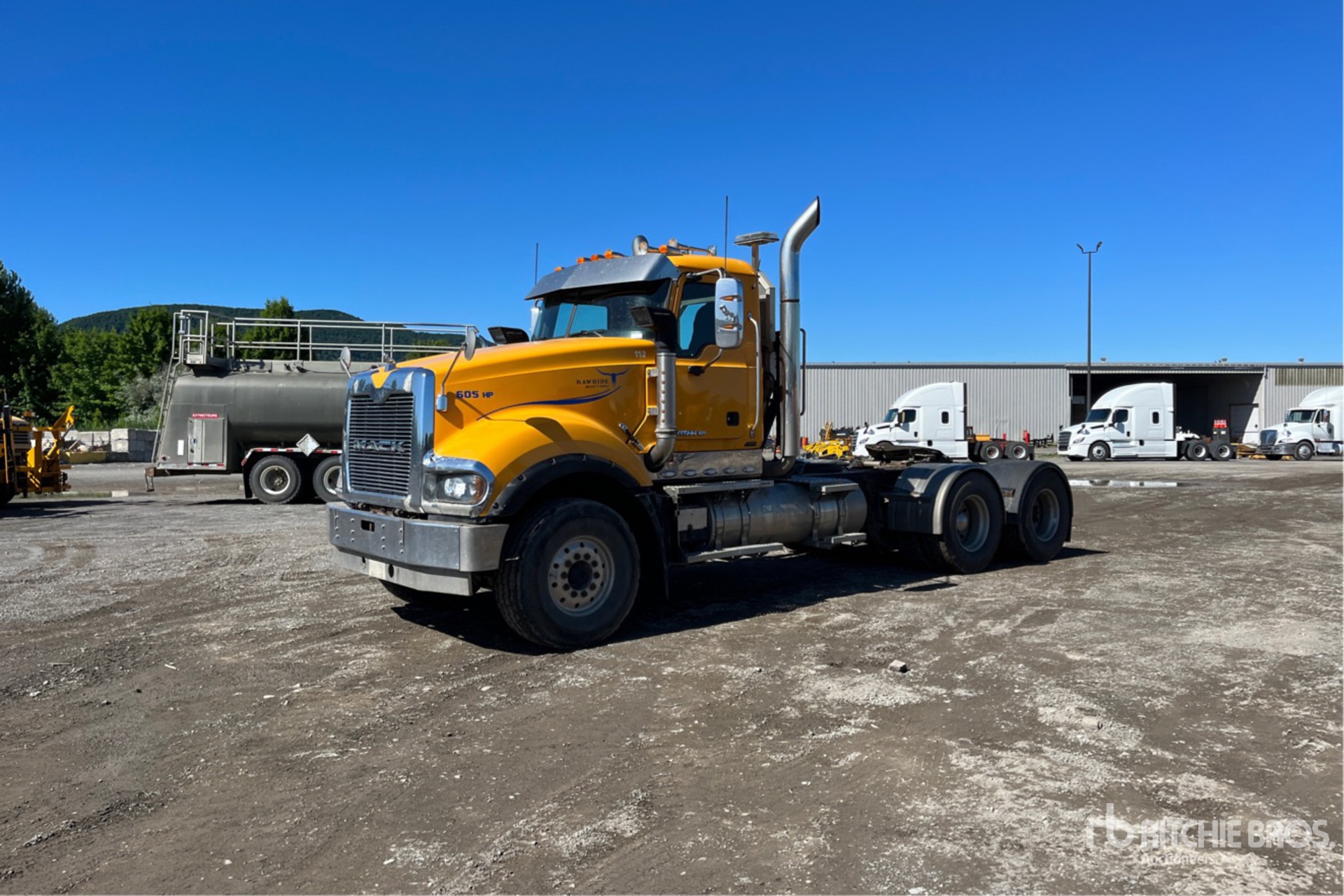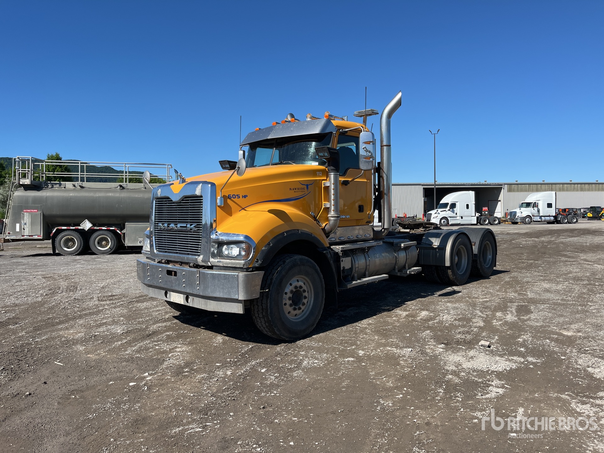 Mack MP10 6 Cylinder 16.1 L Diesel 486 hp Engine, 2009 US EPA Label, Engine Brake, Mack MaxiTorque 18-Speed Manual Transmission, Double Differential Locks, 18000 lb Front Axle, 46000 lb Rears, 29031 kg GVWR, Air Ride Cab, Aluminum Wheels, 425/65R22.5 Front Tires, 315/80R22.5 Rear Tires, Dual Steering Boxes, Neway Air Ride Suspension, 220 in Wheelbase, PTO, Wet Kit, Air Sliding 5th Wheel, Headache Rack