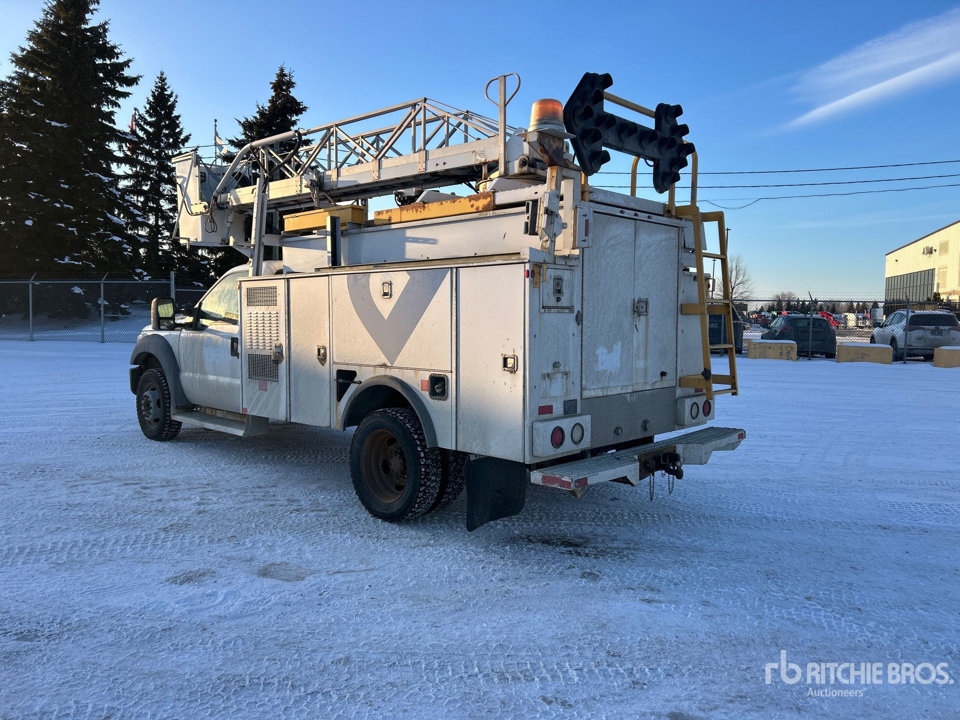 V10 6.8 L Gasoline Engine, 2011 US EPA Label, Automatic Transmission, 5200 lb Front Axle, 12000 lb Rears, 7484 kg GVWR, 225/70R19.5 Front Tires, 225/70R19.5 Rear Tires, Spring Suspension, 165 in Wheelbase, 300 lb Capacity, Rear Mounted, One-Person Telescopic Boom, Utility Body, Remote Control w/Cord, Onan 4500 4500 W Gasoline Generator Set, 11 ft x 90 in Bed