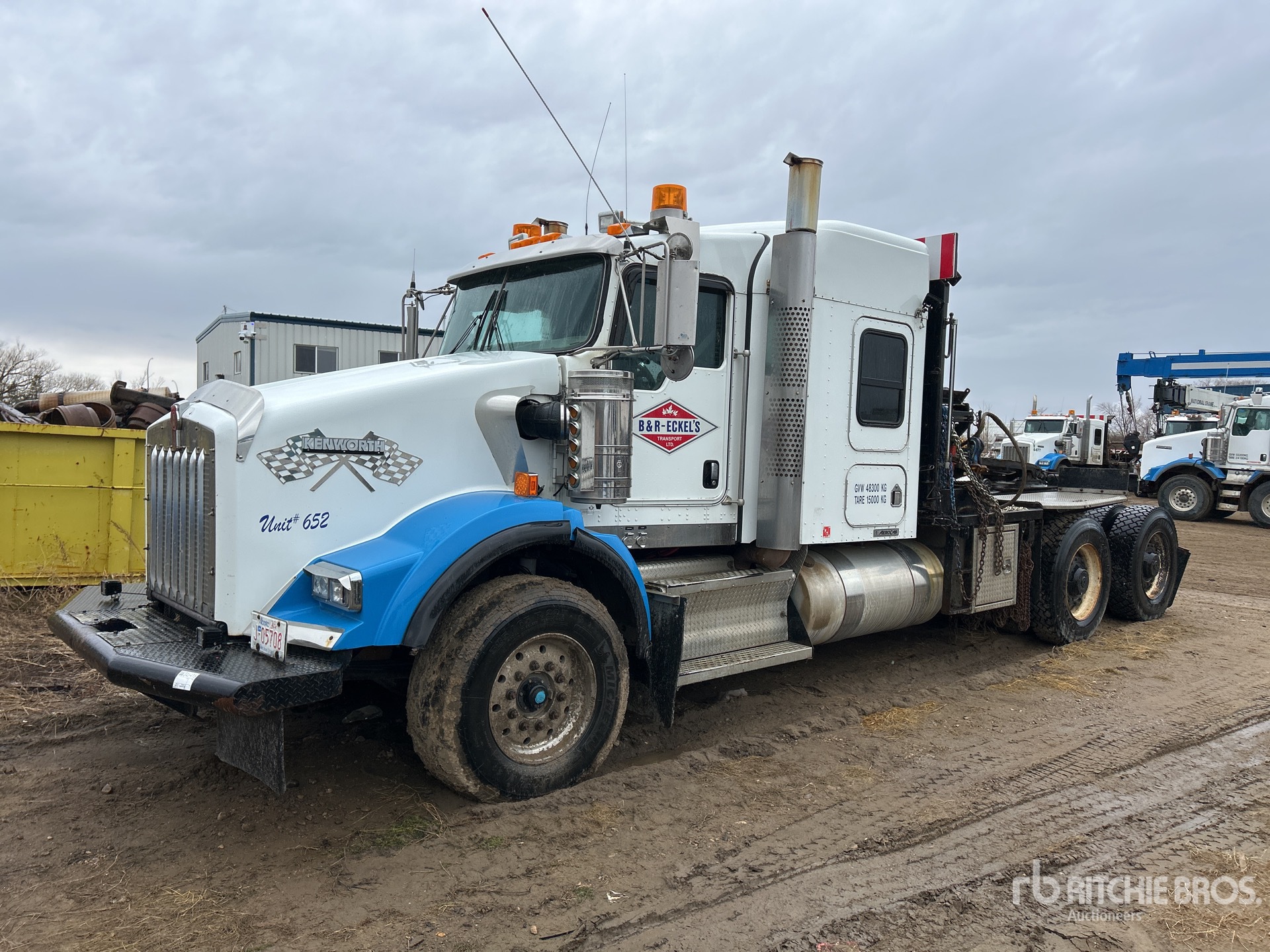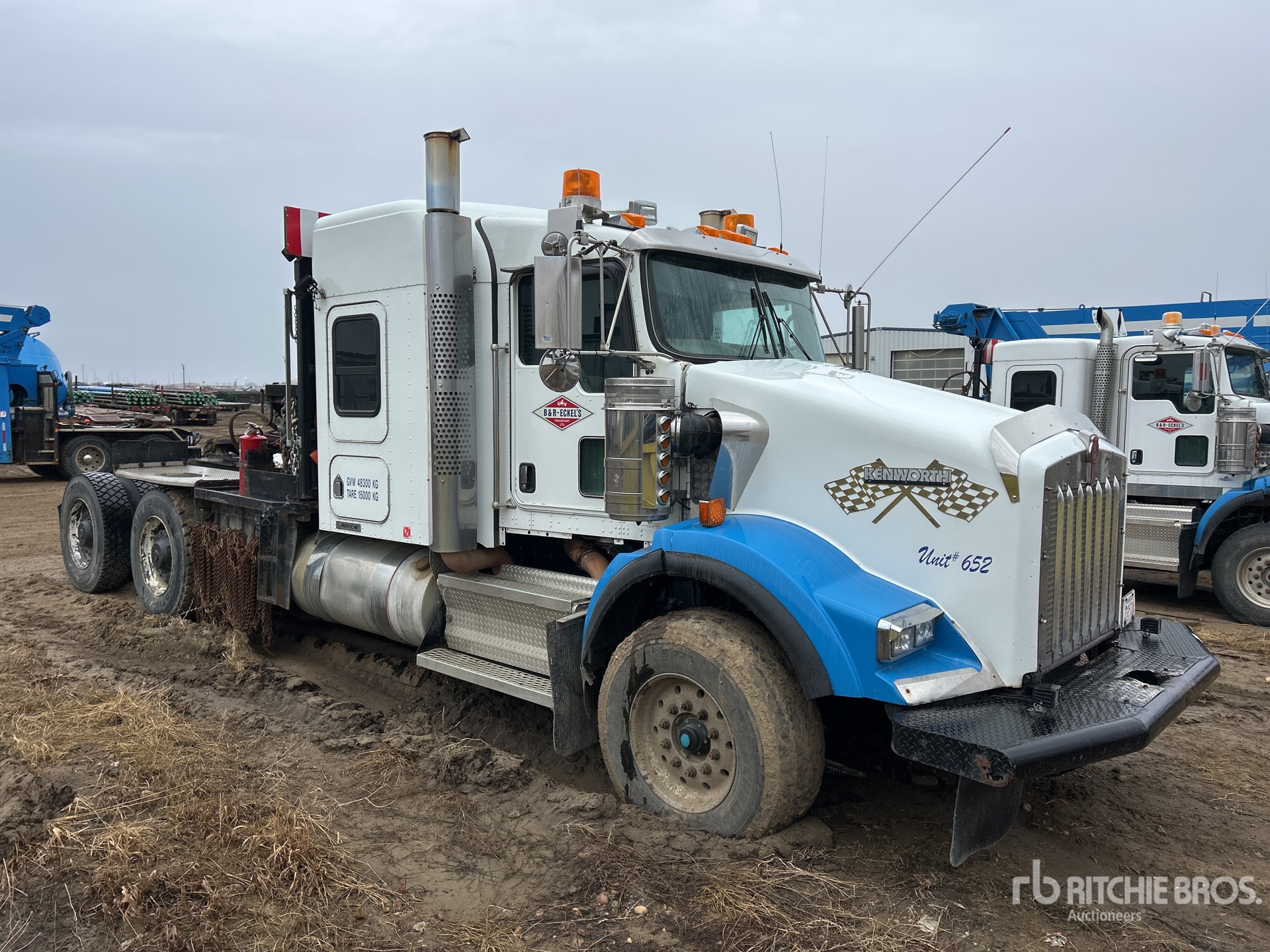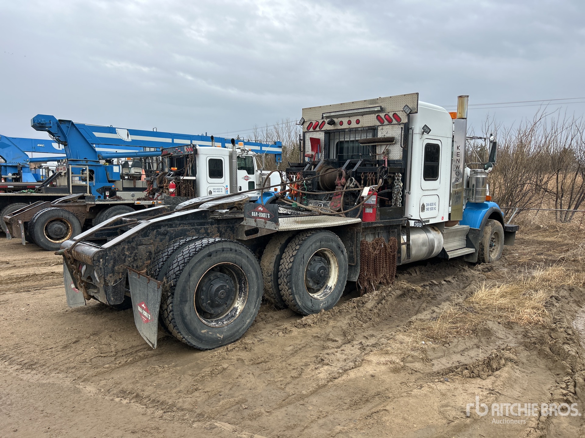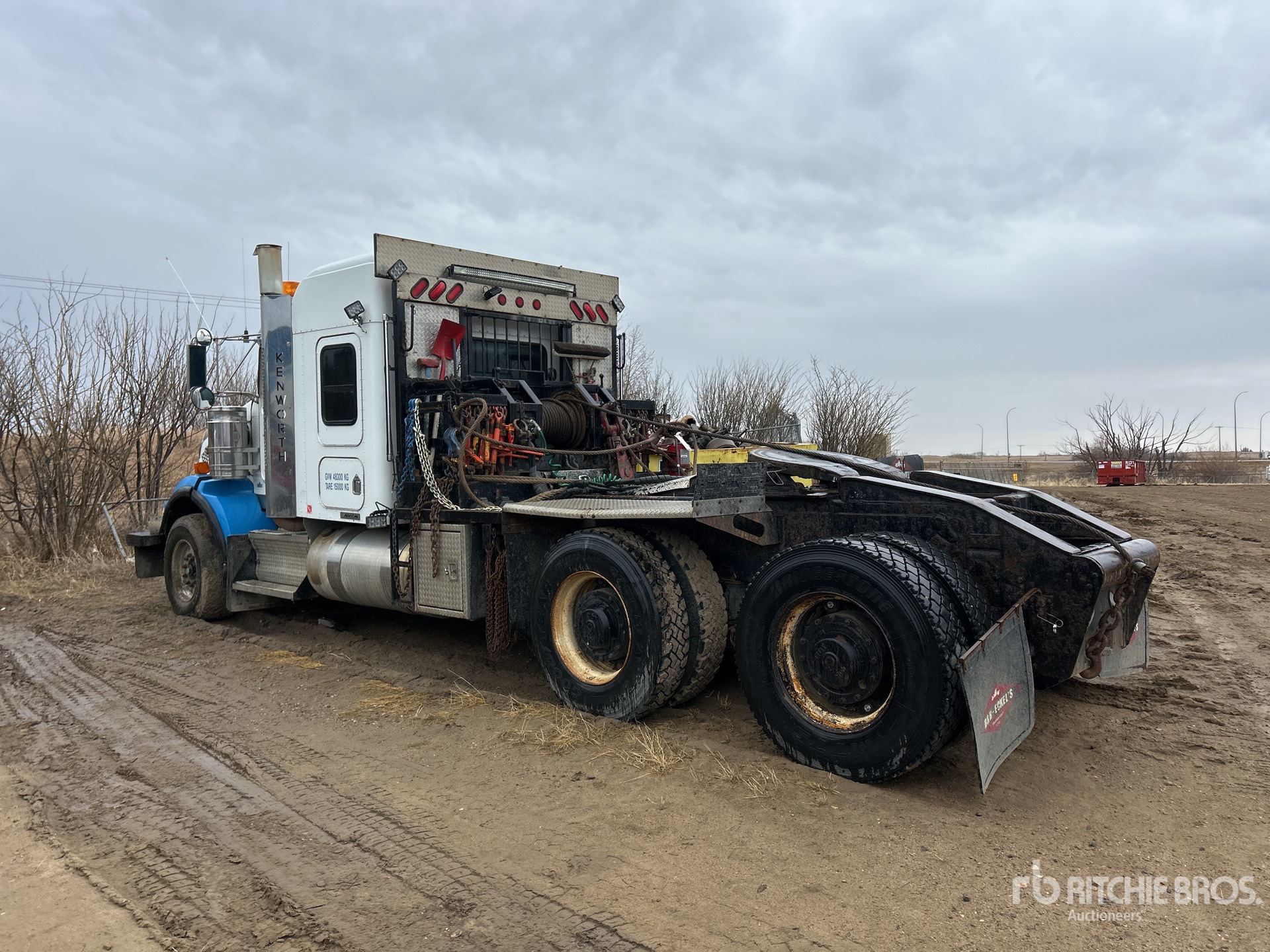 Cat C15 Diesel Engine, Engine Coolant Heater, Positive Air Shutoff, Engine Brake, Eaton Fuller RTLO-18918B 18-Speed Manual Transmission, Double Differential Locks, 16000 lb Front Axle, 46000 lb Rears, Dana D46-170HP Planetary Drive Axles, 4.10:1 Axle Ratio, 62000 lb GVWR, Air Ride Cab, 50 in Mid Roof Sleeper Cab, Aluminum Wheels, 385/65R22.5 Front Tires, 11R24.5 Rear Tires, Neway Air Ride Suspension, 245 in Wheelbase, PTO, Tail Roll, Braden HP75A 75000 lb Winch, Lowboy Ramps, Hydraulic Fifth Wheel