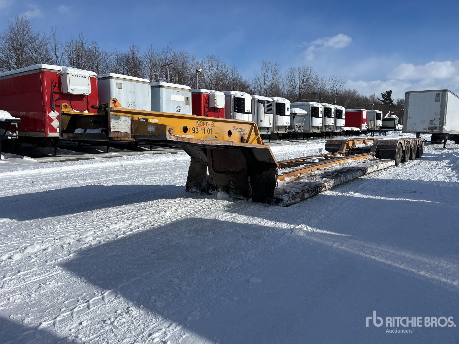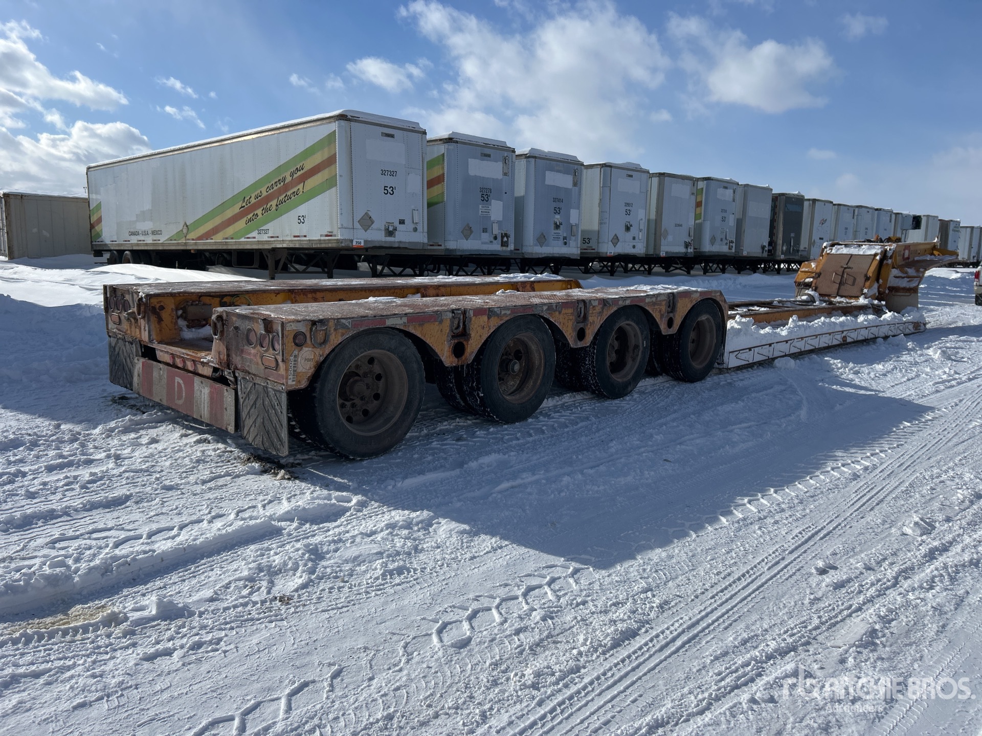 Air Ride Suspension, Hydraulic Removable Gooseneck, 25 ft Main Deck, 18 ft Rear Deck, 114 in Usable Deck Width, 114 in Overall Deck Width, Deck Over Tires, 275/70R22.5 Tires, 88900 kg GVWR
