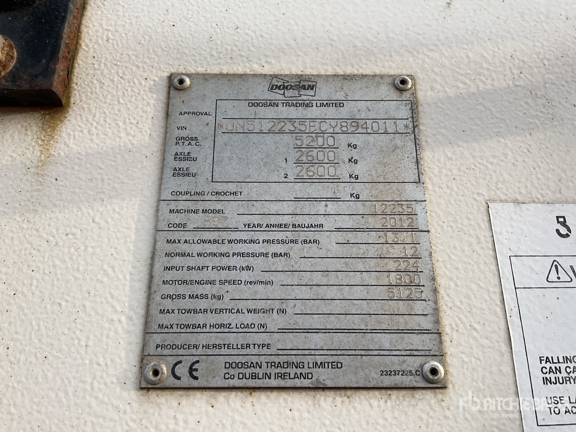 2012 Doosan 2/235 825/170 Mobile Air Compressor