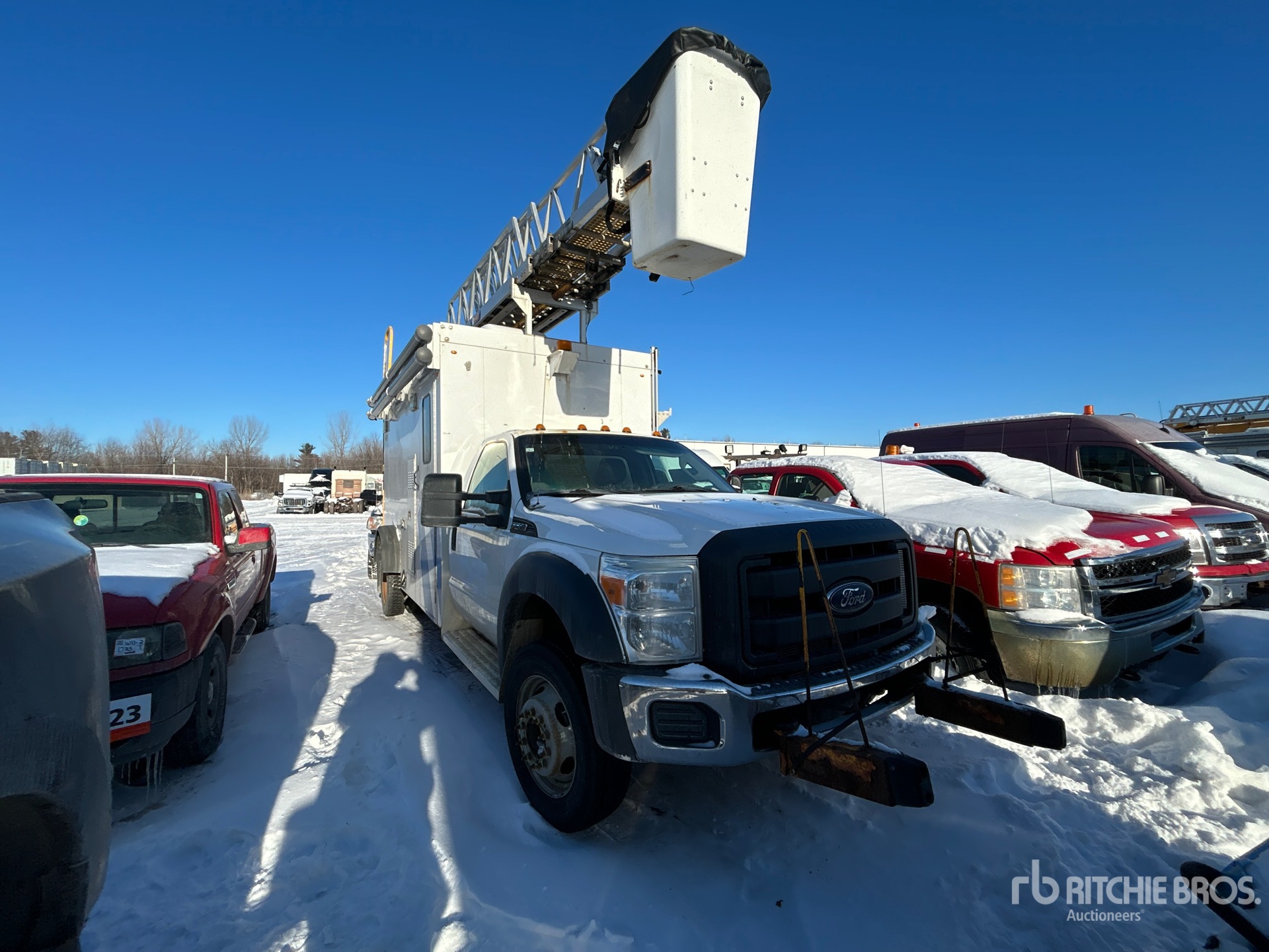 V10 6.8 L Gasoline Engine, 2012 US EPA Label, Automatic Transmission, 6500 lb Front Axle, 14706 lb Rears, 8845 kg GVWR, 225/70R19.5, Spring Suspension, 189 in Wheelbase, 550 lb Capacity, Rear Mounted, One-Person Telescopic Boom, Utility Body, Remote Control w/Cord, 13 ft x 82 in Bed