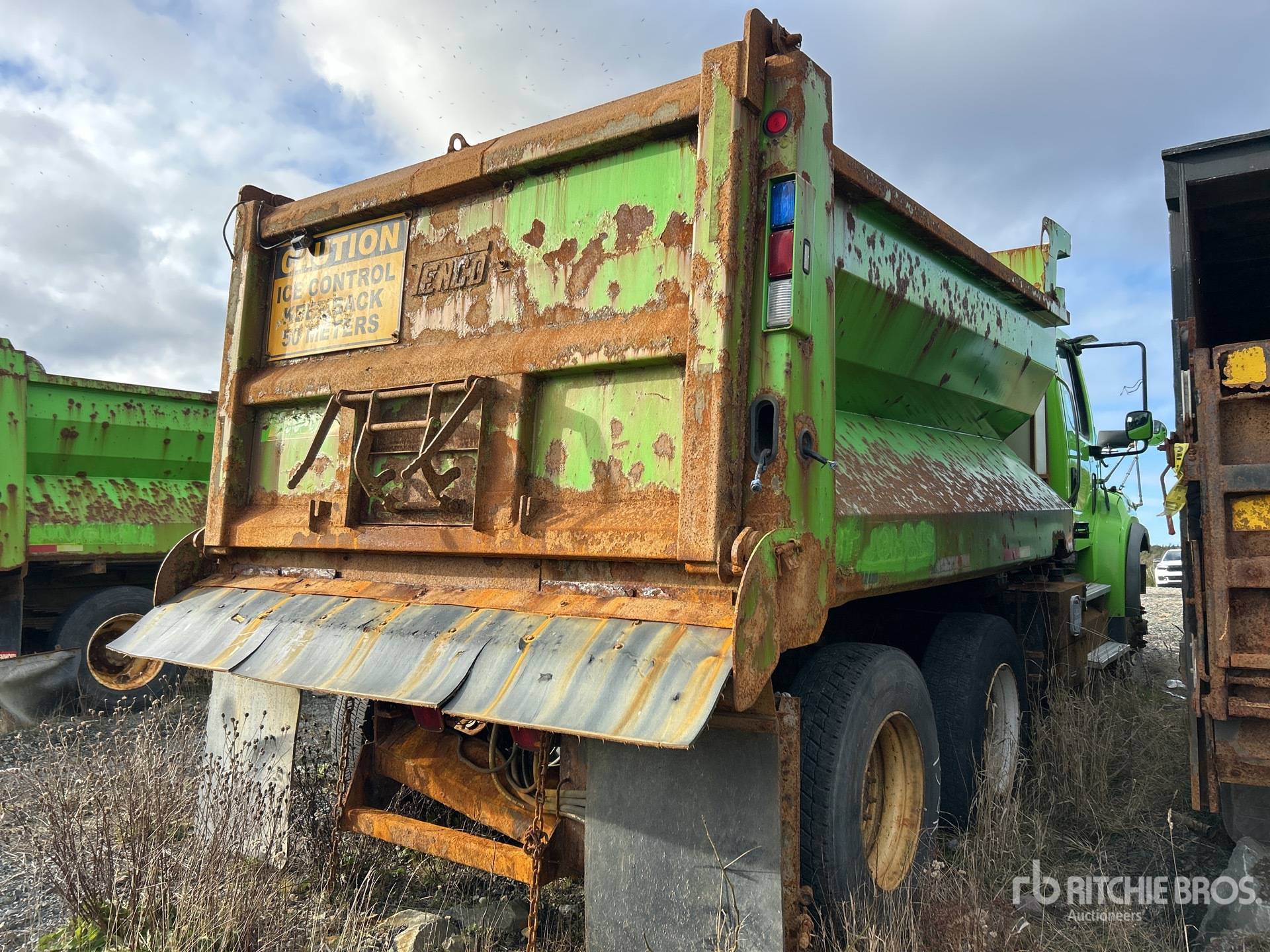 Cummins 6 Cylinder Diesel Engine, Requires Diesel Exhaust Fluid, Allison Automatic Transmission, Differential Lock, 20000 lb Front Axle, 46000 lb Rears, 66000 lb GVWR, Air Ride Cab, 11R22.5, Dual Steering Boxes, Double Frame, Hendrickson Haulmaax Rubber over Walking Beam Suspension, 180 in Wheelbase, PTO, Tenco Poly Spreader, Pre-Wet System, 1 Spinners, In-Cab Controls, 12 ft 6 in Long x 4 ft 6 in High Steel Body, Auto Lube System, Tailgate Chute