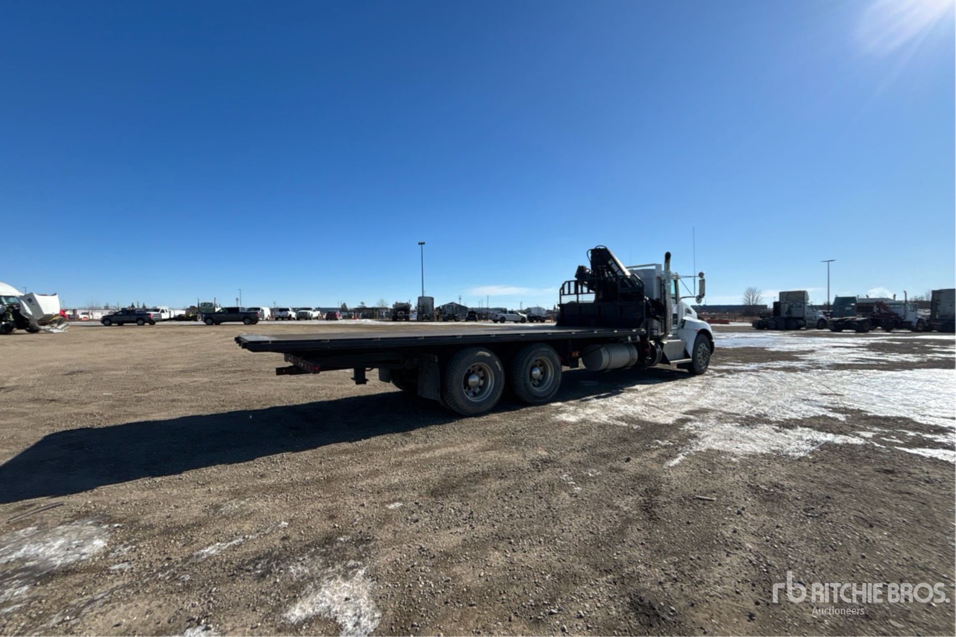 Located in Lane 47 Spot 21, Paccar PX-6 6 Cylinder 6.7 L Diesel 300 hp Engine, 2011 US EPA Label, 8758 Engine hrs, Eaton Fuller FSO6406A 6-Speed Manual Transmission, 14596 lb Front Axle, 39990 lb Rears, Spicer DSP41 Drive Axles, 5.57:1 Axle Ratio, 12R22.5 Front Tires, 11R22.5 Rear Tires, Hendrickson Air Ride Suspension, 256 in Wheelbase, PTO, 2 m - 11.4 m Boom, Out and Down Outriggers, 2005 Hiab O85-B-2 Hydraulic Crane, 24 ft x 96 in Bed